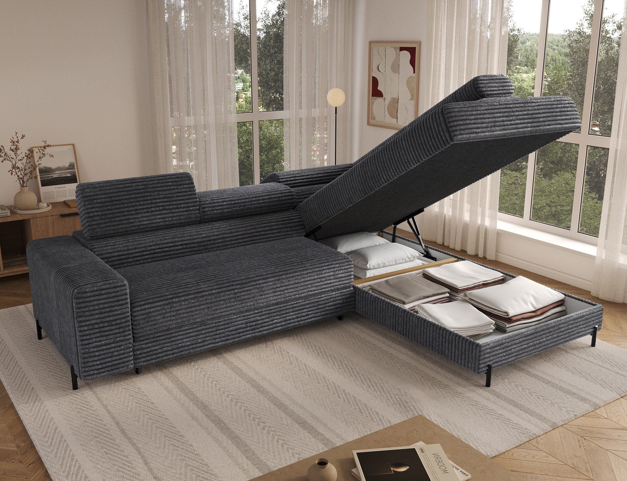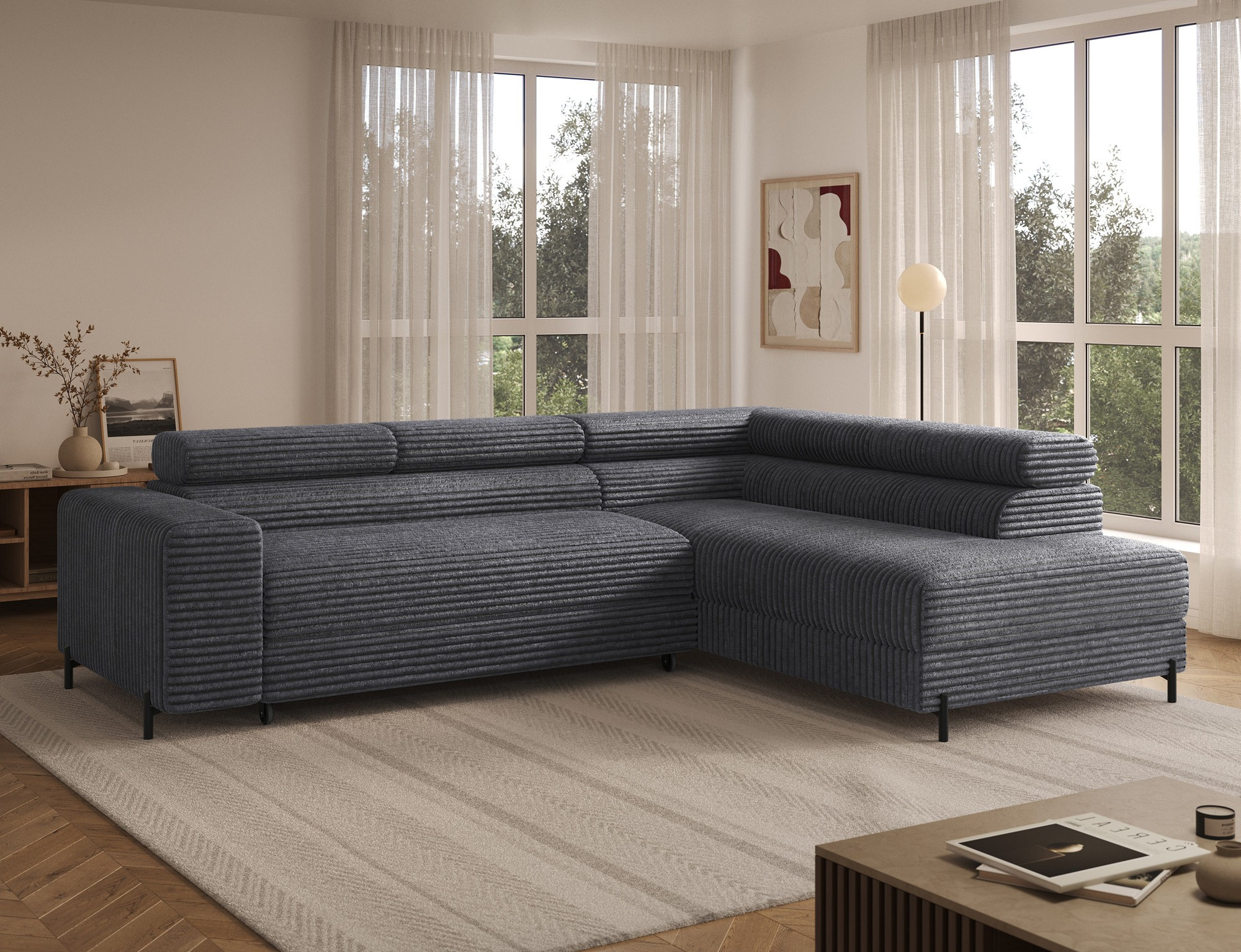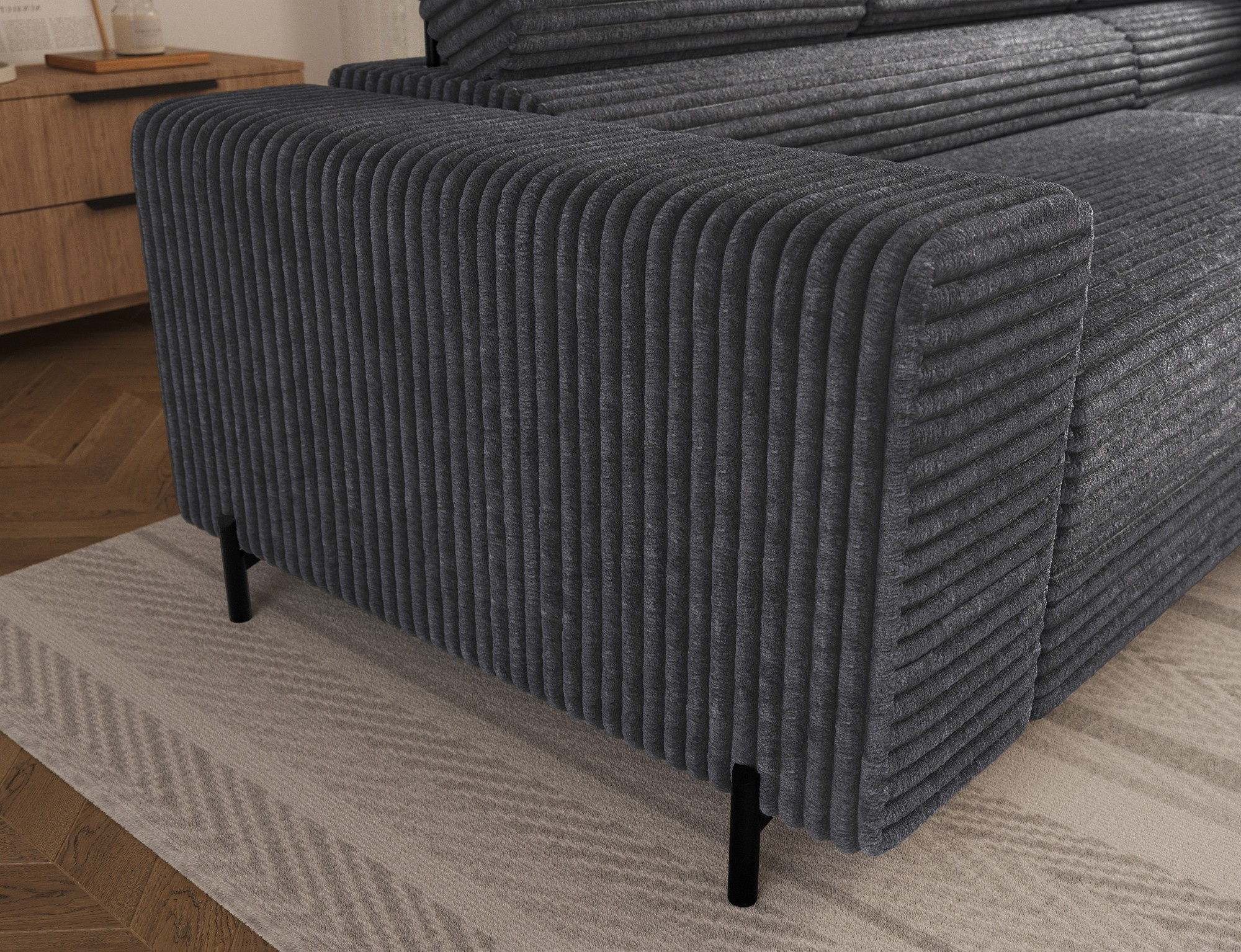 The Colesio corner sofa is a modern and elegant lounge piece with a distinctive, geometric form that perfectly combines design and functionality, making it an ideal addition to a spacious living room. The model, measuring 274 x 200 x 93 cm and weighing 144.5 kg, stands out with its solid construction and carefully refined details that ensure high comfort for everyday use. The seat is equipped with a B-type wave spring and a combination of T3030 foam (6 cm) and HR3030 foam (4 cm), guaranteeing optimal elasticity, resistance to deformation, and comfort even during intensive use. The backrest, filled with profiled T2130 polyurethane foam approximately 8 cm thick, provides stable and ergonomic back support. The Colesio corner sofa features a practical sleeping function with a surface of 124 x 203 cm, and the Delfin mechanism allows for quick and convenient unfolding. An additional advantage is the spacious bedding container measuring 180 × 92 × 17 cm, which facilitates textile storage, making the Colesio corner sofa an excellent choice for those seeking a modern corner sofa with a sleeping function, bedding storage, and durable, comfortable filling for everyday relaxation.