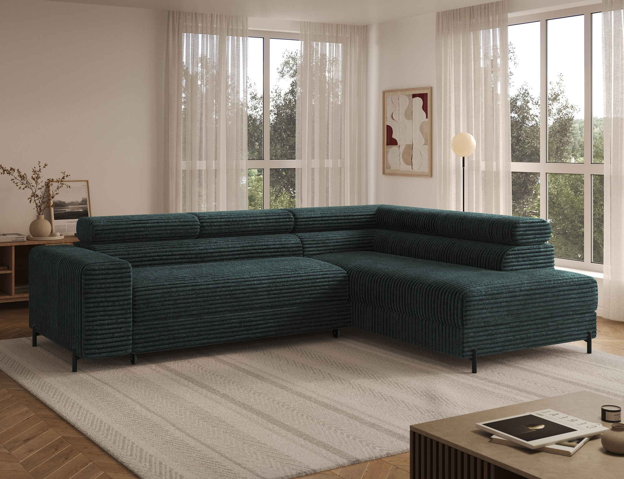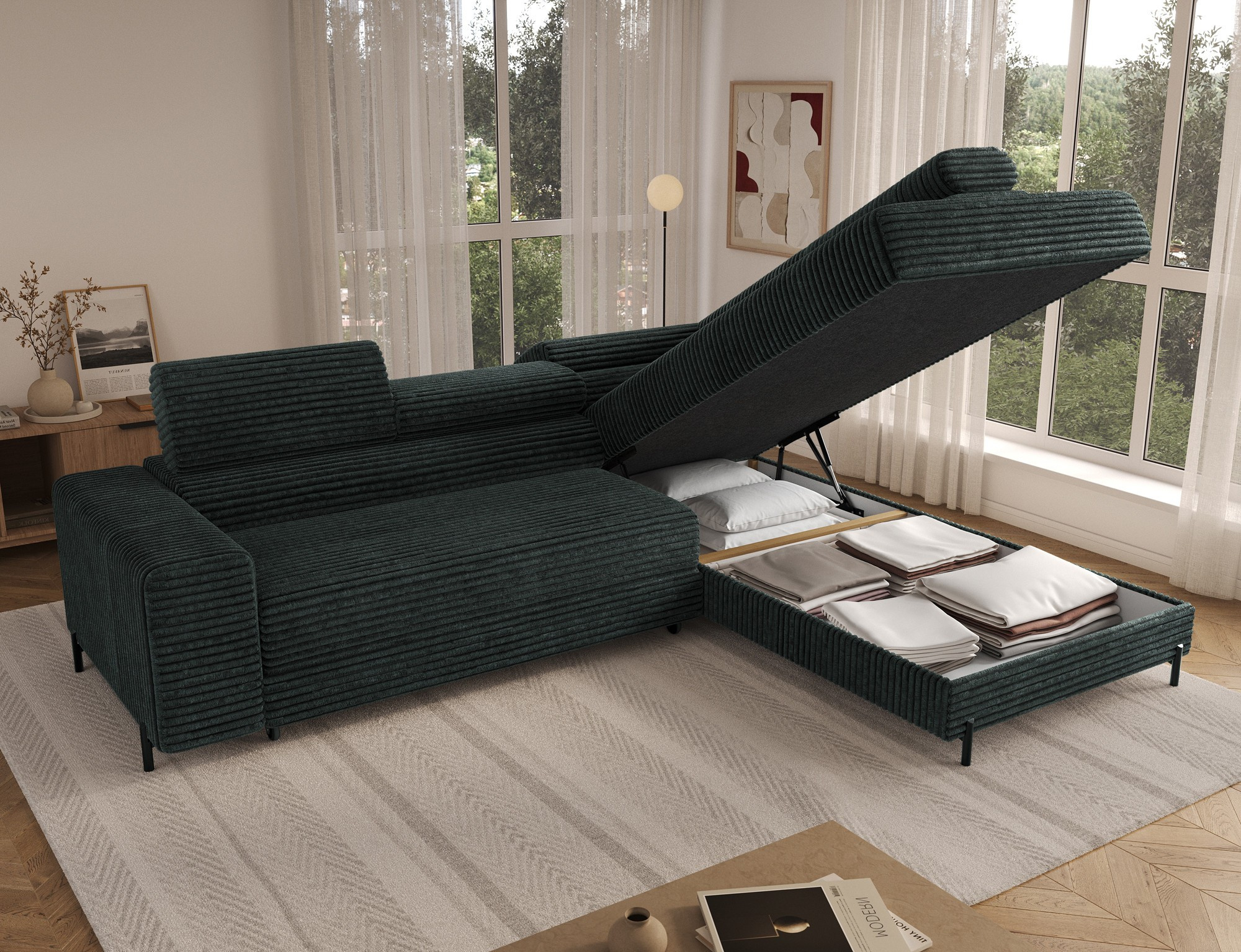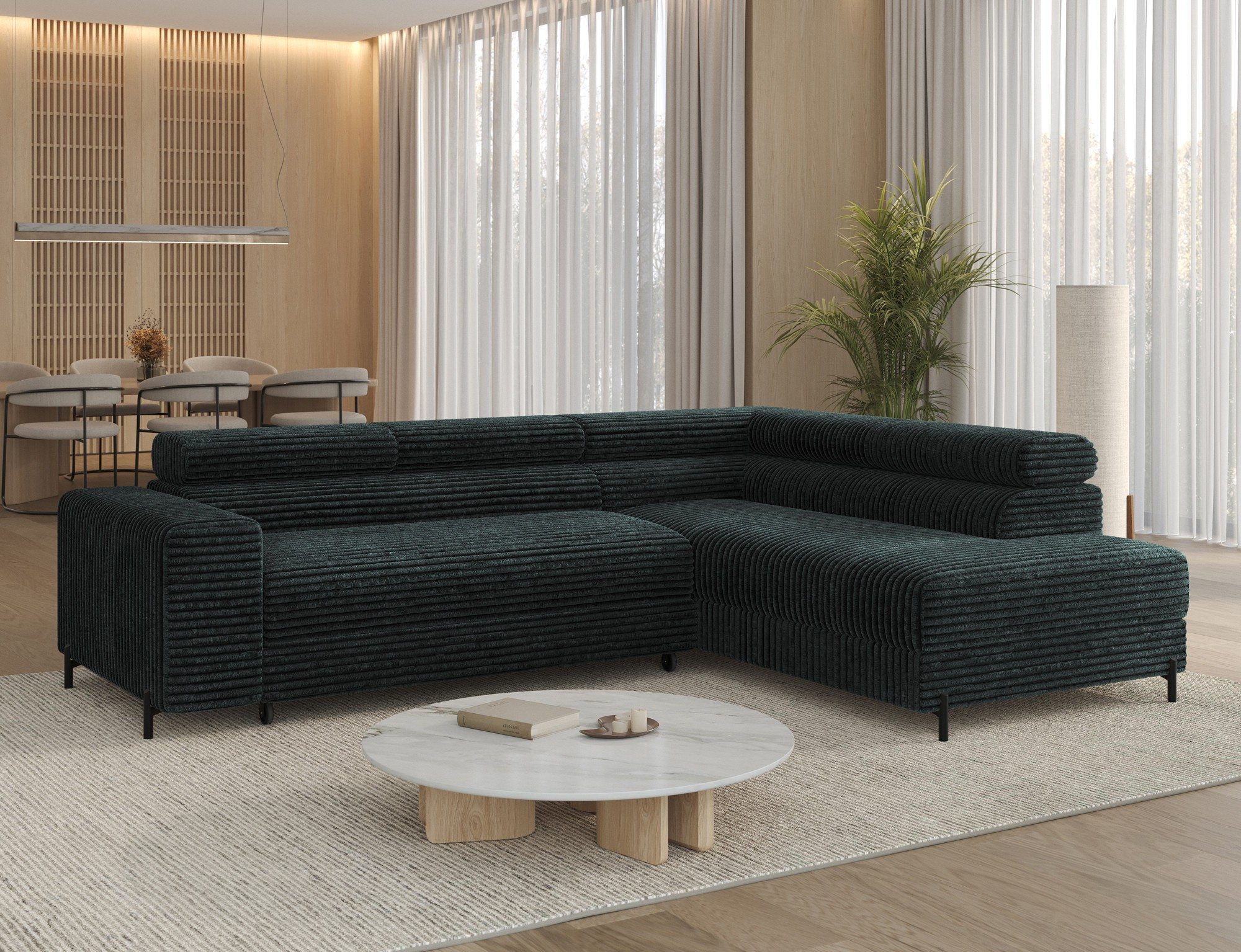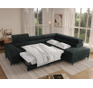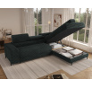 The Colesio corner sofa is a modern and elegant lounge piece with a distinctive, geometric form that perfectly combines design and functionality, making it an ideal addition to a spacious living room. The model, measuring 274 x 200 x 93 cm and weighing 144.5 kg, stands out with its solid construction and carefully refined details that ensure high comfort for everyday use. The seat is equipped with a B-type wave spring and a combination of T3030 foam (6 cm) and HR3030 foam (4 cm), guaranteeing optimal elasticity, resistance to deformation, and comfort even during intensive use. The backrest, filled with profiled T2130 polyurethane foam approximately 8 cm thick, provides stable and ergonomic back support. The Colesio corner sofa features a practical sleeping function with a surface of 124 x 203 cm, and the Delfin mechanism allows for quick and convenient unfolding. An additional advantage is the spacious bedding container measuring 180 × 92 × 17 cm, which facilitates textile storage, making the Colesio corner sofa an excellent choice for those seeking a modern corner sofa with a sleeping function, bedding storage, and durable, comfortable filling for everyday relaxation.