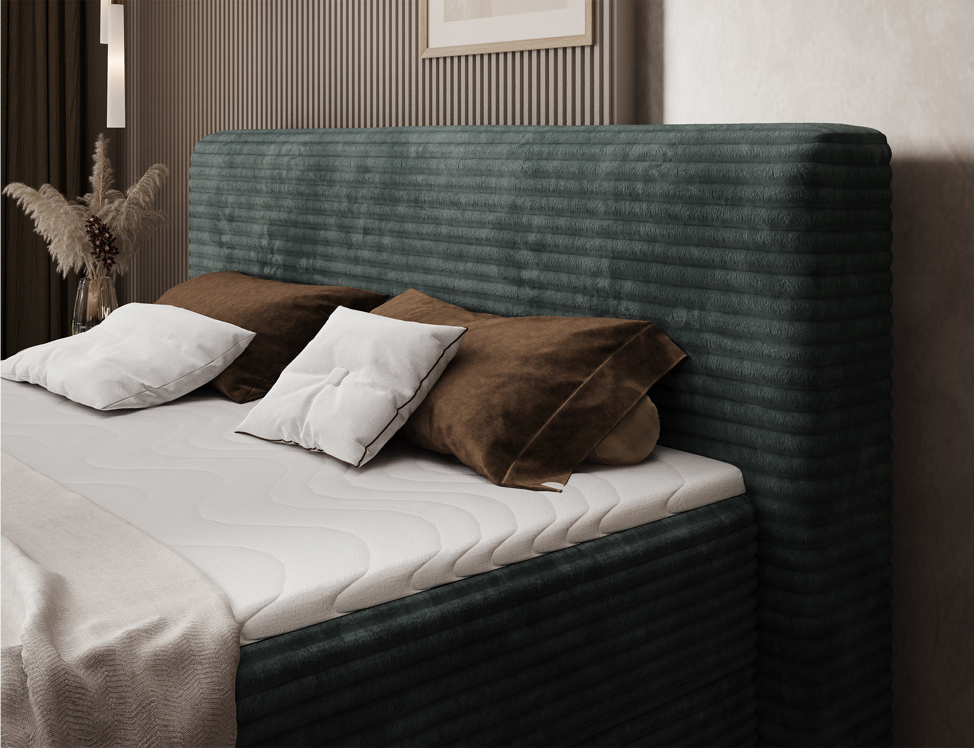 Kontinentální postel Cortiko je elegantní a pohodlnou volbou pro milovníky moderního stylu. Dostupné ve třech velikostních variantách: 140x200 cm, 160x200 cm a 180x200 cm, umožňuje dokonale přizpůsobit šířku vašim potřebám – 162 cm, 182 cm nebo 202 cm. Celková výška postele je 102 cm a hloubka je 222 cm, což dává konstrukci stabilní a vyvážený vzhled. Uvnitř kombinace Bonellových pružin a pěny T2540 zajišťuje vynikající podporu těla a vysoký spací komfort. Model Cortiko je vybaven praktickým úložným prostorem na lůžkoviny, který vám umožní udržet ložnici uklizenou a maximálně využít váš prostor. Design je doplněn černými dřevěnými nohami nábytku, které přidávají eleganci a lehkost. Se svým moderním designem postel Cortiko dokonale doplňuje jak minimalistické, tak výraznější interiéry a slouží jako stylový a funkční středobod každé ložnice.