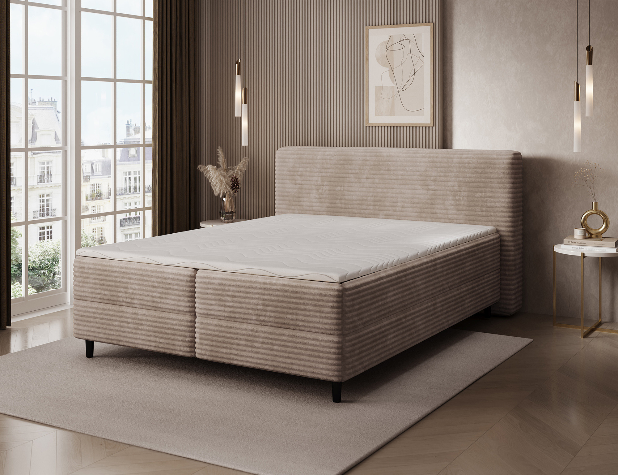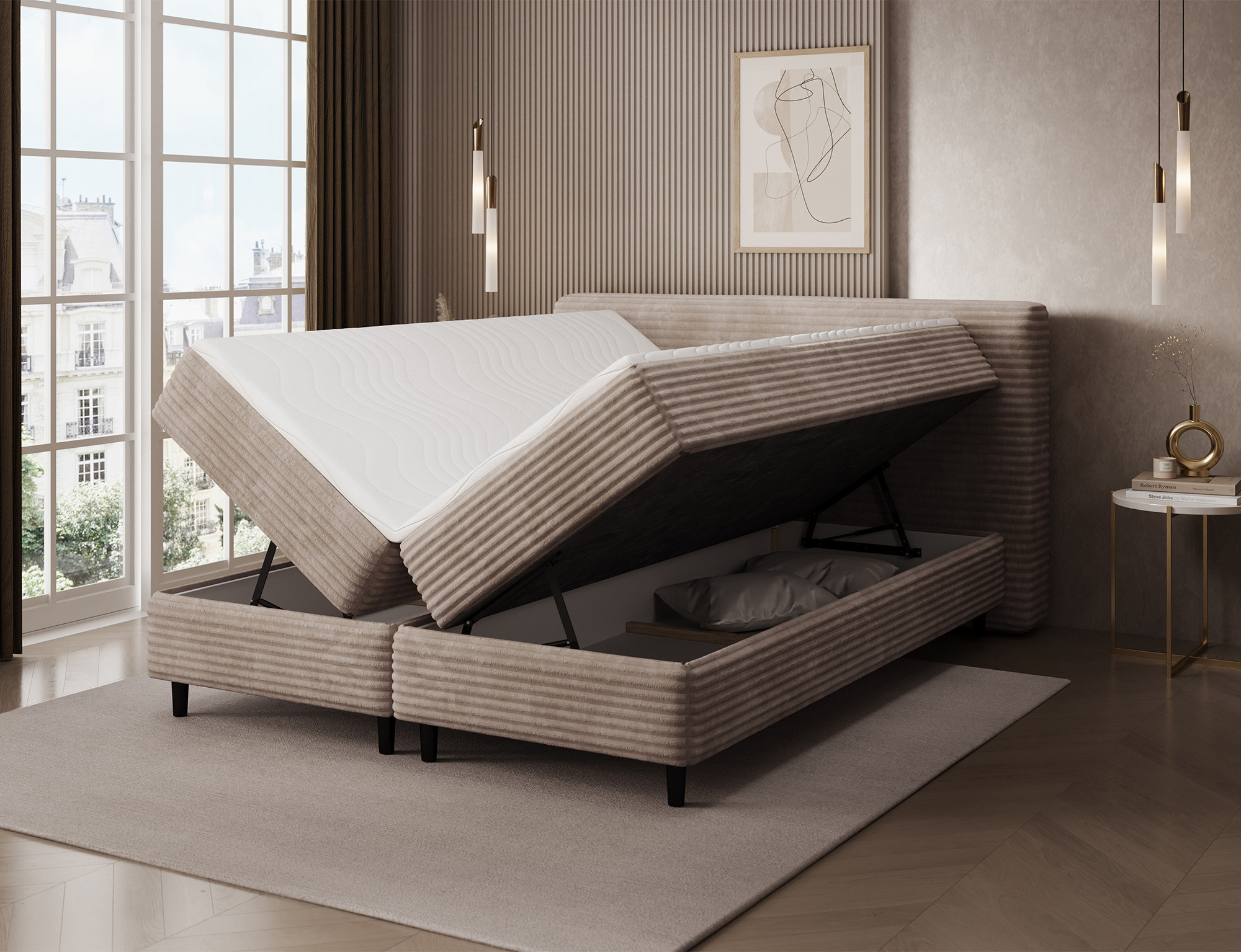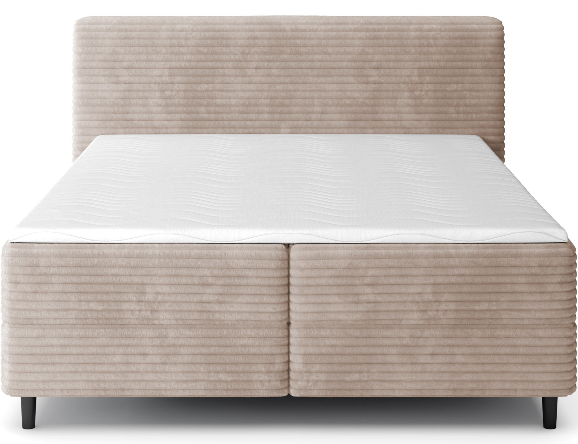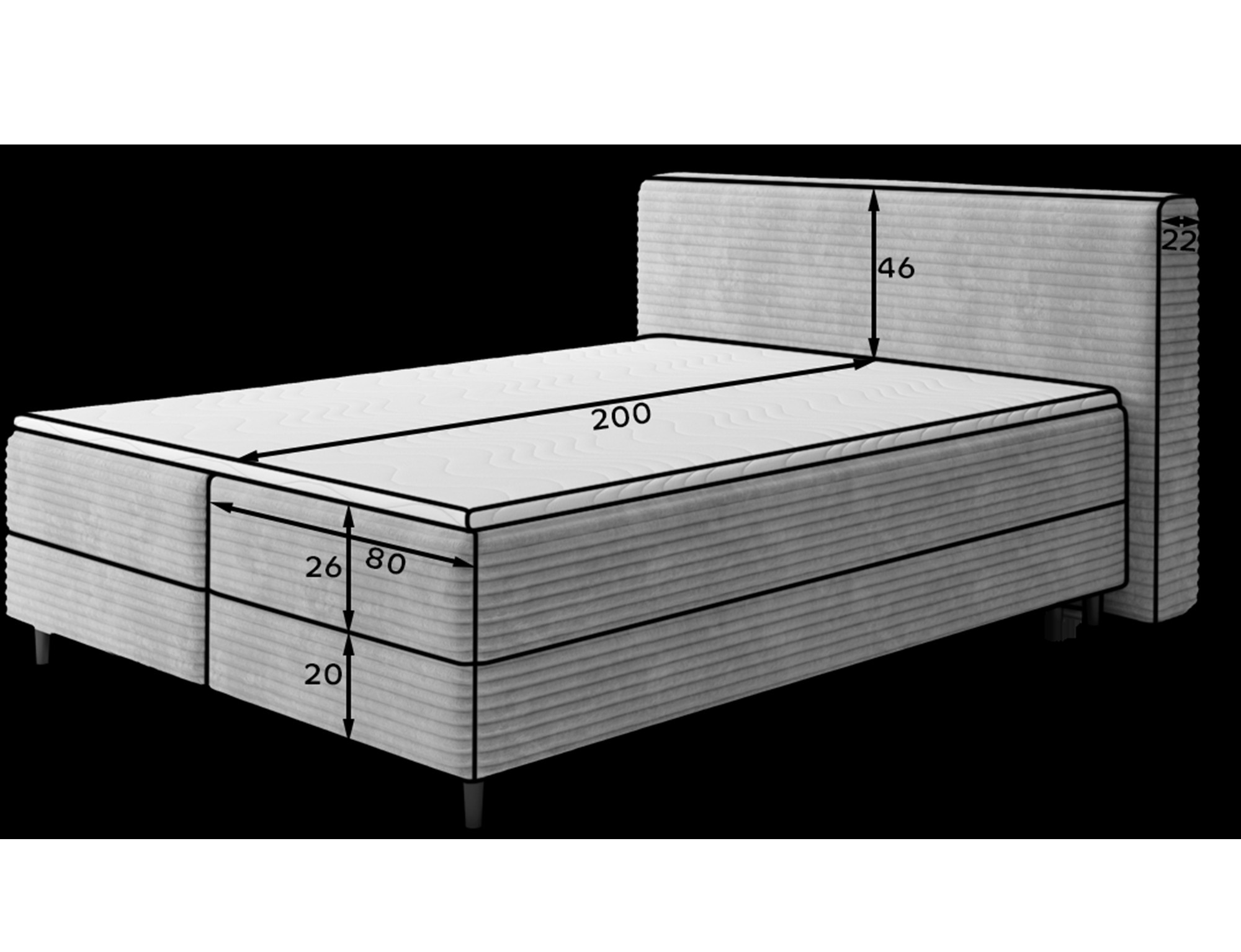 Kontinentální postel Cortiko je elegantní a pohodlnou volbou pro milovníky moderního stylu. Dostupné ve třech velikostních variantách: 140x200 cm, 160x200 cm a 180x200 cm, umožňuje dokonale přizpůsobit šířku vašim potřebám – 162 cm, 182 cm nebo 202 cm. Celková výška postele je 102 cm a hloubka je 222 cm, což dává konstrukci stabilní a vyvážený vzhled. Uvnitř kombinace Bonellových pružin a pěny T2540 zajišťuje vynikající podporu těla a vysoký spací komfort. Model Cortiko je vybaven praktickým úložným prostorem na lůžkoviny, který vám umožní udržet ložnici uklizenou a maximálně využít váš prostor. Design je doplněn černými dřevěnými nohami nábytku, které přidávají eleganci a lehkost. Se svým moderním designem postel Cortiko dokonale doplňuje jak minimalistické, tak výraznější interiéry a slouží jako stylový a funkční středobod každé ložnice.