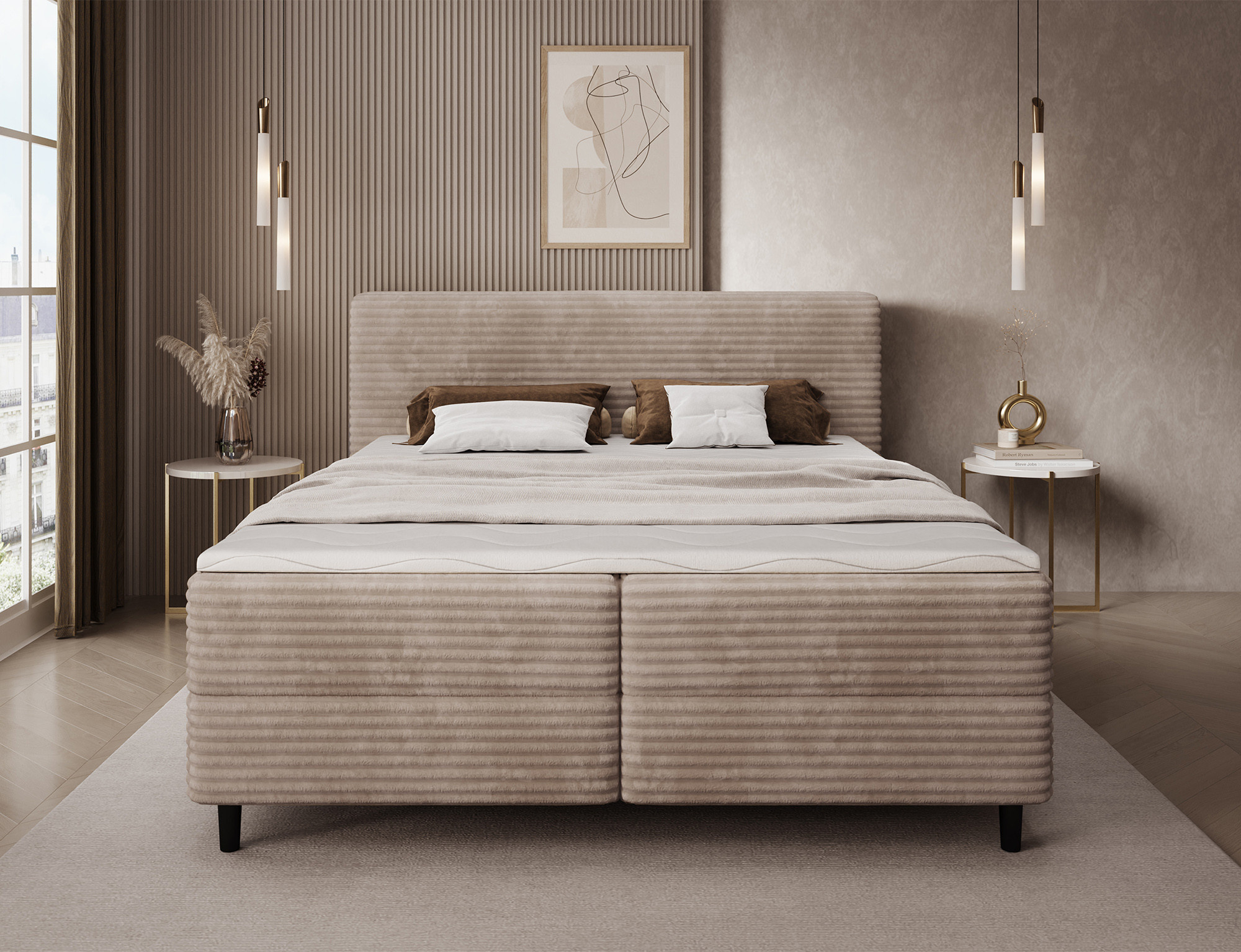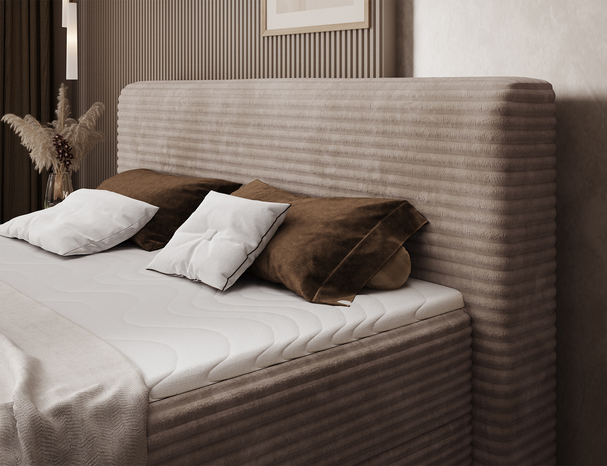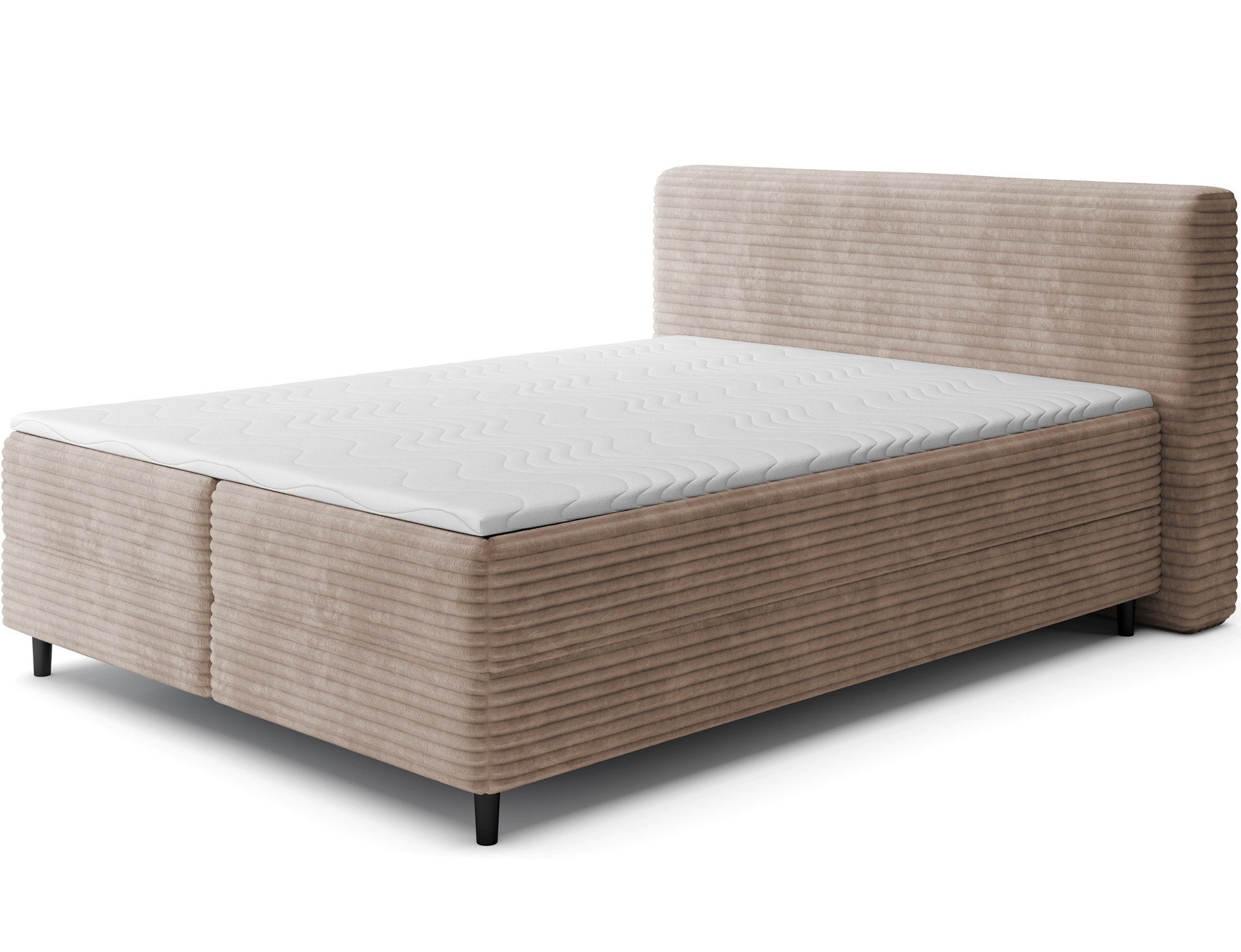 Kontinentální postel Cortiko je elegantní a pohodlnou volbou pro milovníky moderního stylu. Dostupné ve třech velikostních variantách: 140x200 cm, 160x200 cm a 180x200 cm, umožňuje dokonale přizpůsobit šířku vašim potřebám – 162 cm, 182 cm nebo 202 cm. Celková výška postele je 102 cm a hloubka je 222 cm, což dává konstrukci stabilní a vyvážený vzhled. Uvnitř kombinace Bonellových pružin a pěny T2540 zajišťuje vynikající podporu těla a vysoký spací komfort. Model Cortiko je vybaven praktickým úložným prostorem na lůžkoviny, který vám umožní udržet ložnici uklizenou a maximálně využít váš prostor. Design je doplněn černými dřevěnými nohami nábytku, které přidávají eleganci a lehkost. Se svým moderním designem postel Cortiko dokonale doplňuje jak minimalistické, tak výraznější interiéry a slouží jako stylový a funkční středobod každé ložnice.