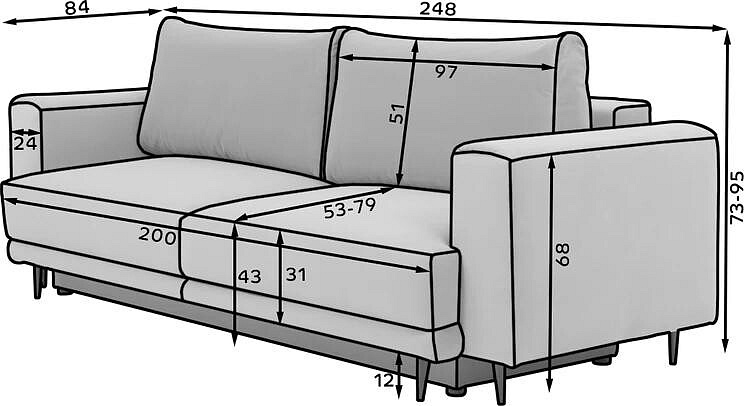 - Prostorné rozměry: S šířkou 248 cm, maximální výškou 95 cm a hloubkou 84 cm poskytuje dostatek prostoru pro pohodlné sezení i ležení. Výška sedu 43 cm zajišťuje komfortní posezení pro každého člena rodiny.