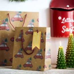 Dárková taška CYMKA má krásný sváteční vzor zobrazující typické vánoční téma v červených autech s vánočními stromky a dárky na střeše. Pozadí je zlaté a zdobené bílými sněhovými vločkami a červenými hvězdami. Taška je vybavena vínovými šňůrkami, které slouží jako držadla. Ke šňůrce je připevněna zlatá papírová krabička s nápisem Veselé Vánoce, na kterou můžete napsat jméno obdarovaného, aby si snadno našel svůj dárek pod vánočním stromkem.