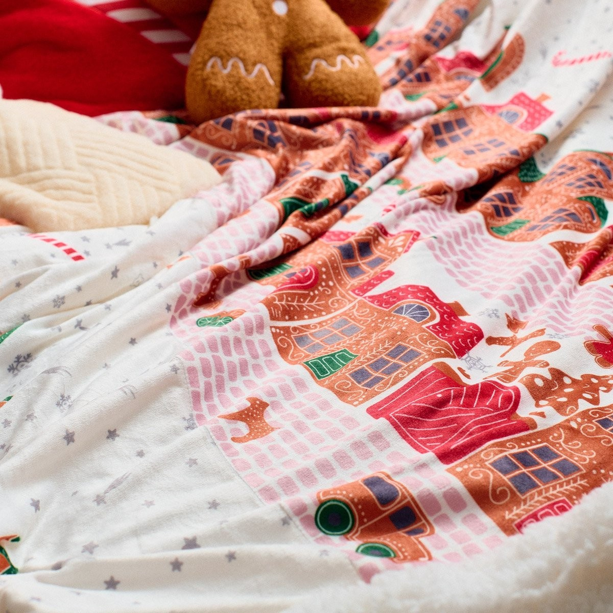 Vánoční deka s perníkovými chaloupkami a sherpa