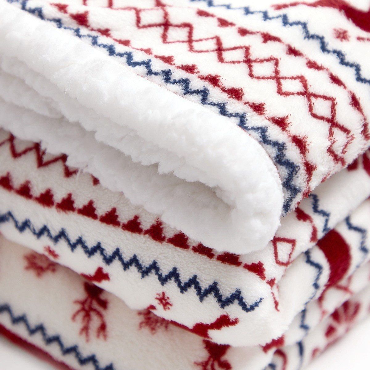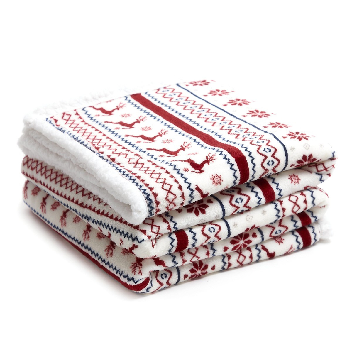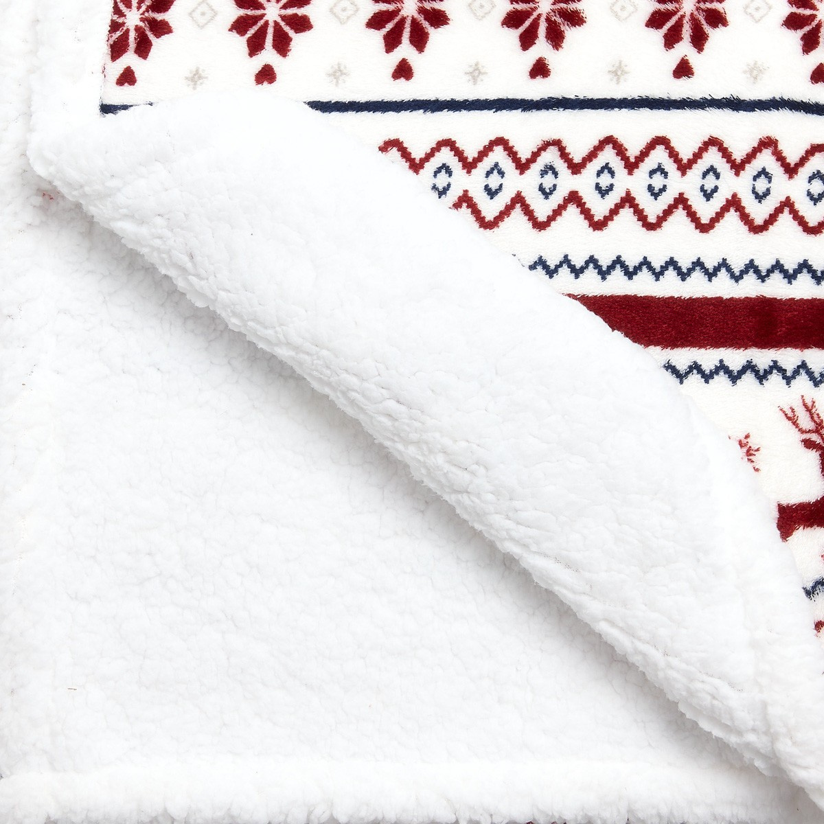 Přední strana deky je ozdobena svátečním vzorem červených sobů a sněhových vloček, které nádherně kontrastují s bílým pozadím. Spodní strana deky je pokryta huňatou jehněčí kůží, která hřeje stejně jako vlna a je také příjemná na dotek. To je dokonalý doplněk do vašeho interiéru na Vánoce.Účel