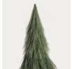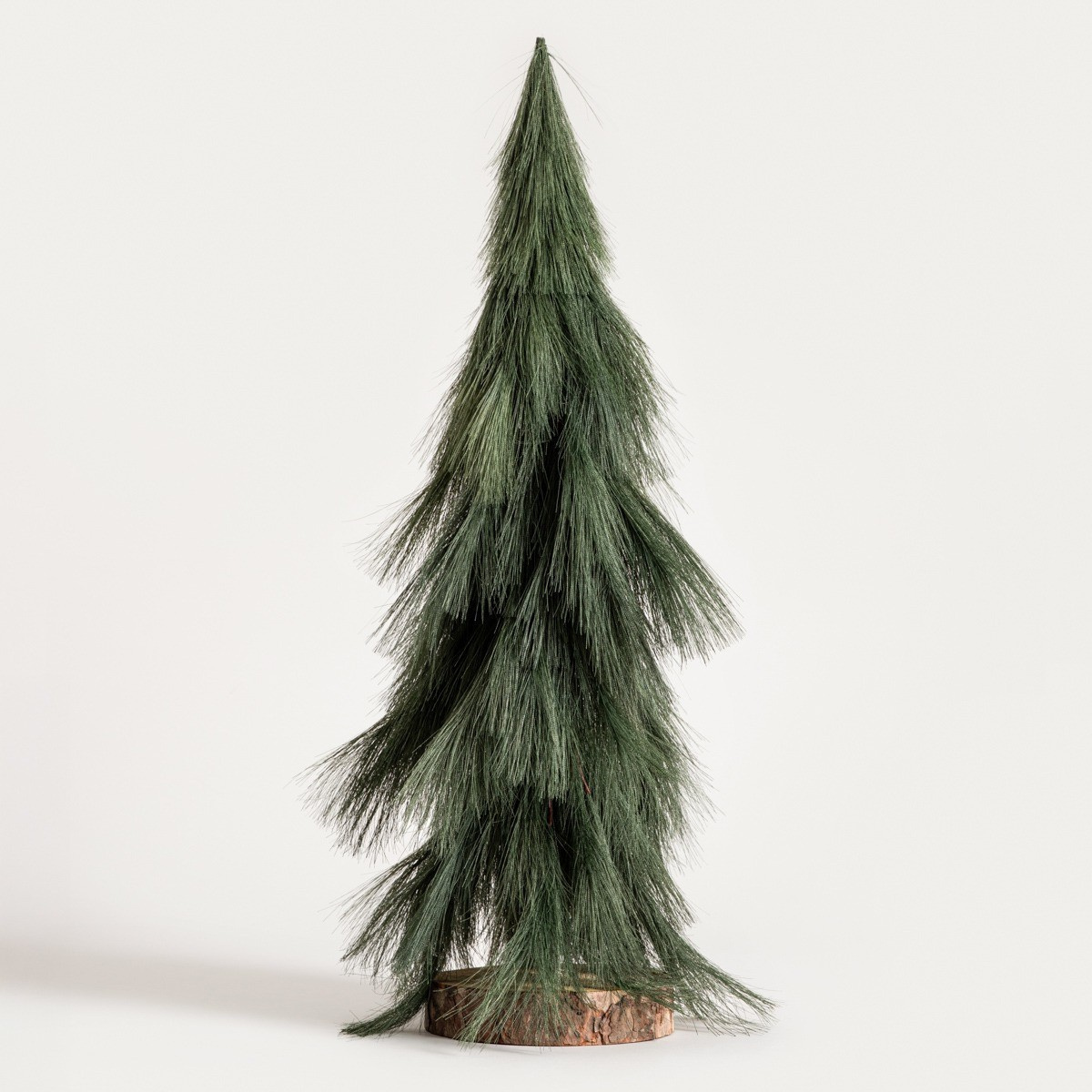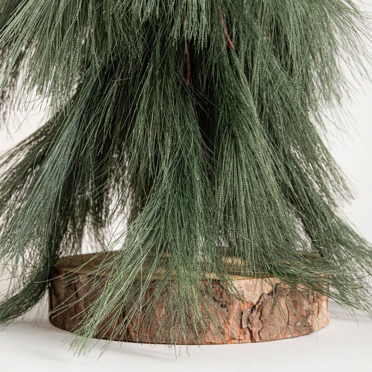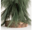 Vánoční strom má originální texturu s dlouhými, visícími větvemi a je umístěn na dřevěném disku. Umělý strom v zelené barvě je nadčasovou dekorací na Vánoce. Přirozený vzhled a dřevěný prvek dodávají vánočnímu stromku rustikální nádech.