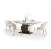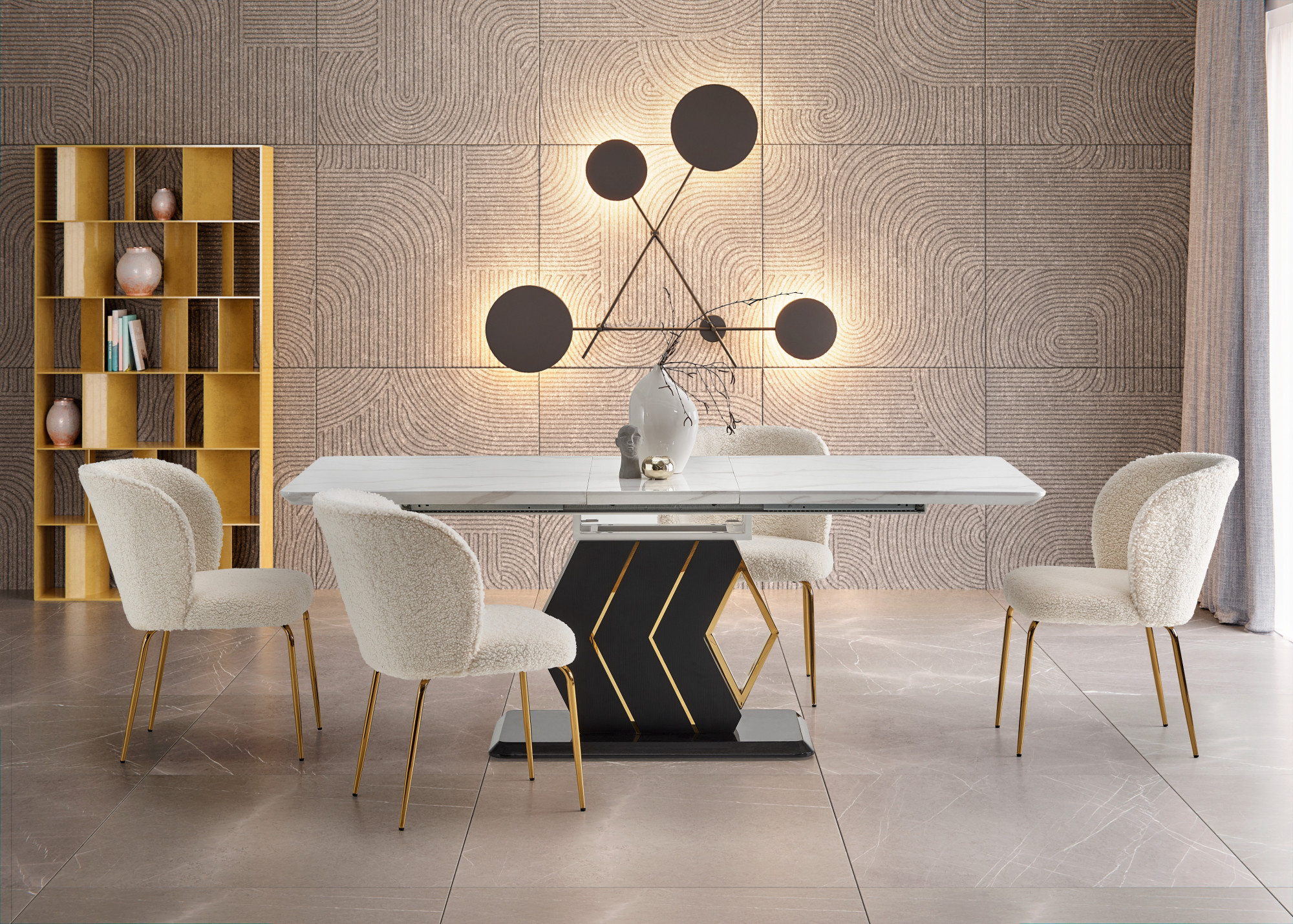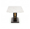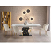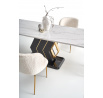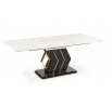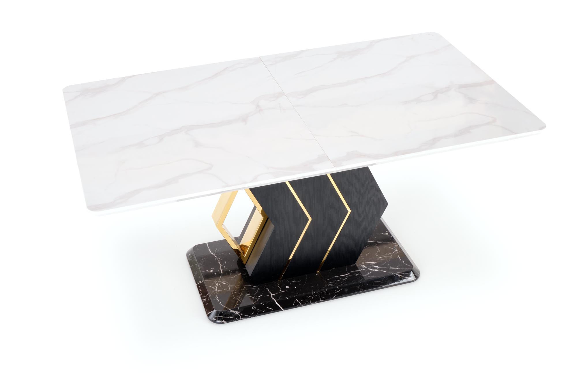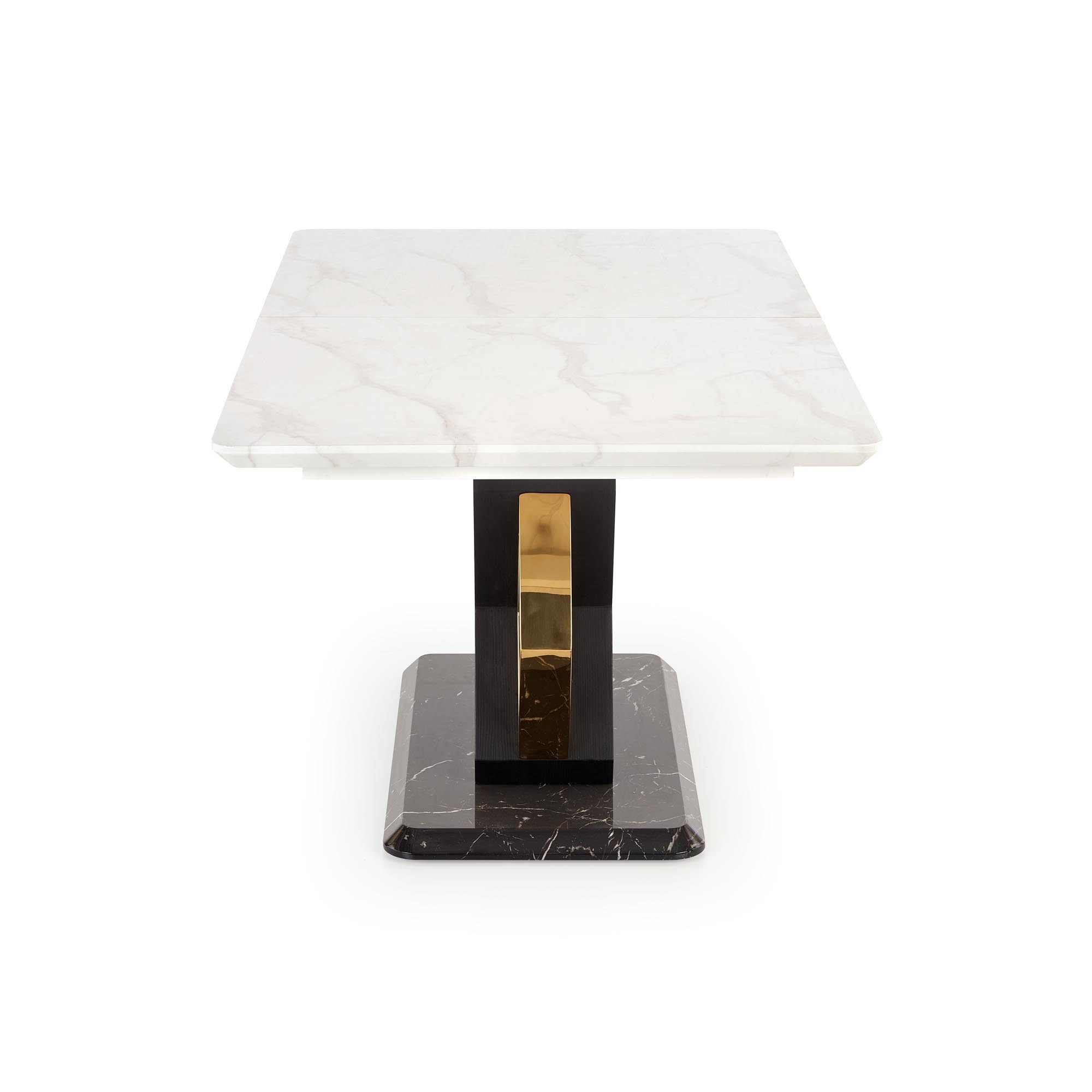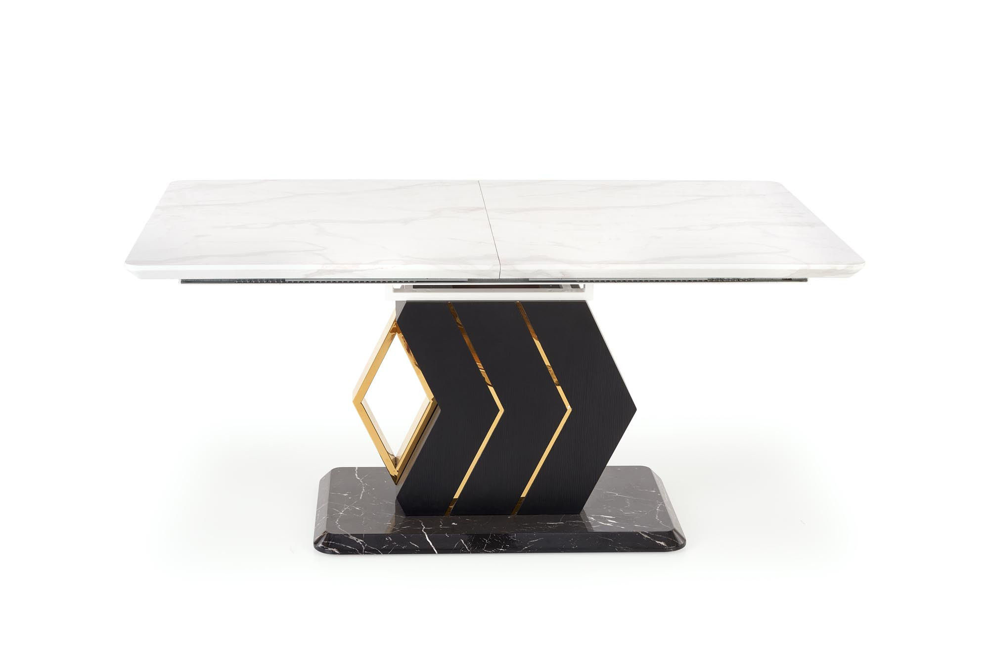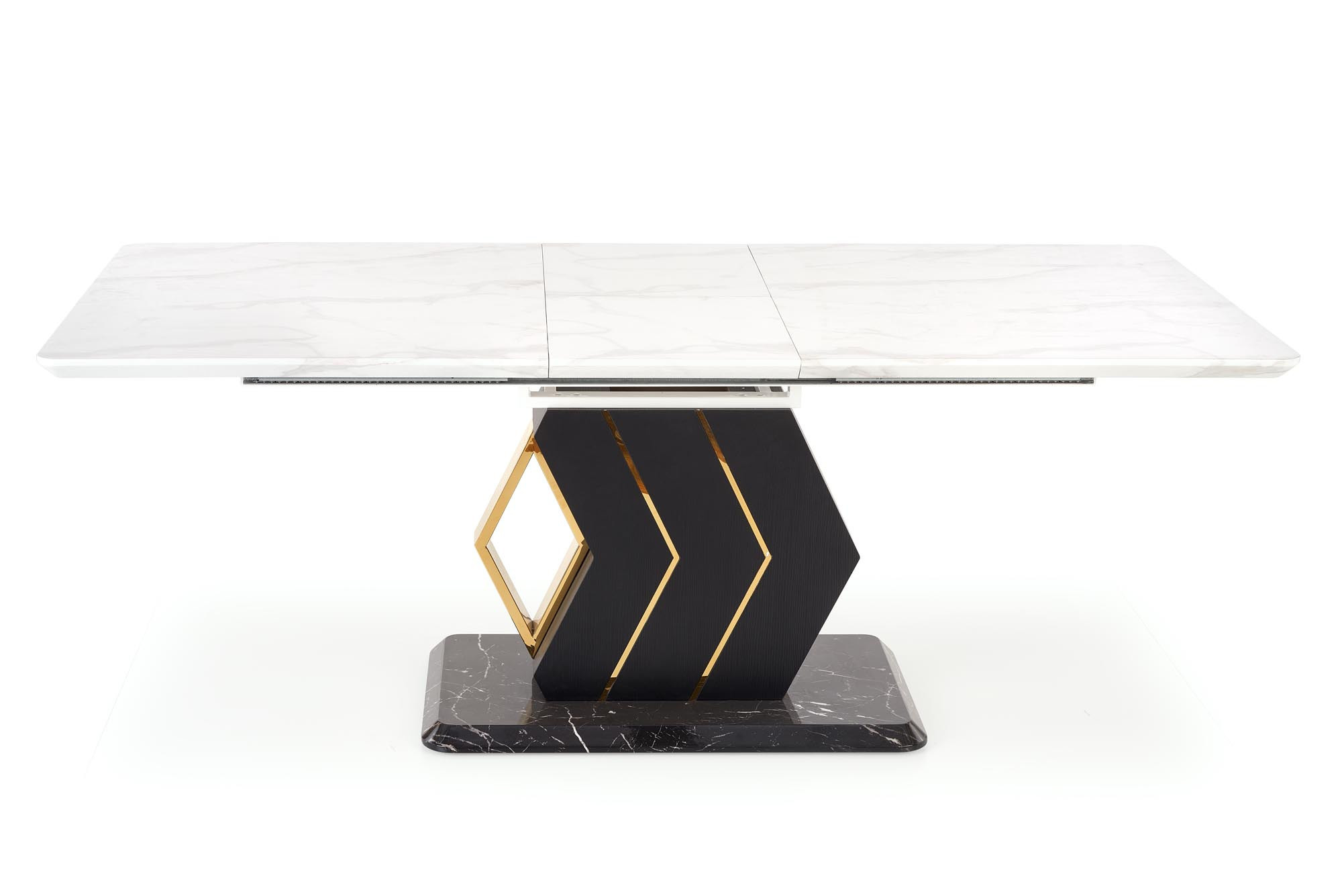 rozměry: 160-200/90/77 cm, rozkládací stůl, materiál: MDF dýhovaná / MDF lakovaná / chromovaná ocel, barva: deska - bílý mramor, noha - černá / zlatá