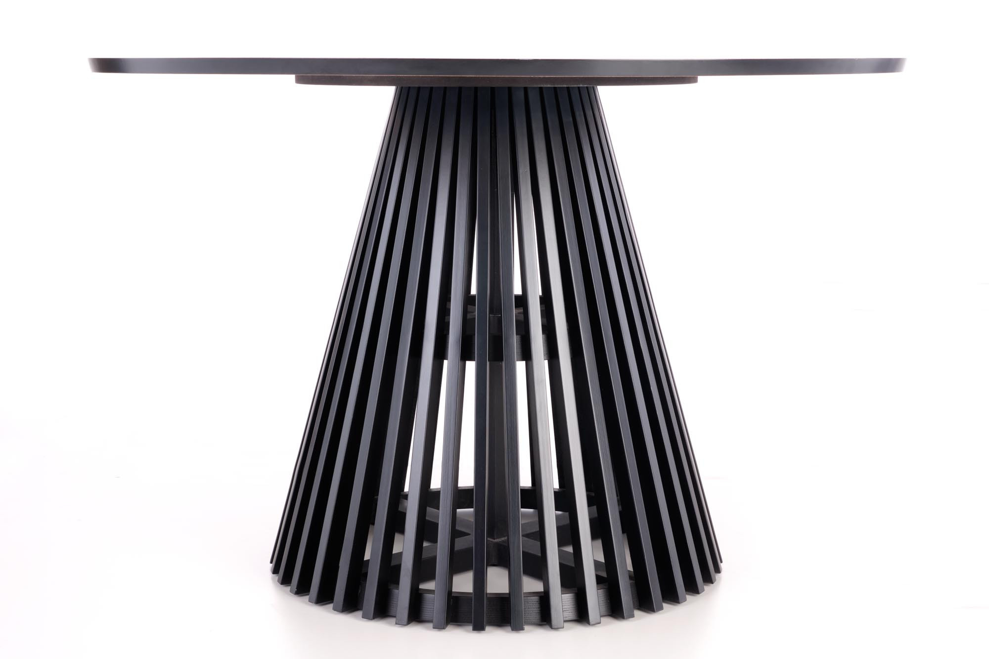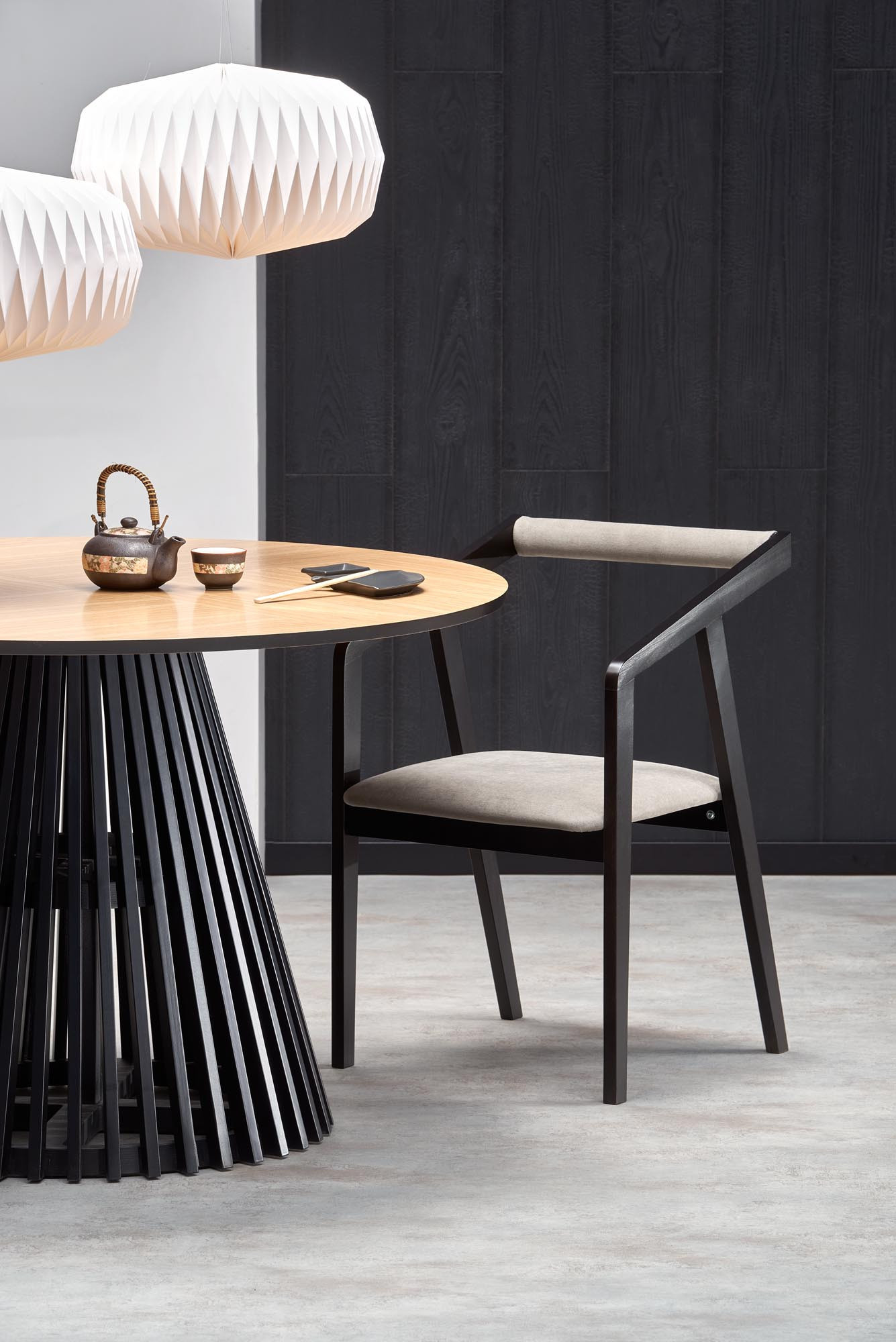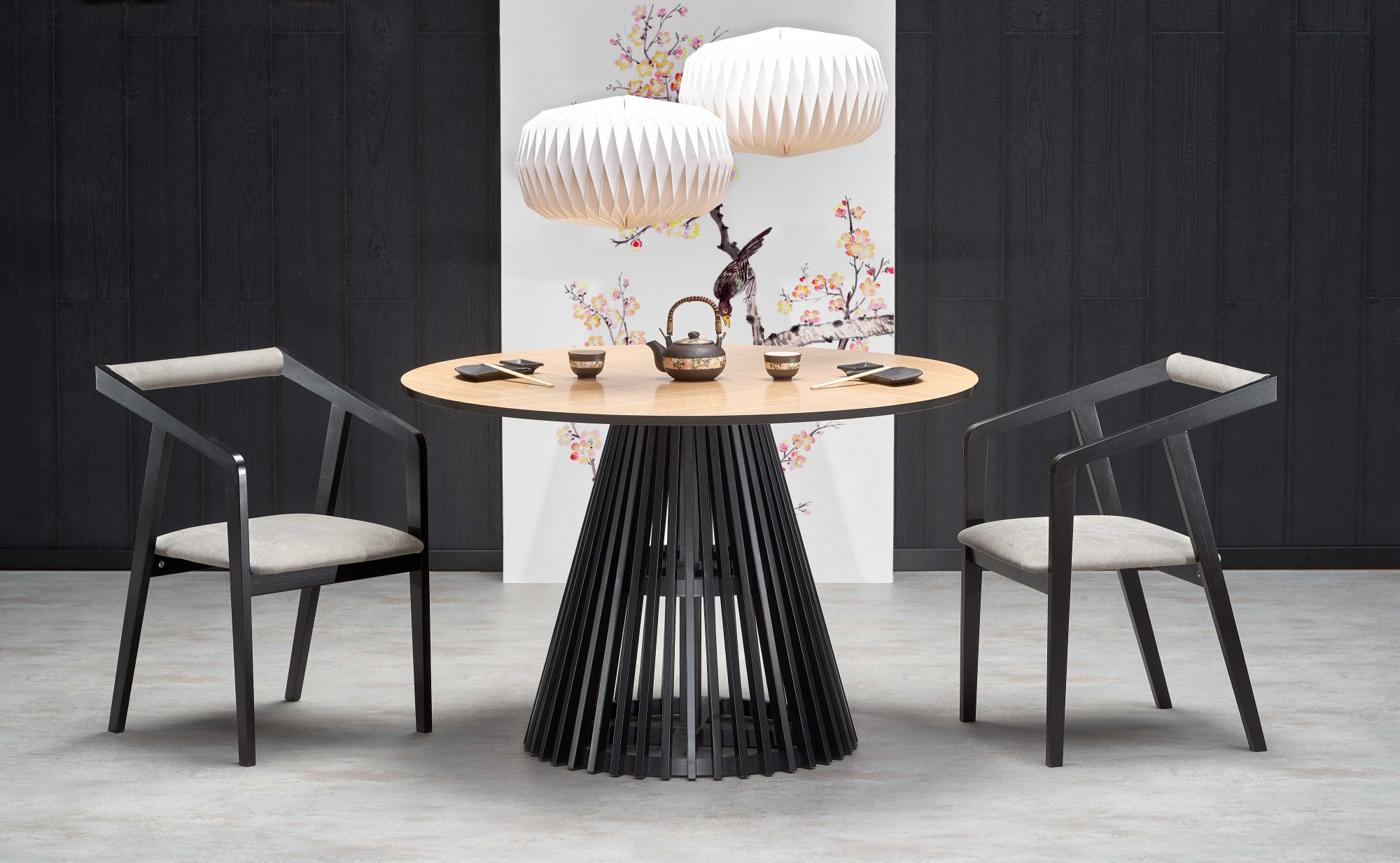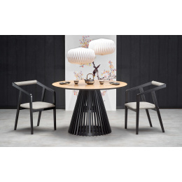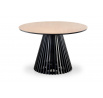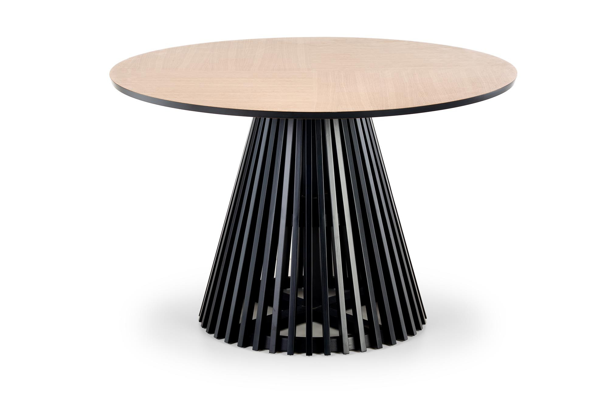 rozměry: fi120/77 cm, materiál: MDF + přírodní dubová dýha / masivní dřevo - buk / překližka, barva: deska stolu - přírodní dub, noha - černá