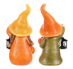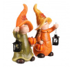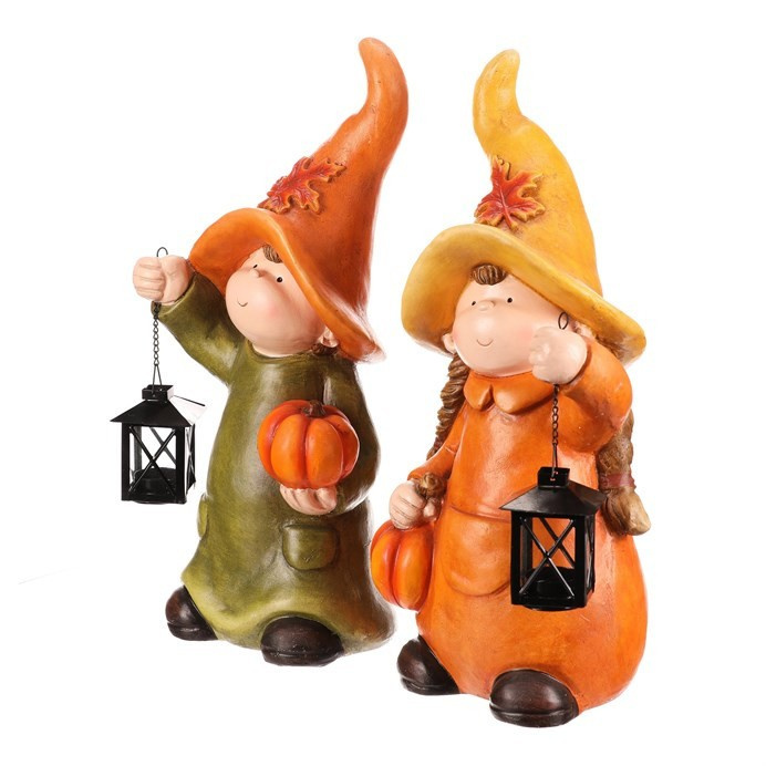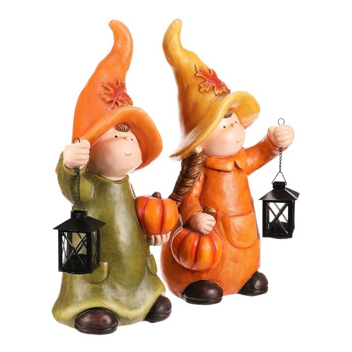 Figurky dětí z magnesia, které drží v rukou lucernu na vložení svíčky, budou roztomilým oživením vaší zahrady, terasy či balkonu. Jsou k dostání ve dvou podobách, přičemž obě jsou barevně laděné do podzimních barev. Tento nádech umocňují dýně, které drží v ručičkách a špičaté čepičky, které jsou ozdobené barevným listem.