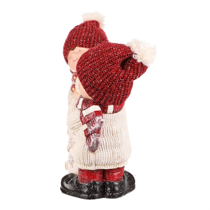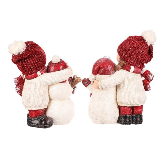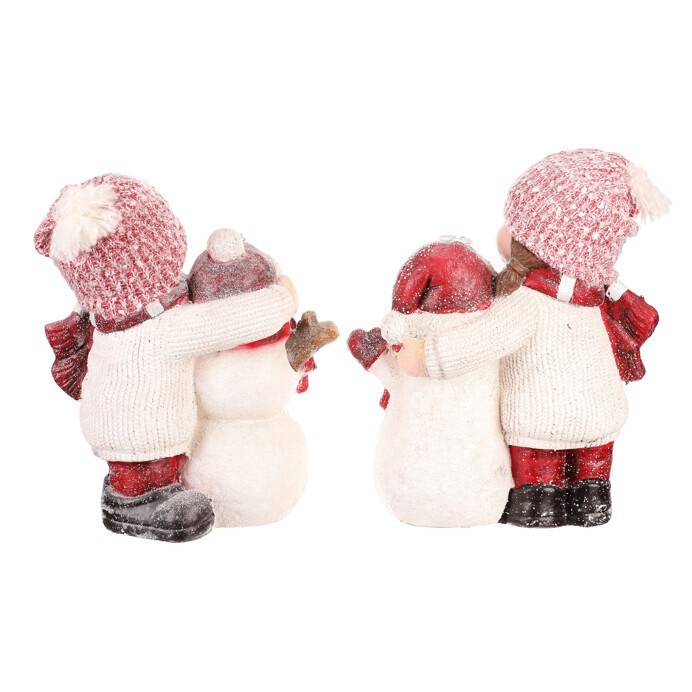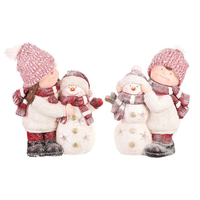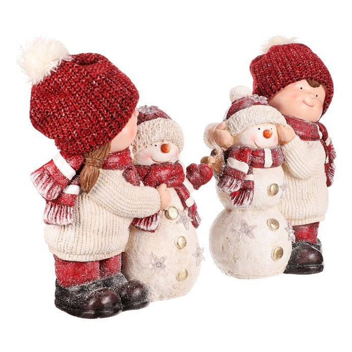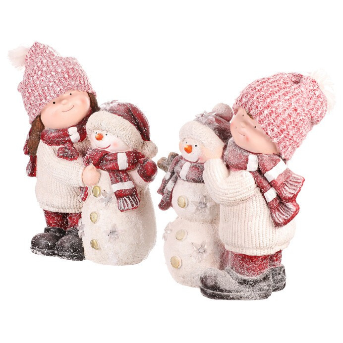 Tato roztomilá dekorační soška zachycuje dívku a chlapce se sněhulákem, kteří společně vytvářejí kouzelnou zimní scénu. LED osvětlením zabudované uvnitř, dodává celé figuře příjemné a teplé světlo, které oživí vánoční atmosféru. Oblečeni do teplých čepic a šál, s roztomilými tvářičkami, symbolizují kamarádství a radost ze společných chvil. Cena je za 1 kus, přičemž soška představuje mix dvou variant.