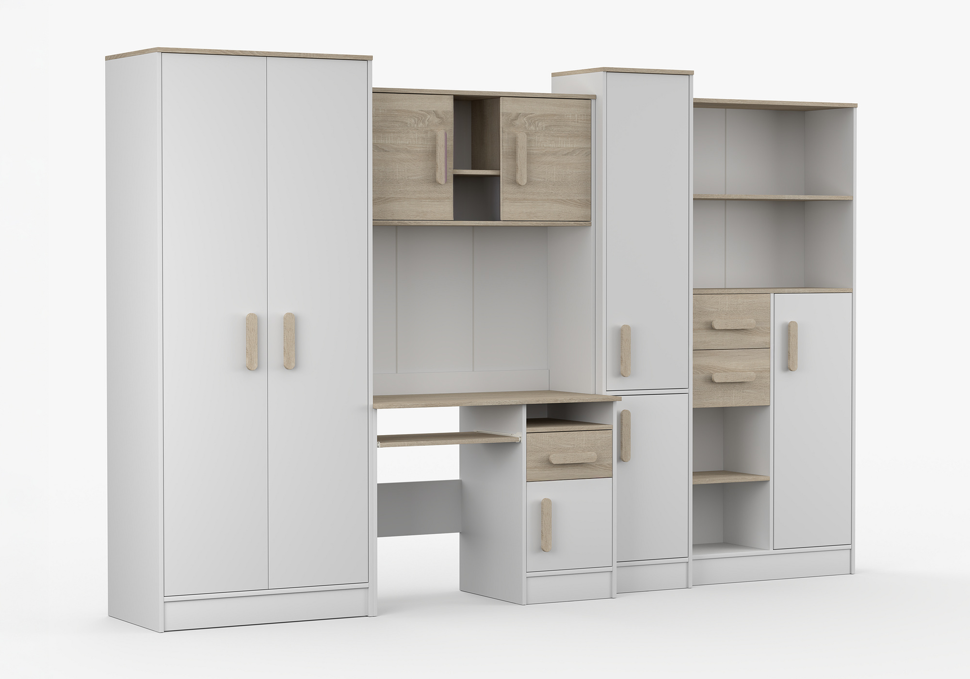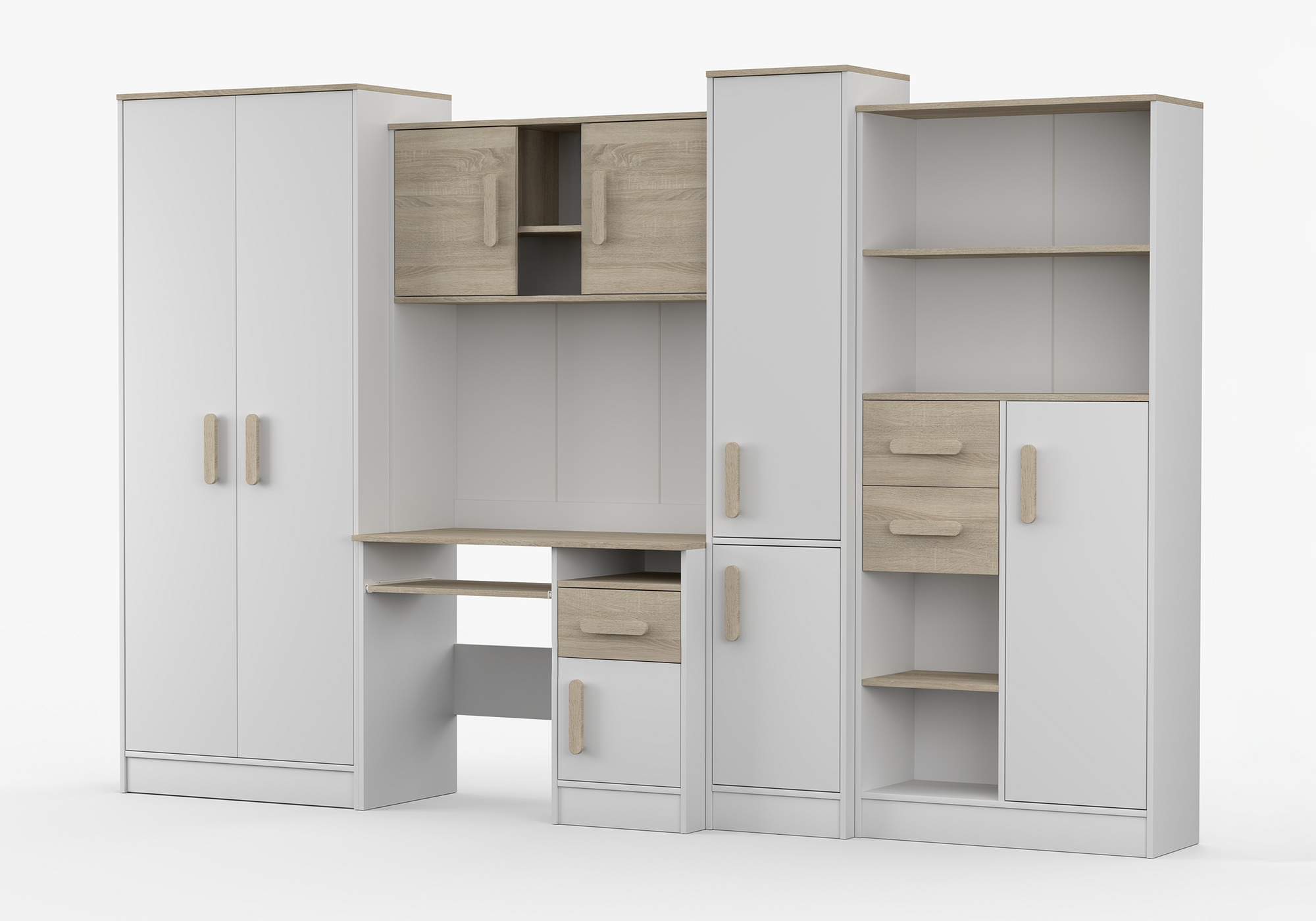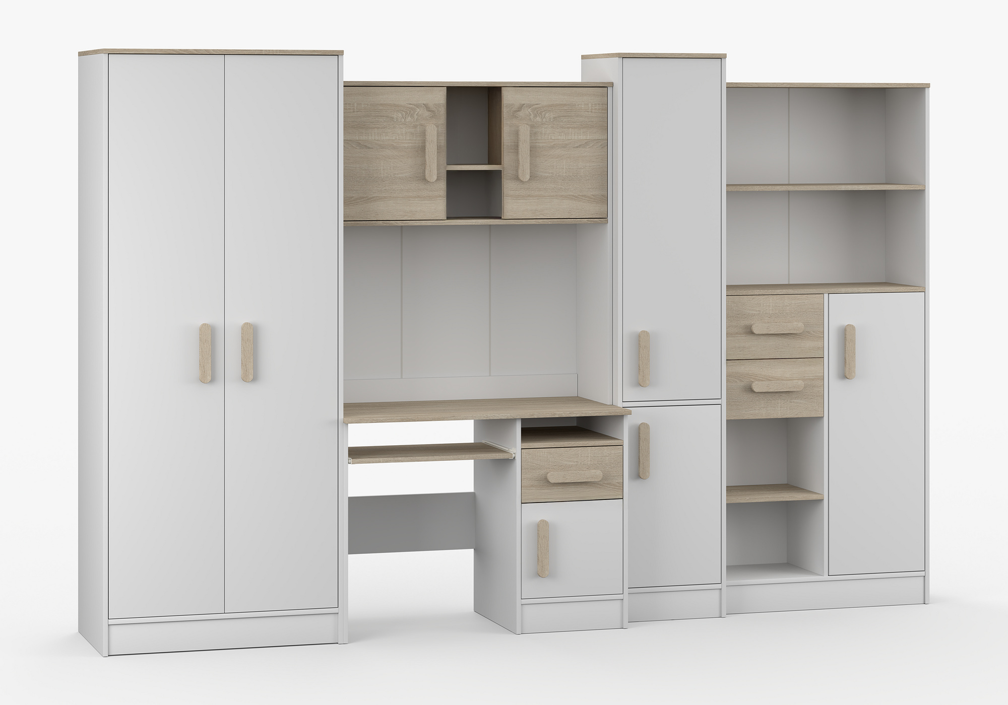 Nábytek pro děti MACIUS je sestava 5 dílů nábytku, které jsou v pokoji teenagera nepostradatelné. Nejdůležitějším dílem sestavy je psací stůl, který je vybaven prostornou skříňkou a rozměrnou zásuvkou. Má výsuvnou polici na klávesnici a otevřenou polici na drobné příslušenství, které chcete mít po ruce. Poskytne Vašemu dítěti pohodlné místo pro vypracovávání domácích úkolů. Stůl je vybaven nástavcem. Součástí sestavy je také dvoudveřová skříň. Uvnitř skříně najdeme polici a šatní tyč na zavěšení oblečení. Další díl sestavy je jednodveřová policová skříň a regál s policemi. Sestava nábytku neobsahuje desku na zeď mezi psacím stolem a nádstavcem nad psací stůl.