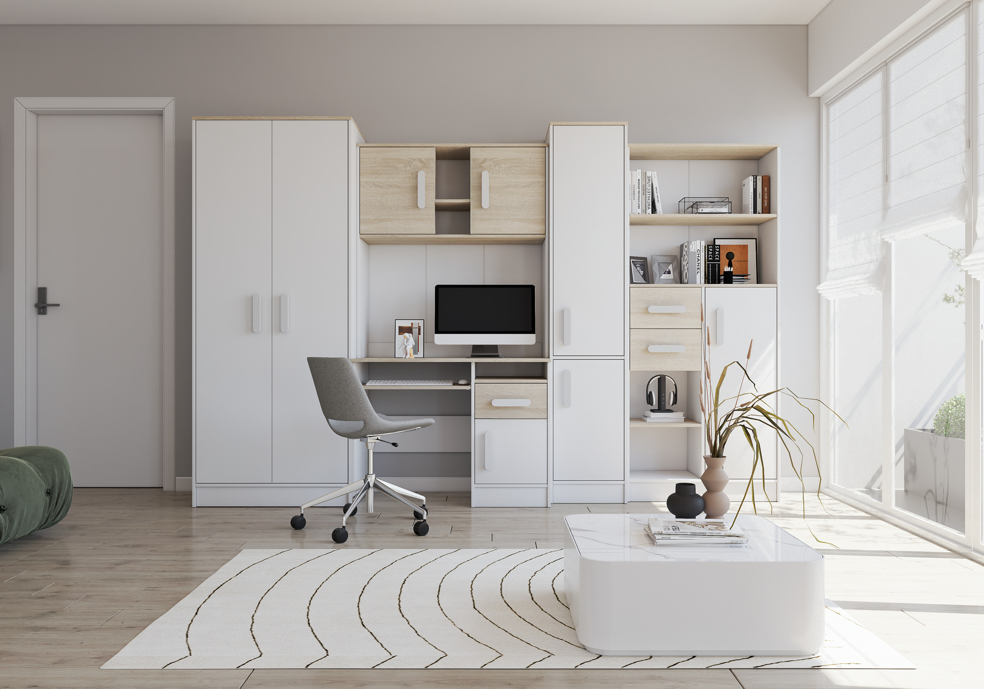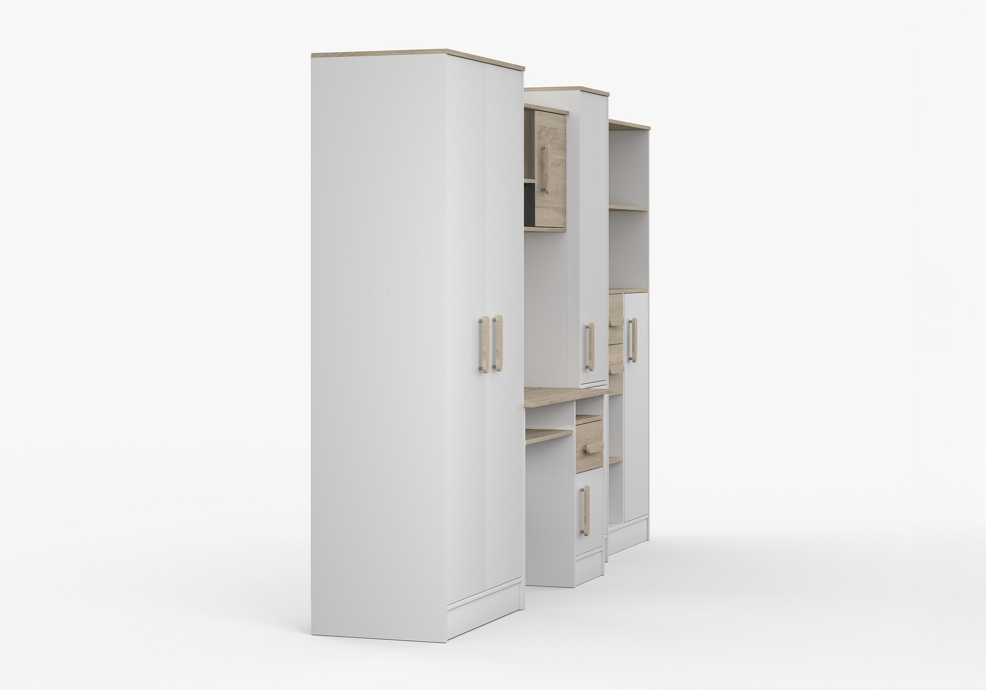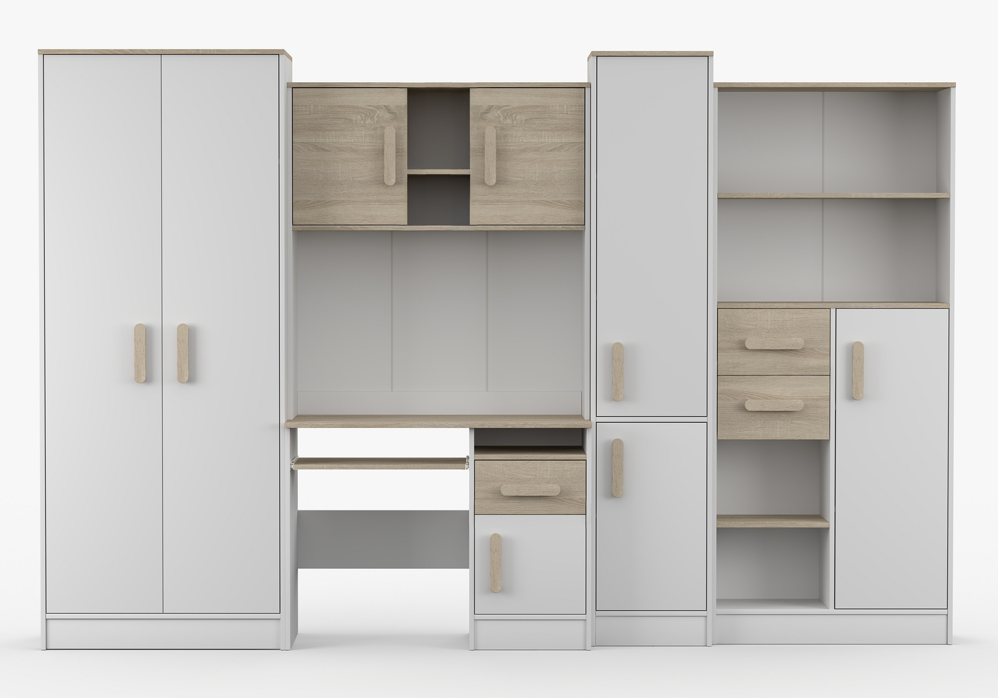 Nábytek pro děti MACIUS je sestava 5 dílů nábytku, které jsou v pokoji teenagera nepostradatelné. Nejdůležitějším dílem sestavy je psací stůl, který je vybaven prostornou skříňkou a rozměrnou zásuvkou. Má výsuvnou polici na klávesnici a otevřenou polici na drobné příslušenství, které chcete mít po ruce. Poskytne Vašemu dítěti pohodlné místo pro vypracovávání domácích úkolů. Stůl je vybaven nástavcem. Součástí sestavy je také dvoudveřová skříň. Uvnitř skříně najdeme polici a šatní tyč na zavěšení oblečení. Další díl sestavy je jednodveřová policová skříň a regál s policemi. Sestava nábytku neobsahuje desku na zeď mezi psacím stolem a nádstavcem nad psací stůl.