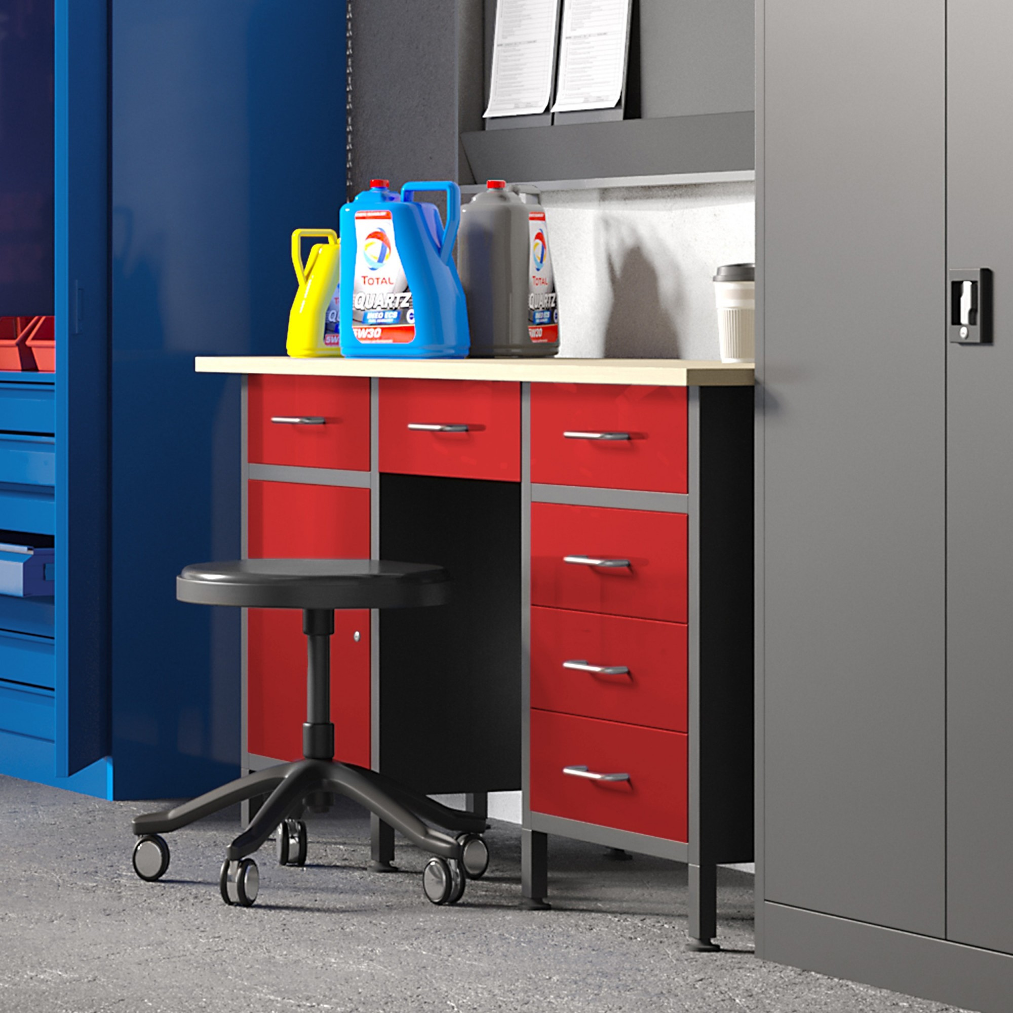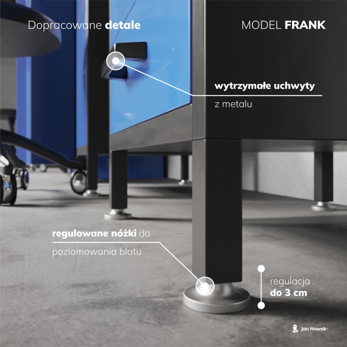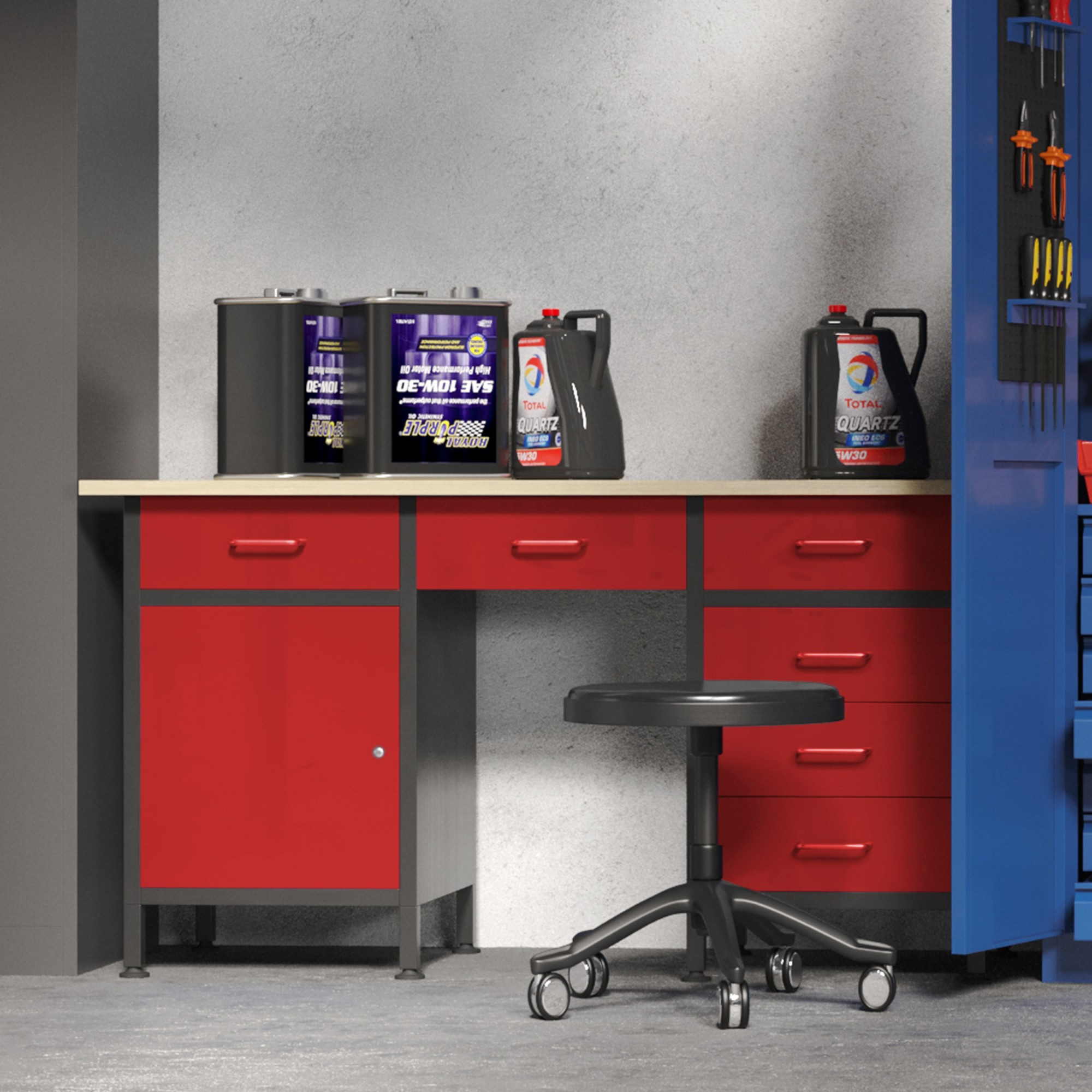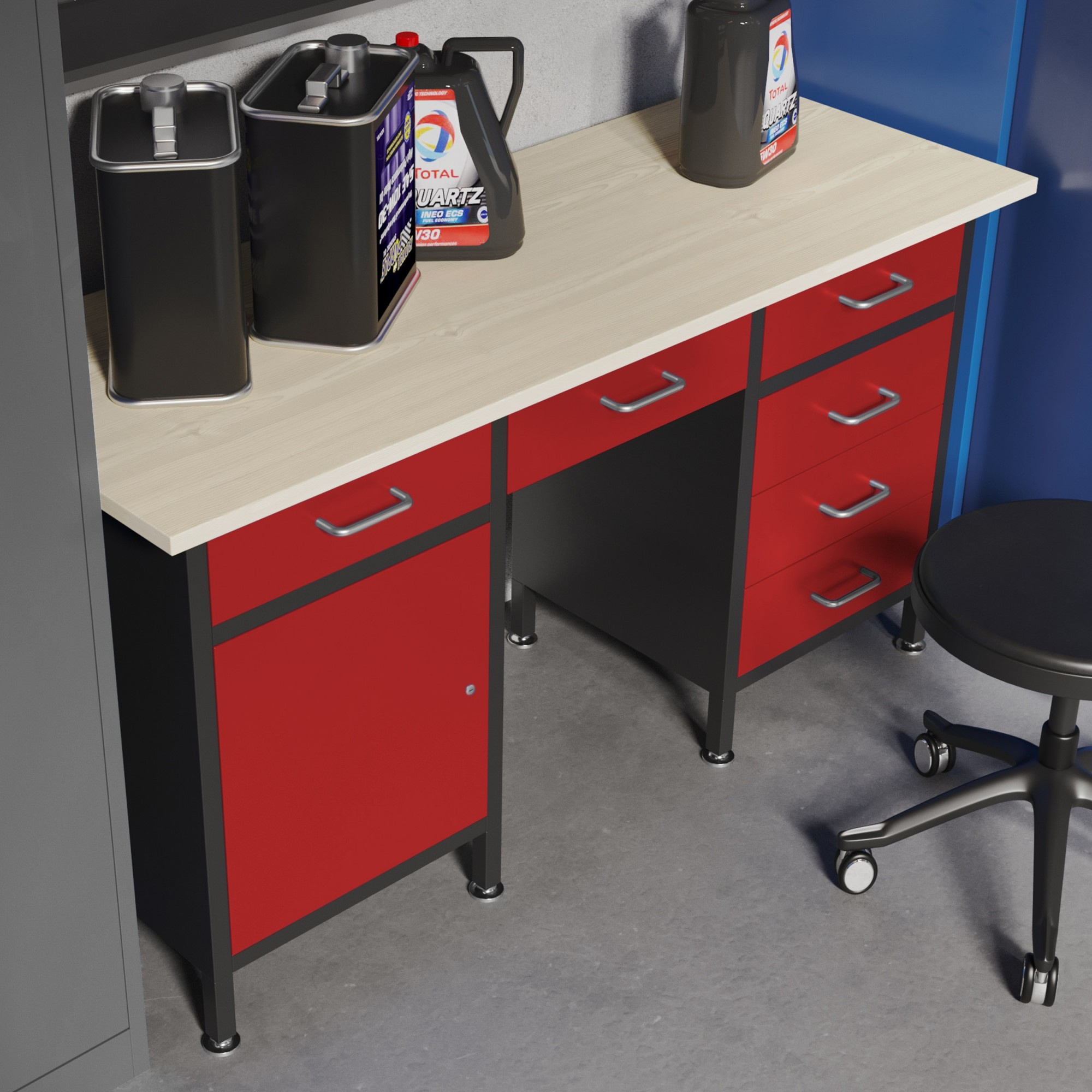 Stůl na nářadí, pracovní deska model FRANK — antracitově-červený Spolehlivý stůl na nářadí FRANK značky změní vaši práci v dílně. S pohodlnou pracovní deskou bude každý úkol mnohem příjemnější a snazší k provedení. Pracovní plocha je obrovská, takže na ni volně umístíte všechny součásti, nástroje, hrnek kávy a stále zůstane ještě spousta místa. Pracovní deska má šířku až 170 cm, hloubku 60 cm a tloušťku 3 cm. Je vyroben z odolné, laminované dřevotřískové desky. Dalším důležitým prvkem pracovního stolu FRANK je kovová konstrukce. Rám, zásuvky, dveře skříňky a police jsou vyrobeny z odolné oceli. Ochranný povlak ve formě práškové barvy chrání před působením vlhkosti a mechanickým poškozením. Stůl na nářadí zůstane v perfektním stavu po mnoho let. Navíc estetické provedení a výběr barev zajišťují, že vypadá skvěle. Černý rám a světlá deska jsou mimořádně atraktivní kombinací.Hlavní přednosti nástrojového stolu FRANK Pracujte pohodlně: uprostřed nástrojového stolu se nachází mezera, díky které si pohodlně sednete k pracovní desce, všechny nástroje se vejdou do 6 zásuvek a skříňky. Solidní a snadno čistitelný: kovový dílenský stůl je vyroben z oceli a opatřen práškovým lakem. Nikdy ti nebude chybět místo: obrovskou výhodou modelu FRANK je velikost desky, její rozměry jsou 170 cm x 60 cm x 3 cm (š. x hl. x gr.) Silná stránka nástrojového stolu: ocelová konstrukce je mimořádně stabilní, stůl můžeš zatížit až do 570 kg, zásuvka unese věci o celkové hmotnosti 45 kg a police 50 kg. Stůl do garáže a dílny: komfortní pracovní deska FRANK je skvělou volbou pro amatérské kutily i skutečné odborníky. Ergonomická práce Stůl do garáže FRANK má nastavitelné nohy, které umožňují vyrovnání desky. Proto bez ohledu na situaci a stav podlahy bude nábytek vždy stát rovně. Díky tomu se úkoly vyžadující největší přesnost stanou čistým potěšením.Manuální práce mohou trvat velmi dlouho, proto je dobré dbát na pohodlné pracovní místo. Rozsáhlý, stabilní pracovní stůl je základ, ale mimořádně důležité je také místo pro uložení. Stůl na nářadí FRANK ti usnadní organizaci pracoviště, protože potřebné nástroje uložíš do 6 zásuvek a skříňky uzamykatelné na klíč. Když budou všechny nástroje na dosah ruky, nebudeš se muset neustále odtrhávat od práce, abys šel k nástrojové skříni. Možnost sedět u pracovního stolu je neocenitelnou výhodou, zejména v případě úkolů, jejichž provedení trvá několik hodin. Stůl na nářadí FRANK byl navržen tak, aby zvýšil váš komfort. Ve střední části nábytku se nachází mezera, díky které se můžeš s židlí přisunout ke stolu.Stůl na nářadí do každého prostoru Pracovní deska v nástrojovém stole FRANK je mimořádně široká, má až 170 cm, a její hloubka činí pouze 60 cm. Díky tomu se nábytek dokonale přizpůsobí prostoru, ve kterém se nachází, a umožňuje volný průchod. To je skvělé řešení pro úzké, neproporční místnosti. Kovový dílenský stůl FRANK je vyroben z velmi odolné oceli, která je navíc pokryta práškovou barvou. Je skvěle chráněn proti vzniku koroze. Můžeš být klidný ohledně jeho stavu, i když používáš lepidla, oleje, chemikálie a v místnosti je vysoká vlhkost. Profil, čelo skříňky a zásuvky tvoří ocel 1,0 mm, zatímco korpus a ostatní prvky - 0,8 mm. Model Frank se jistě osvědčí jako stůl do garáže, dílny, ateliéru, továrny nebo skladu. Stůl do garáže FRANK — specifikace: Barva: antracitově-červená Výška stolu: 85 cm Šířka desky: 170 cm Hloubka desky: 60 cm Tloušťka desky: 3 cm Hmotnost: 85.4 kg Materiál desky: laminovaná dřevotříska Konstrukce stolu: ocel s práškovým nástřikem Maximální zatížení do 570 kg Přípustné zatížení police: 50 kg Přípustné zatížení zásuvky: 45 kg Závit nastavitelných nožek: 9 mm