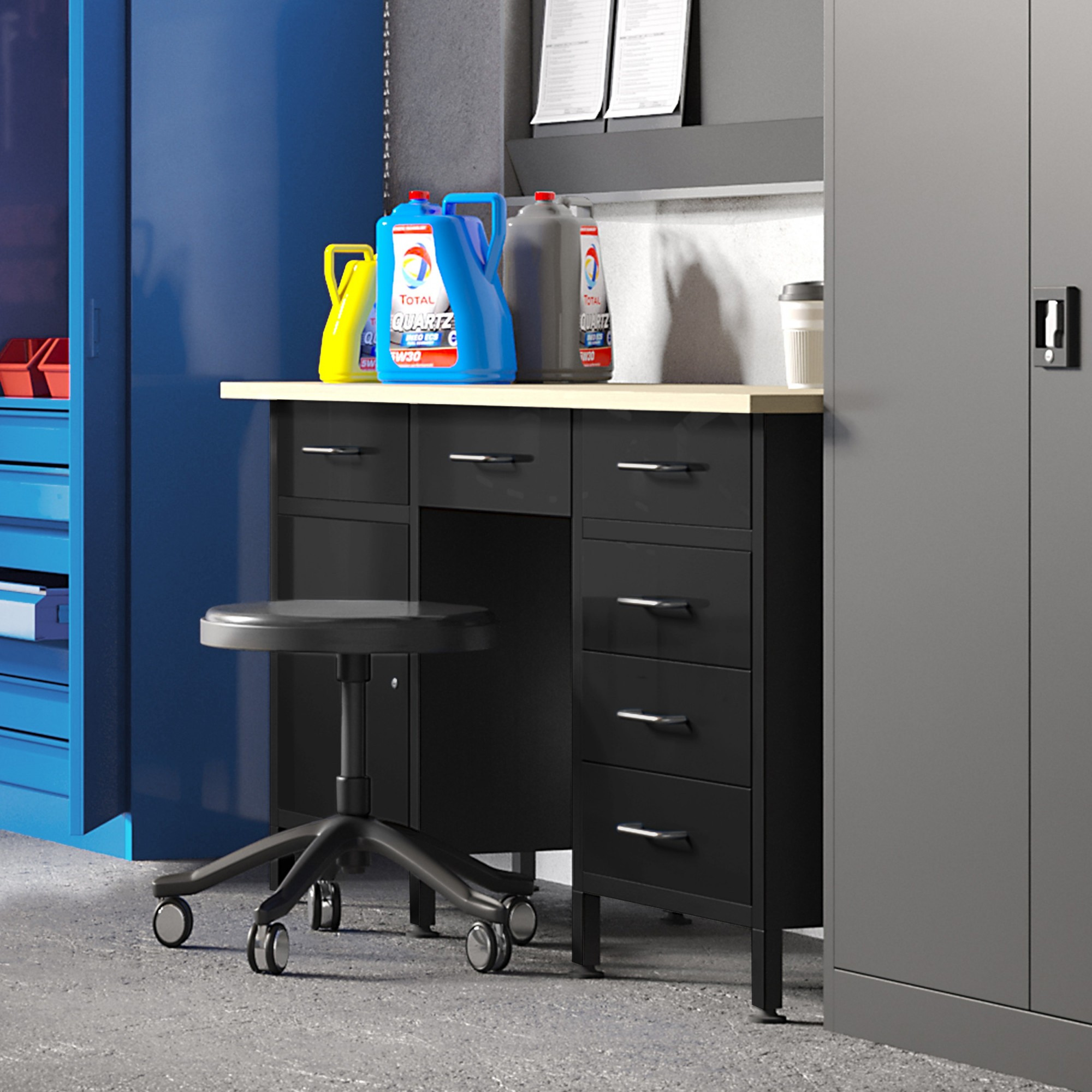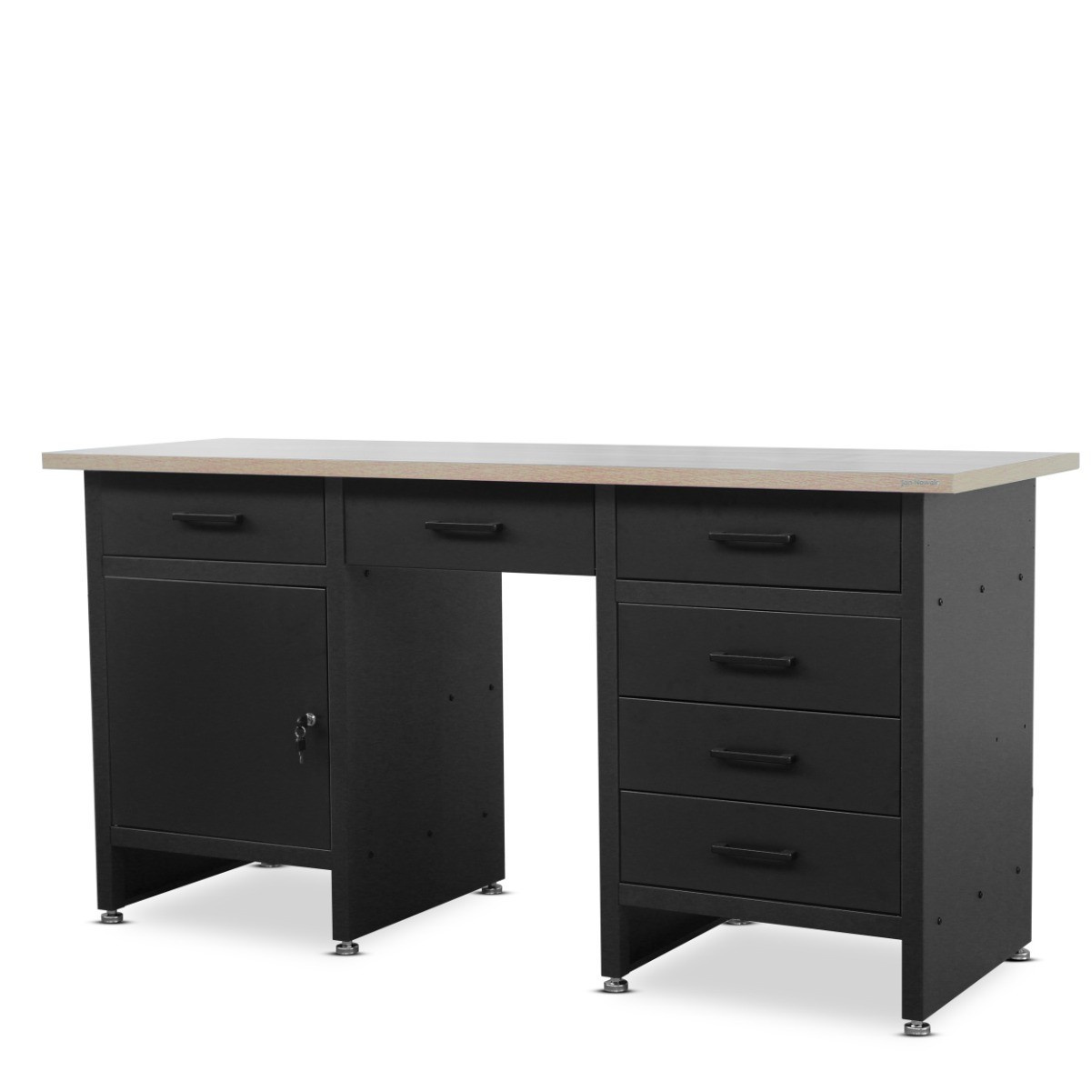 Stůl na nářadí, pracovní deska model FRANK — černý Spolehlivý stůl na nářadí FRANK značky změní vaši práci v dílně. S pohodlnou pracovní deskou bude každý úkol mnohem příjemnější a snazší k provedení. Pracovní plocha je obrovská, takže na ni volně umístíte všechny součásti, nástroje, hrnek kávy a stále zůstane ještě spousta místa. Pracovní deska má šířku až 170 cm, hloubku 60 cm a tloušťku 3 cm. Je vyroben z odolné, laminované dřevotřískové desky. Dalším důležitým prvkem pracovního stolu FRANK je kovová konstrukce. Rám, zásuvky, dveře skříňky a police jsou vyrobeny z odolné oceli. Ochranný povlak ve formě práškové barvy chrání před působením vlhkosti a mechanickým poškozením. Stůl na nářadí zůstane v perfektním stavu po mnoho let. Navíc estetické provedení a výběr barev zajišťují, že vypadá skvěle. Černý rám a světlá deska jsou mimořádně atraktivní kombinací.Hlavní přednosti nástrojového stolu FRANK Pracujte pohodlně: uprostřed nástrojového stolu se nachází mezera, díky které si pohodlně sednete k pracovní desce, všechny nástroje se vejdou do 6 zásuvek a skříňky. Solidní a snadno čistitelný: kovový dílenský stůl je vyroben z oceli a opatřen práškovým lakem. Nikdy ti nebude chybět místo: obrovskou výhodou modelu FRANK je velikost desky, její rozměry jsou 170 cm x 60 cm x 3 cm (š. x hl. x gr.) Silná stránka nástrojového stolu: ocelová konstrukce je mimořádně stabilní, stůl můžeš zatížit až do 570 kg, zásuvka unese věci o celkové hmotnosti 45 kg a police 50 kg. Stůl do garáže a dílny: komfortní pracovní deska FRANK je skvělou volbou pro amatérské kutily i skutečné odborníky. Ergonomická práce Stůl do garáže FRANK má nastavitelné nohy, které umožňují vyrovnání desky. Proto bez ohledu na situaci a stav podlahy bude nábytek vždy stát rovně. Díky tomu se úkoly vyžadující největší přesnost stanou čistým potěšením.Manuální práce mohou trvat velmi dlouho, proto je dobré dbát na pohodlné pracovní místo. Rozsáhlý, stabilní pracovní stůl je základ, ale mimořádně důležité je také místo pro uložení. Stůl na nářadí FRANK ti usnadní organizaci pracoviště, protože potřebné nástroje uložíš do 6 zásuvek a skříňky uzamykatelné na klíč. Když budou všechny nástroje na dosah ruky, nebudeš se muset neustále odtrhávat od práce, abys šel k nástrojové skříni. Možnost sedět u pracovního stolu je neocenitelnou výhodou, zejména v případě úkolů, jejichž provedení trvá několik hodin. Stůl na nářadí FRANK byl navržen tak, aby zvýšil váš komfort. Ve střední části nábytku se nachází mezera, díky které se můžeš s židlí přisunout ke stolu.Stůl na nářadí do každého prostoru Pracovní deska ve stolu na nářadí FRANK je mimořádně široká, má až 170 cm, a její hloubka je pouze 60 cm. Díky tomu se nábytek dokonale přizpůsobí prostoru, ve kterém se nachází, a umožňuje volný průchod. To je skvělé řešení pro úzké, neproporční místnosti. Kovový dílenský stůl FRANK je vyroben z velmi odolné oceli, která je navíc pokryta práškovou barvou. Je skvěle chráněn proti vzniku koroze. Můžeš být klidný ohledně jeho stavu, i když používáš lepidla, oleje, chemikálie a v místnosti je vysoká vlhkost. Model Frank se jistě osvědčí jako stůl do garáže, dílny, ateliéru, továrny nebo skladu. Dílenský stůl byl vyroben z tlustého plechu. Profil, čelo skříňky a zásuvky tvoří ocel 1,0 mm, zatímco korpus a ostatní prvky - 0,8 mm.Stůl do garáže FRANK — specifikace: Barva: černá Výška stolu: 85 cm Šířka desky: 170 cm Hloubka desky: 60 cm Tloušťka desky: 3 cm Hmotnost: 85.4 kg Materiál desky: laminovaná dřevotříska Konstrukce stolu: ocel s práškovým nástřikem Maximální zatížení do 570 kg Přípustné zatížení police: 50 kg Přípustné zatížení zásuvky: 45 kg Závit nastavitelných nožek: 9 mm