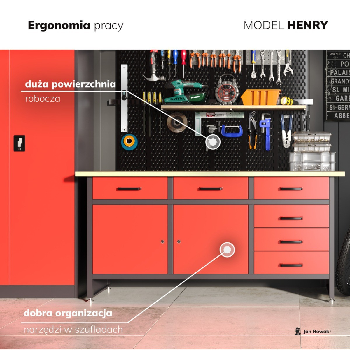 Velký dílenský stůl model HENRY — antracitově-červený Pokud je pro vás u dílenského nábytku prioritou velká, pohodlná pracovní deska, pak bude pracovní stůl HENRY značky tou nejlepší volbou. Je vyroben z odolné a pevné laminované dřevotřískové desky o rozměrech 170 cm x 60 cm x 3 cm a také z konstrukce z oceli odolné proti poškození. Dílenský stůl HENRY se od ostatních odlišuje obrovskou úložnou plochou. Všechny vaše nástroje, klíče, šroubováky, matice, šrouby, lepidla, najdou své místo v jedné ze šesti zásuvek nebo dvou skříněk. Díky čemuž se udržování pořádku na pracovišti stane snadným a příjemným. Dílenský stůl HENRY je určen k vlastní montáži.Proč si vybrat dílenský stůl HENRY? Větší pracovní deska pro pohodlnou práci: laminovaná dřevotřísková deska, ze které je vyrobena, má šířku až 170 cm, hloubku 60 cm a tloušťku 3 cm. Solidní kovová konstrukce: odolný rám z práškově lakované oceli je trvanlivý a snadno udržovatelný. Maximální úložná plocha: 6 prostorných zásuvek a 2 skříňky uzamykatelné na klíč, to je rozhodně favorit mezi pracovními stoly. Silný bod dílen: přípustné zatížení jednotlivé zásuvky je 45 kg, police 50 kg a maximální zatížení pracovního stolu je 570 kg. Řešení pro náročné: velký pracovní stůl HENRY splní očekávání specialistů i domácích kutilů, hodí se do dílny, garáže, skladu. Pracovní stůl ve verzi XXL Dílenský stůl HENRY je model s obrovskou pracovní plochou. Vše díky unikátním rozměrům. Pracovní deska má hloubku 60 cm, zatímco její šířka je značně prodloužená a činí až 170 cm. Nezáleží na tom, zda vyrábíte nábytek nebo opravujete zařízení, určitě vám nebude chybět místo na provádění úkolů. Zvětšení pouze jednoho rozměru je originální, pohodlné řešení. Získáváš více pracovní plochy, přičemž nábytek nezabírá prostor a ideálně se hodí do dlouhých, úzkých místností. Pracovní stůl a skříň v jednom Pokud stojíte před výběrem dílenského nábytku pro střední nebo malý prostor, pracovní stůl HENRY se ukáže jako skvělá volba. Místo vytváření sestavy skládající se z ne zcela pohodlné desky a malé dílenské skříně, zvolte jeden kus nábytku. Stůl s rozsáhlým prostorem pro práci a navíc s největší možnou plochou pro ukládání. Dílenský stůl HENRY má 6 prostorných zásuvek a 2 skříňky uzamykatelné na klíč, takže úspěšně nahradí skříň na nářadí. Všechno, co potřebujete k práci, bude vždy na dosah ruky a perfektně uspořádané. I když nejsi příliš organizovaný a pořádek není tvou nejsilnější stránkou, pracovní stůl HENRY má pouze uzamykatelné úložné prostory. Co umožní účinně skrýt všechny nedokonalosti. Nejvyšší kvalita provedení Pracovní stůl HENRY je skvělý nábytek do dílny, řemeslné dílny, skladu nebo garáže. Je vyroben z pevné oceli chráněné práškovou barvou, která se skvěle osvědčuje v náročných podmínkách. Dokonce ani ve vlhkém, neizolovaném prostoru se na jejím povrchu neobjeví rez. Profil, zásuvky a čela skříněk tvoří ocel 1,0 mm, zatímco korpus a ostatní prvky - 0,8 mm. Dílenský stůl zůstane ve skvělém stavu po mnoho let. Další vrstva chrání nábytek, ale také mu dodává zajímavou barvu. Antracitově-červený dílenský stůl v kombinaci se světlou deskou dodá místnosti charakter. Kývající se pracovní stůl je noční můrou každého kutila. Dílenský stůl HENRY bude stát rovně i na nerovné podlaze, protože je vybaven nožkami s nastavitelnou výškou. Stačí několik okamžiků, abyste dokonale vyrovnali nábytek. Pracovní stůl HENRY — specifikace: Barva: antracitově-červená (RAL 7016 - RAL 3020) Výška stolu: 85 cm Šířka desky: 170 cm Hloubka desky: 60 cm Tloušťka desky: 3 cm Hmotnost: 91.3 kg Materiál desky: laminovaná dřevotříska Konstrukce stolu: ocel lakovaná práškovou barvou Maximální zatížení do 570 kg Přípustné zatížení police: 50 kg Přípustné zatížení zásuvky: 45 kg Závit nastavitelných nožek: M10*50 mm