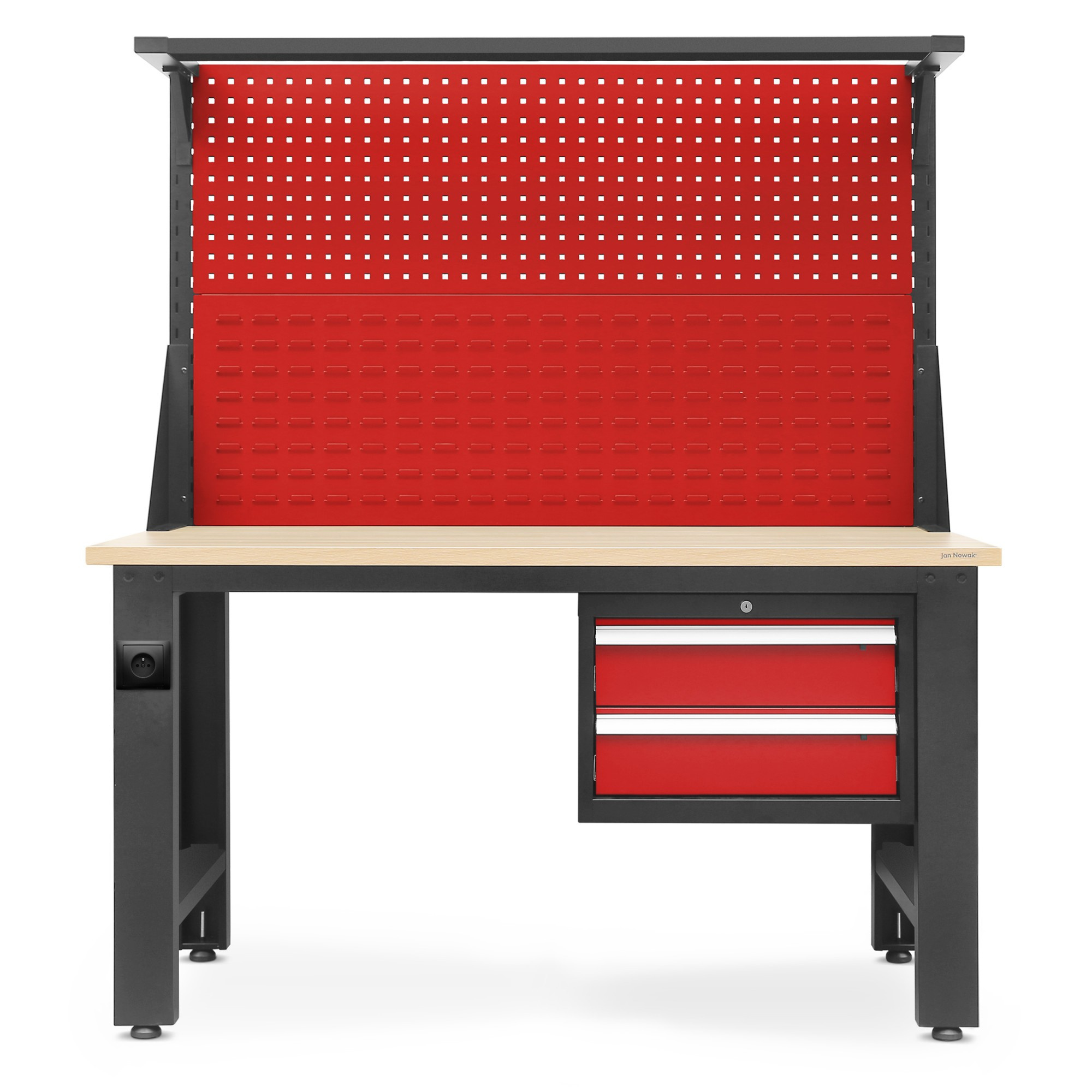 stůl do dílny LOGAN, antracitově-červený Profesionální dílenský stůl LOGAN splní vaše sny o praktickém a pohodlném prostoru pro práci či kutění. Navrhli jsme je tak, aby splňovalo všechny vaše potřeby. Dílenský stůl LOGAN má prostornou pracovní desku, odolnou konstrukci, perforovanou desku, zásuvky uzamykatelné na klíč a místo pro montáž lampy. Pevný základ pro vaši dílnu Pracovní stůl je řídícím centrem každé dílny, proto by měl být spolehlivý a odolný. Dílenský stůl LOGAN kombinuje pevnou ocel a desku z laminované dřevotřísky o tloušťce 3 cm. Naše řešení vám poskytne impozantní pracovní plochu o rozměrech 150 x 75 cm a také mimořádně velkou nosnost 600 kg. Je to zásluha velmi masivního rámu, který je vyroben z ocelových profilů o tloušťce 1,5 mm. Celá konstrukce má protikorozní ochranu. Dedikovaná nástavba stolu Pracovní stůl s dedikovanou nástavbou je skvělá volba. Za prvé, protože získáš jistotu, že řešení bude dokonale přizpůsobeno pracovní desce a mimořádně stabilní. Za druhé šetříš čas, protože vše objednáš najednou. Díky tomu nemusíte věnovat ani chvíli hledání vhodného modelu. Nástavba dílenského stolu LOGAN je mimořádně funkční. Má nástrojovou desku, kterou jsme rozdělili na dvě části. Spodní část ti umožní ukládat drobné prvky v skladovacích kontejnerech ergobox, zatímco horní část slouží k organizaci nástrojů, jako jsou šroubováky, klíče, kladiva, měřidla, vodováhy. K upevnění příslušenství nepotřebujete šrouby a kdykoli můžete změnit jejich uspořádání. Úchyty a háky je třeba zakoupit samostatně. Zásuvky zamykatelné na klíč Pro nástroje, které nebudete schopni pověsit na perforovanou desku, jsme připravili zásuvky. Silné vodicí lišty zajišťují plynulý chod a nosnost až 45 kg. Zásuvky jsou uzamykatelné na klíč, proto se skvěle hodí i pro ukládání dokumentů. Skryté předměty se jistě nedostanou do nepovolaných rukou. Jeden zámek zabezpečuje dvě zásuvky, sada obsahuje dva klíče. Dílenský stůl, který okouzlí detaily Práškové lakování - ocelové prvky jsou pokryty práškovým lakem, který chrání před rzí a zvyšuje estetiku řešení. Nastavitelné nožky - s dílenským stolem LOGAN pro vás žádné nerovnosti nebudou problém. Uspokojivá pracovní plocha - deska o hloubce až 75 cm i při zavěšených ergoboxech ti stále nabídne dostatek pracovního prostoru.Regulovaný stojan na lampu - horní nosník ti umožní montáž osvětlení, které zvýší tvůj komfort (lampa není součástí balení). Pohodlné úchyty na zásuvky - ať už máte na sobě rukavice, nebo se soustředíte na prováděný úkol, otevření zásuvky je mimořádně snadné. Tvar dílenského stolu ti umožní vykonávat své povinnosti v sedě. Dlouhodobá práce se stane mnohem příjemnější. Dílenský stůl LOGAN — specifikace: Barva: antracitově-červená RAL 7016 - RAL 3020 Výška desky: 80 cm Šířka desky: 150 cm Hloubka desky: 75 cm Tloušťka desky: 3 cm Výška s nástavbou: 170 cm Hmotnost: 89.3 kg Materiál desky: laminovaná dřevotříska Konstrukce stolu: ocel lakovaná práškovou barvou tloušťka 1,5/1,0/0,8 mm Maximální zatížení do 600 kg Přípustné zatížení zásuvky: 45 kg Závit nastavitelných nožek: 9 mm Perforovaná deska: vzdálenost mezi otvory 27 mm rozměry otvorů 10 mm x 10 mm Pracovní stůl LOGAN k vám přijde ve třech baleních. V sadě se nachází zásuvka evropského standardu.