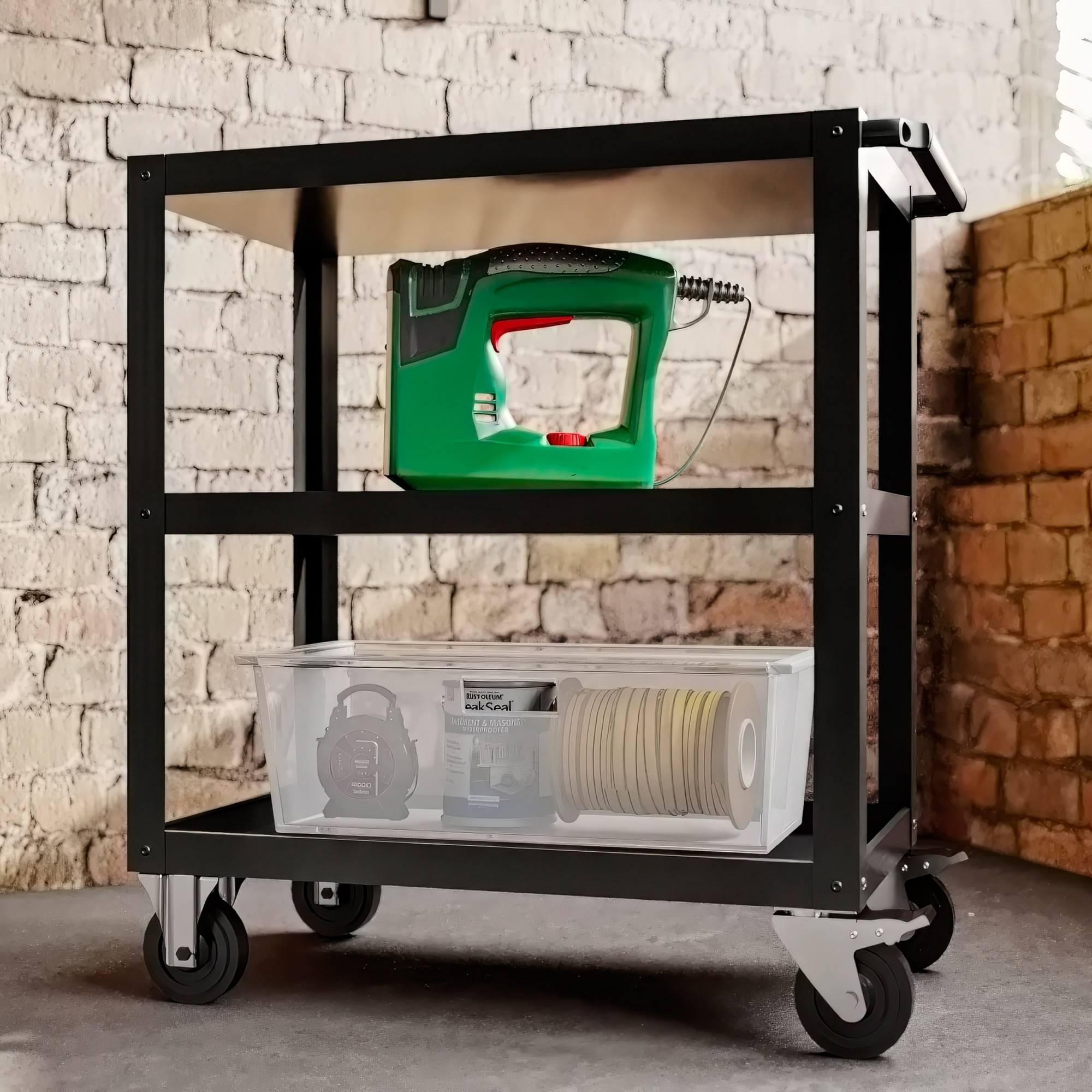 Dílenský vozík HUGO je investicí do kvality a dlouhé životnosti. Jeho konstrukce je vyrobena z pevné oceli (1,1 mm pro konstrukci, 0,8 mm pro police), která zaručuje vysokou odolnost proti mechanickému poškození. Povrch je ošetřen práškovou barvou v elegantní černé barvě, která nejenže skvěle vypadá, ale také poskytuje účinnou ochranu proti korozi.