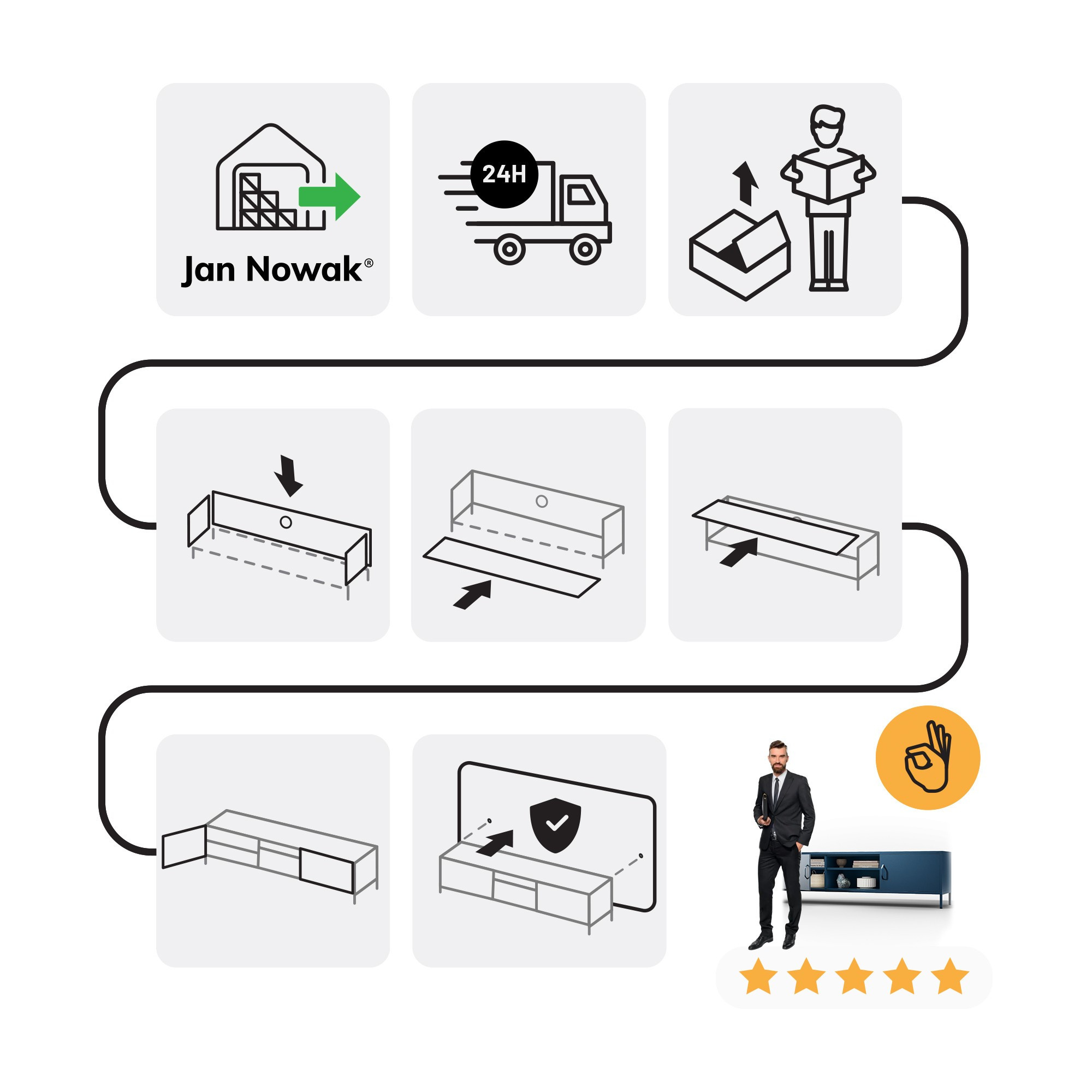 - Praktické uspořádání: Dvě boční komory s kovovými dvířky a otevřená středová přihrádka nabízejí dostatek prostoru pro veškerou vaši elektroniku a příslušenství.