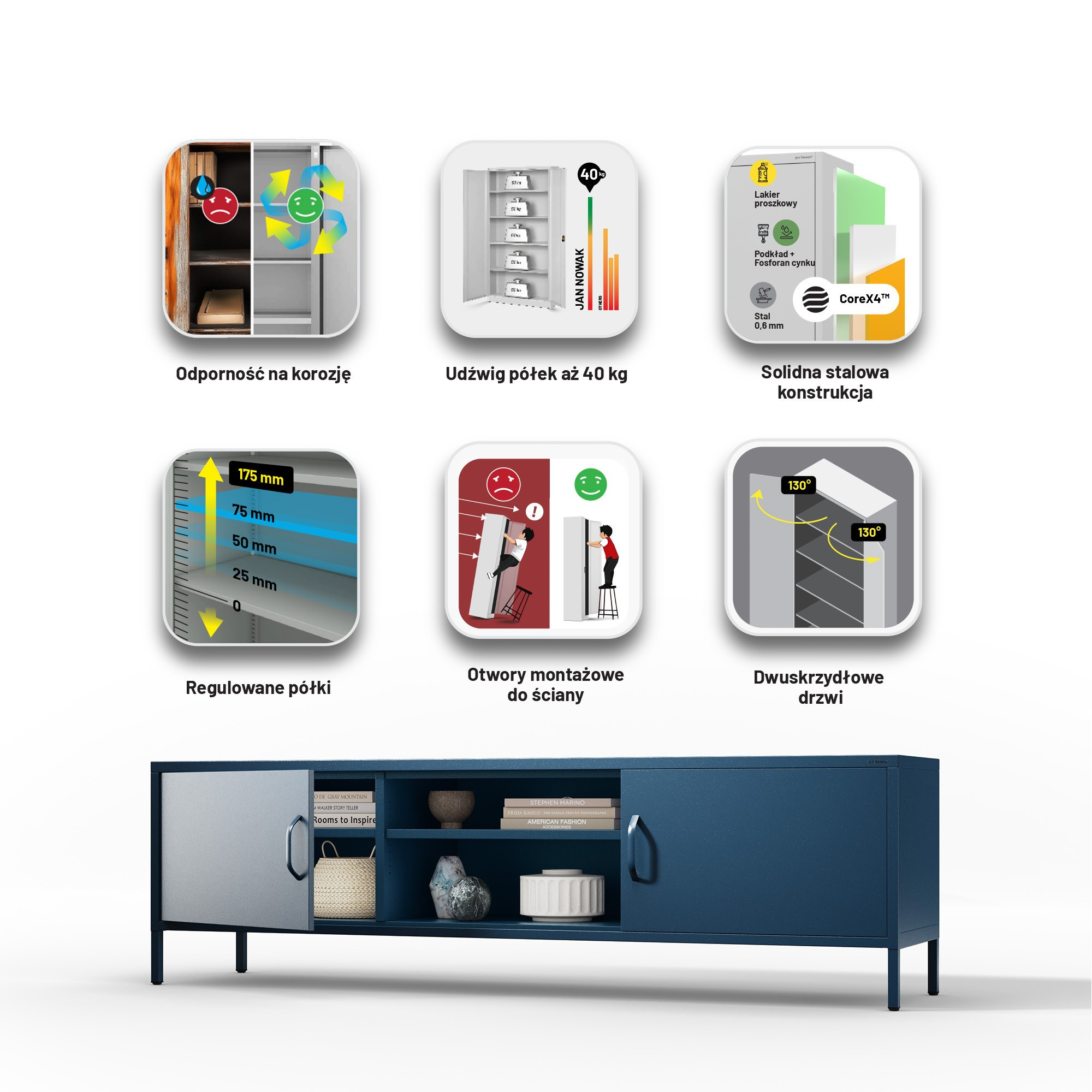 - Robustní konstrukce: Ocelová konstrukce o tloušťce 0,6 mm zajišťuje vysokou nosnost a dlouhou životnost.