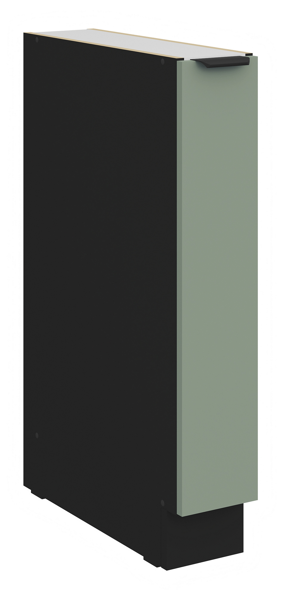 Kuchyně ARIA je vyrobena z vysoce kvalitního lamina o tloušťce 16 mm, které je zpracováno v elegantní černé barvě. Tento sofistikovaný vzhled je doplněn dvířky a čely šuplíků v barvě Aquamarine AFM, které jsou opatřeny odolnými ABS hranami. Kombinace černé barvy a Aquamarine odstínu dodává skřínce luxusní vzhled, který se hodí do každé moderní kuchyně.