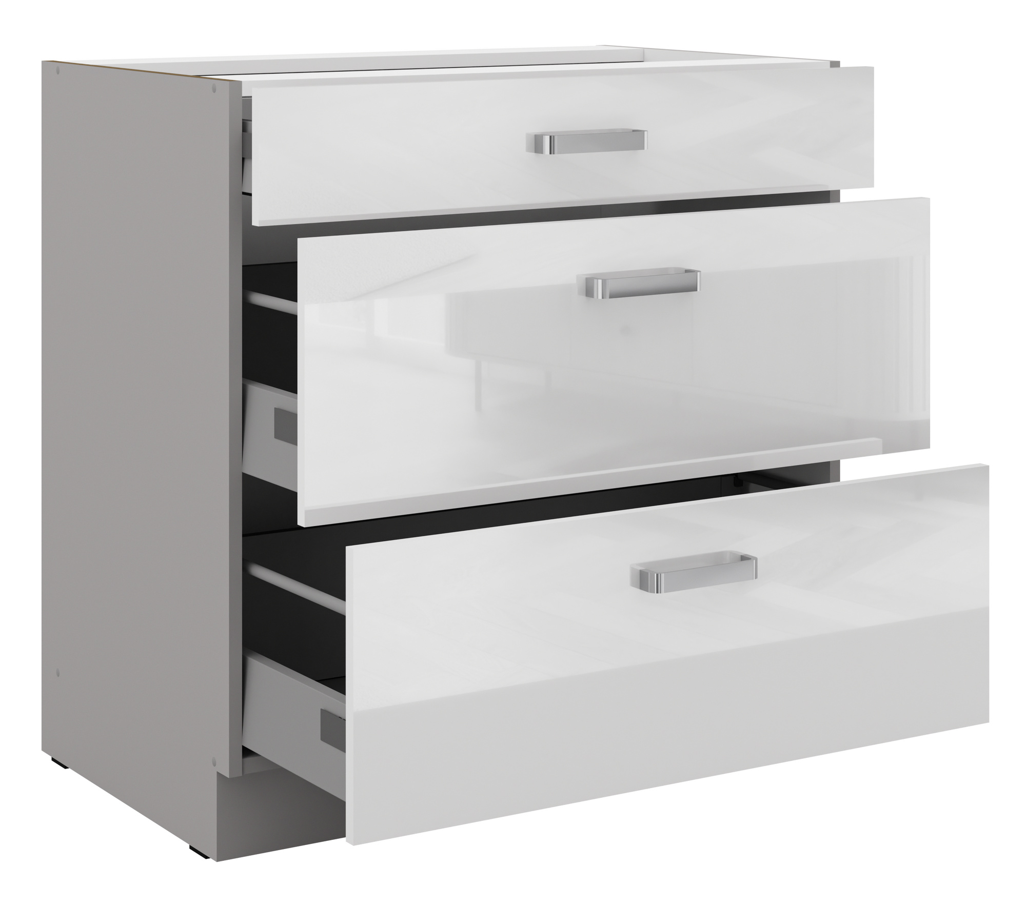 - Dvířka a čela šuplíků jsou vyrobeny z laminované desky 16 mm PUR HG v Bílém lesku