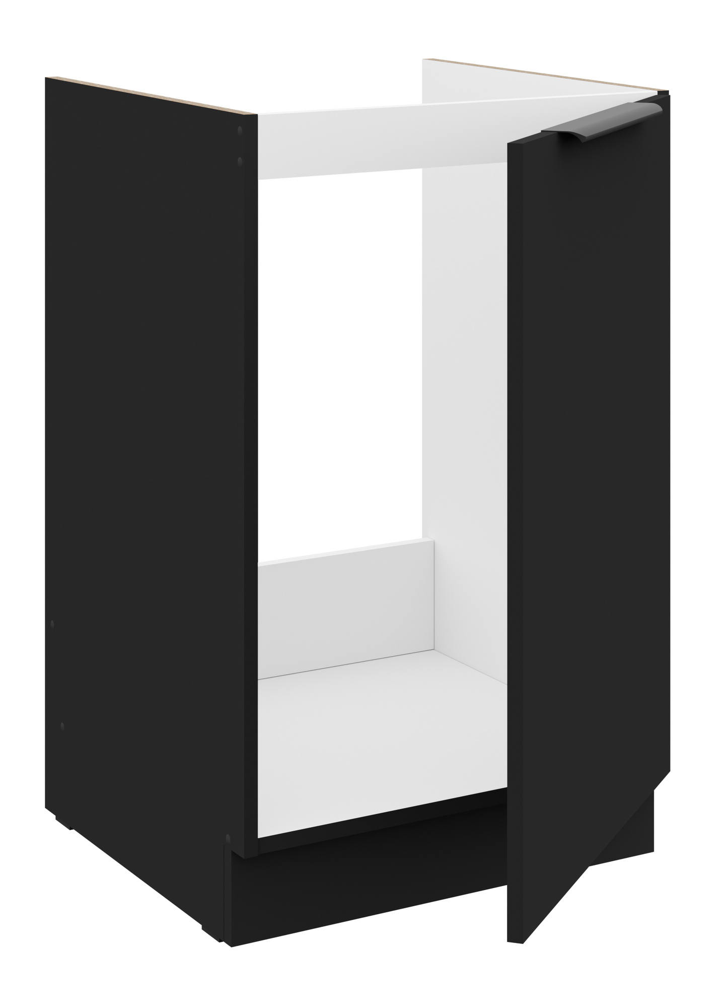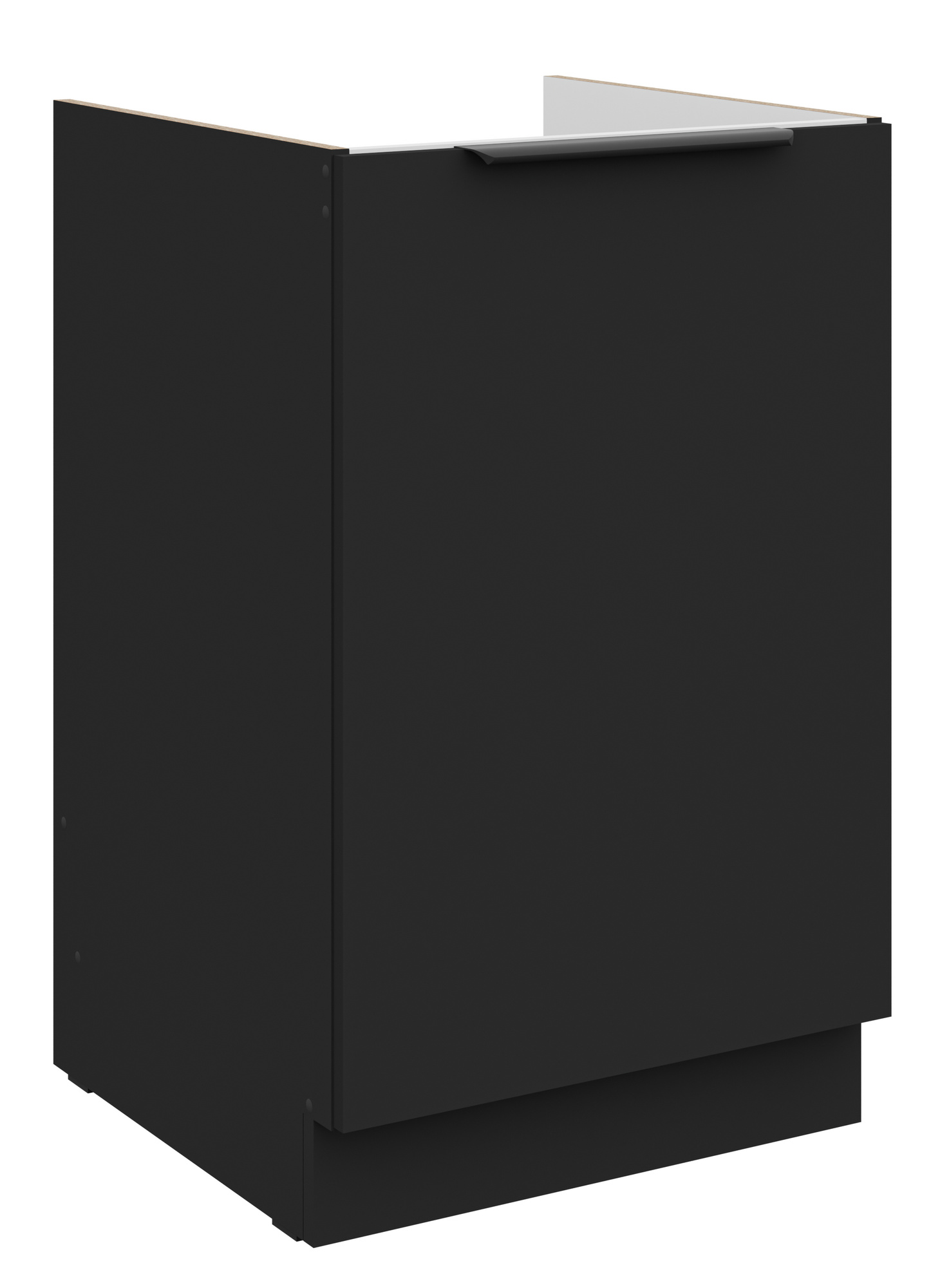 - Dvířka a čela šuplíků jsou vyrobeny z LTD desky výšky 16 mm v barvě Černá mat