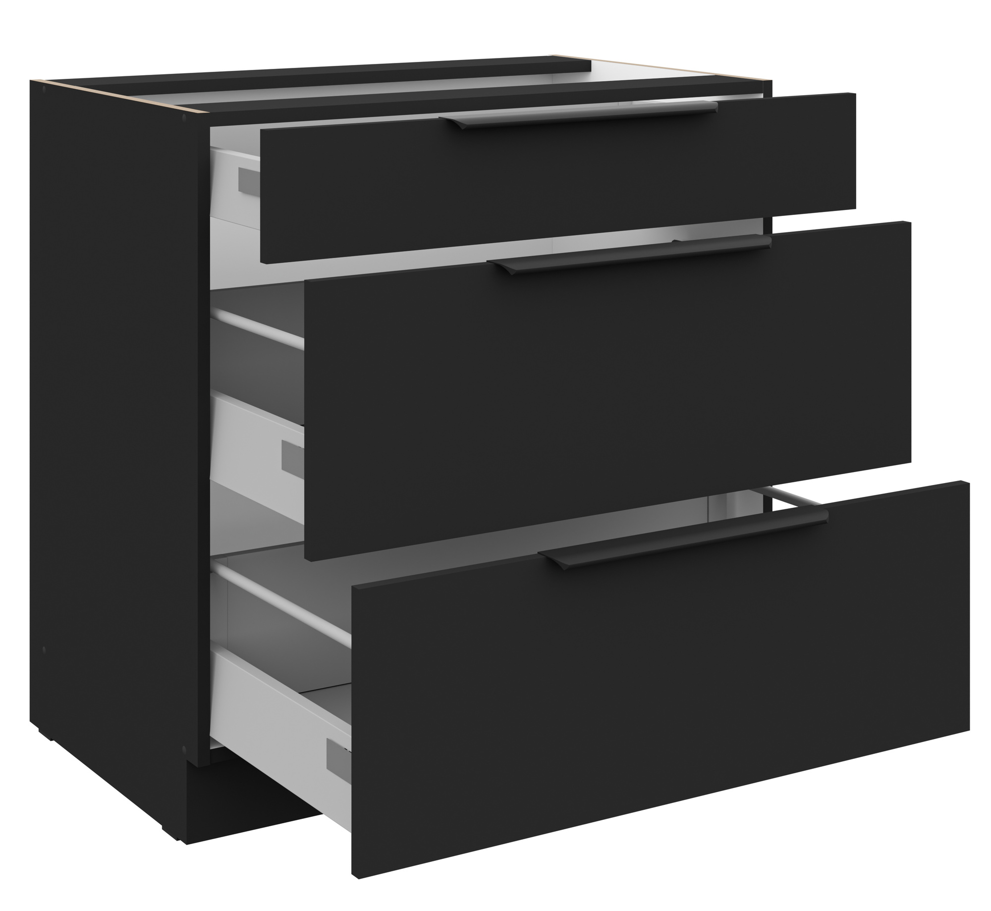 - Dvířka a čela šuplíků jsou vyrobeny z LTD desky výšky 16 mm v barvě Černá mat