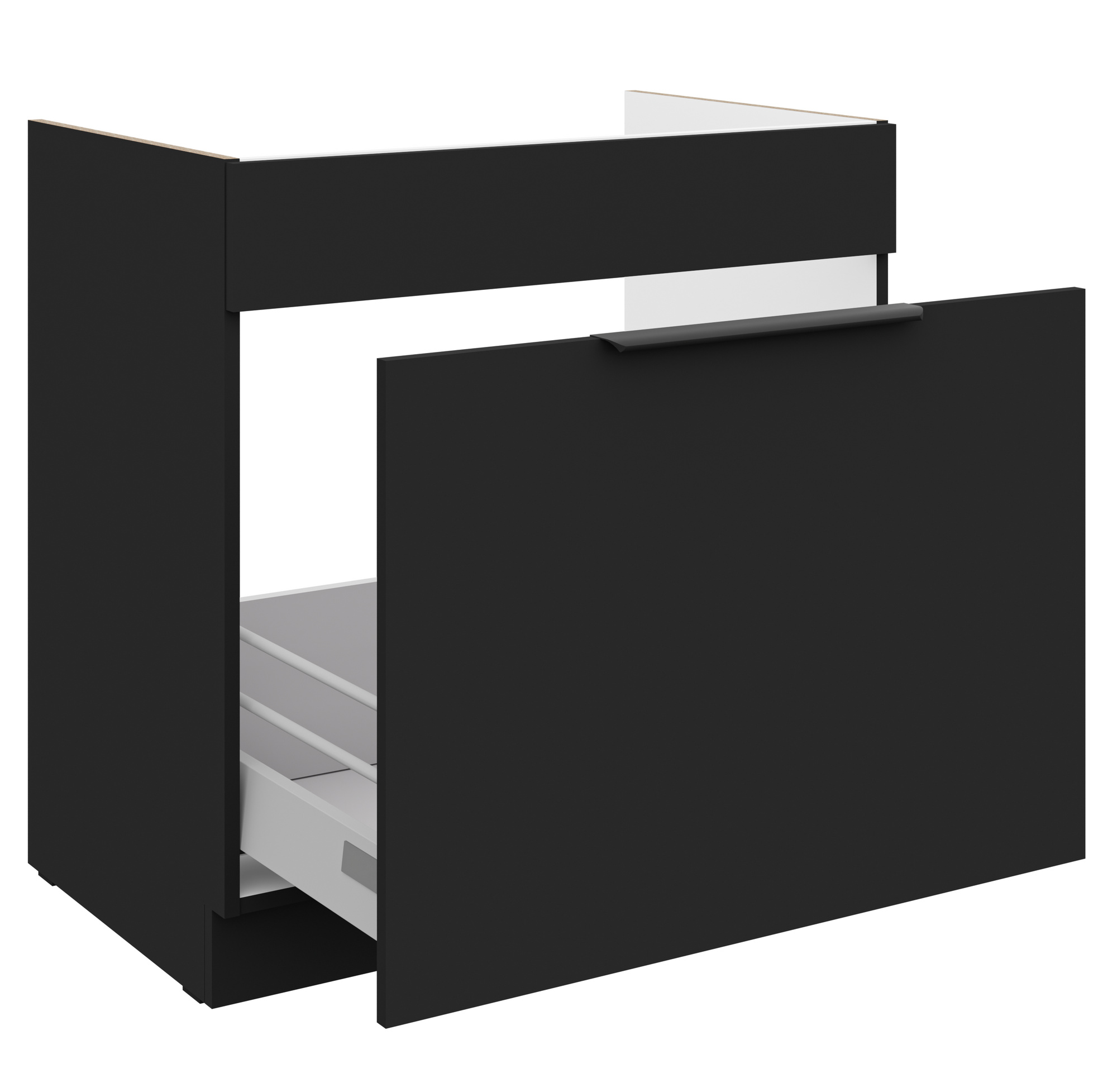 - Dvířka a čela šuplíků jsou vyrobeny z LTD desky výšky 16 mm v barvě Černá mat