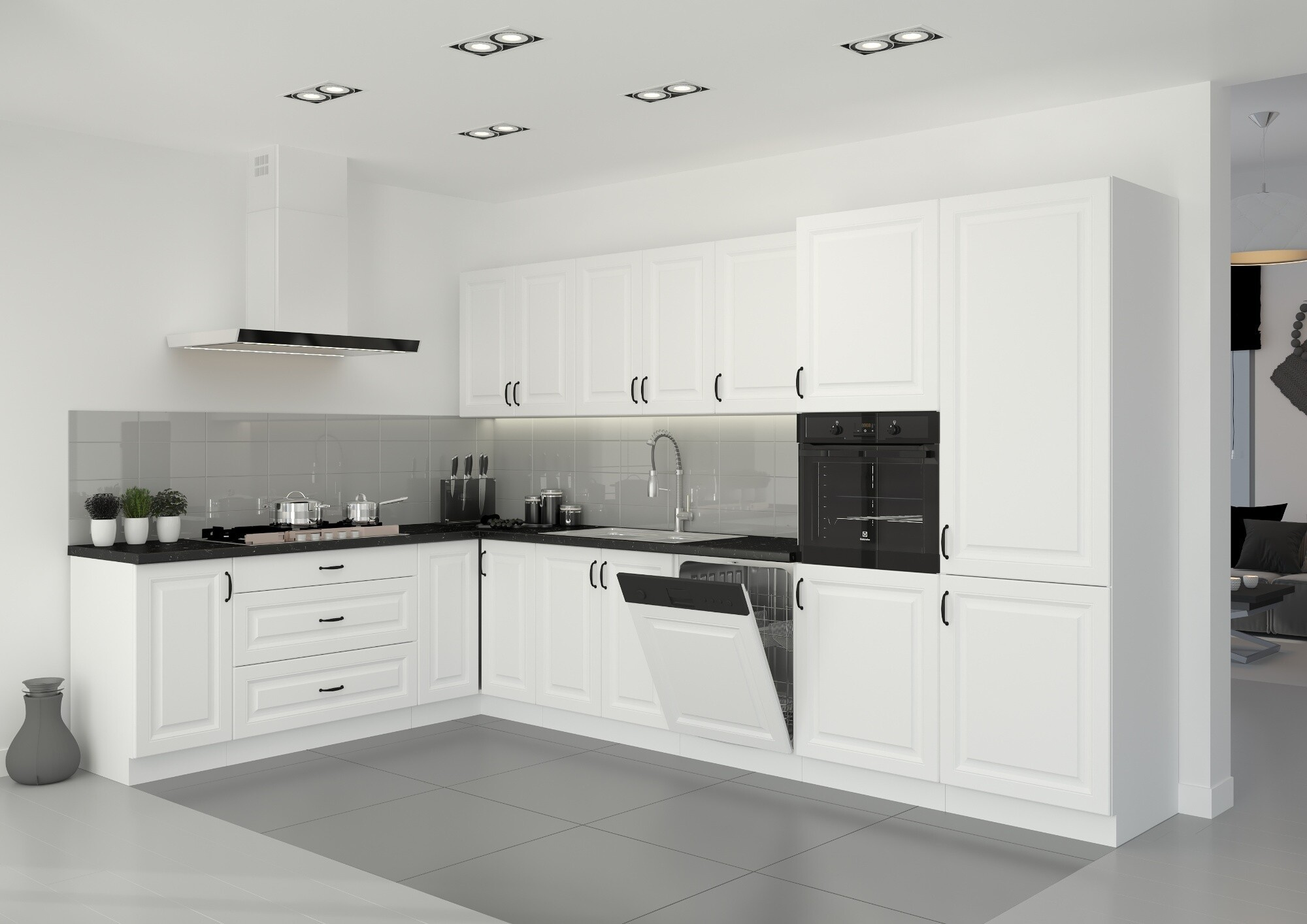 - Dvířka a čela šuplíků jsou vyrobeny z LTD desky výšky 16 mm v barvě Bílé