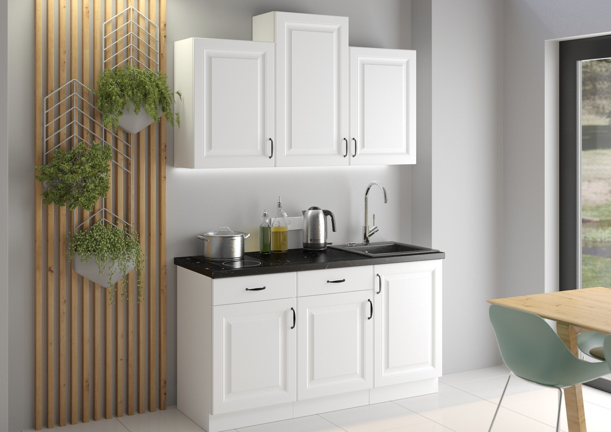 - Dvířka a čela šuplíků jsou vyrobeny z LTD desky výšky 16 mm v barvě Bílé