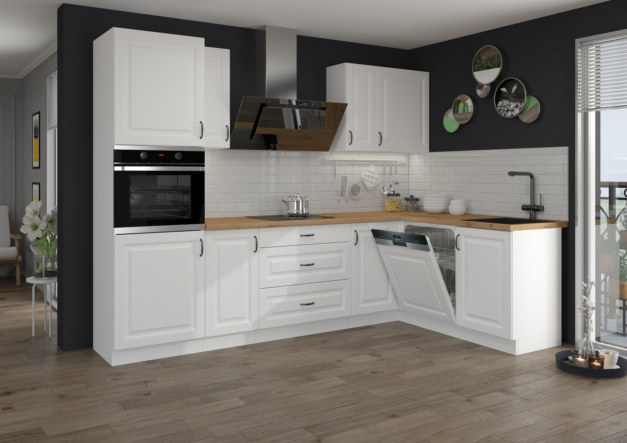 - Dvířka a čela šuplíků jsou vyrobeny z LTD desky výšky 16 mm v barvě Bílé
