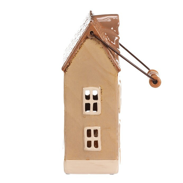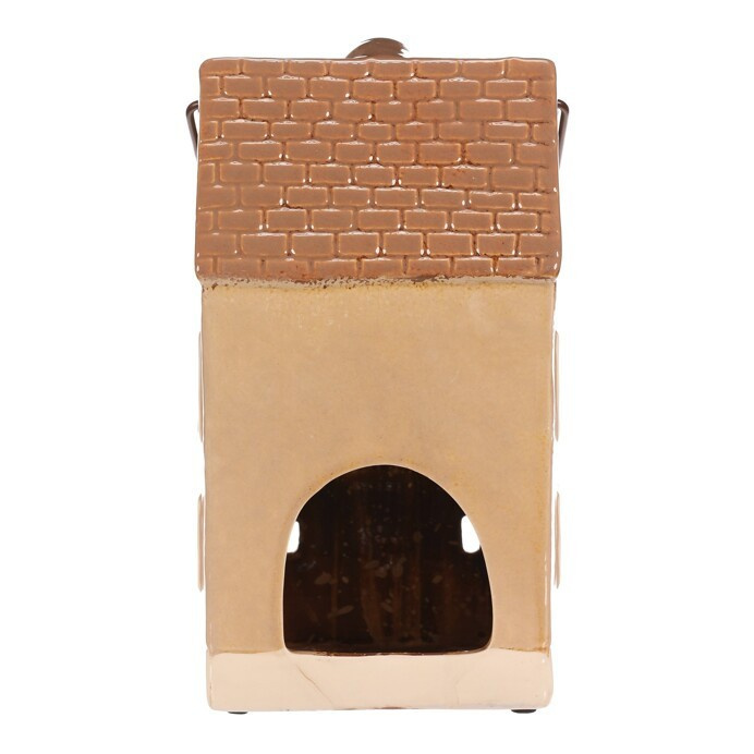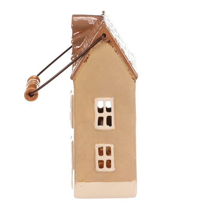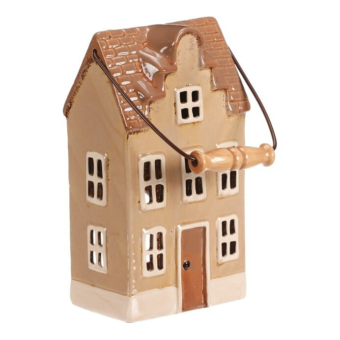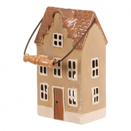 Keramický patrový domek se světle hnědou fasádou a béžovou stříškou je skvělou dekorací na dlouhé podzimní a zimní večery. Je v něm prostor pro čajovou svíčku, což umožňuje vytvářet kouzelnou atmosféru, díky paprskům pronikajícím ven skrze všechna okénka. Ideální dekorace pro příjemné zútulnění domova.