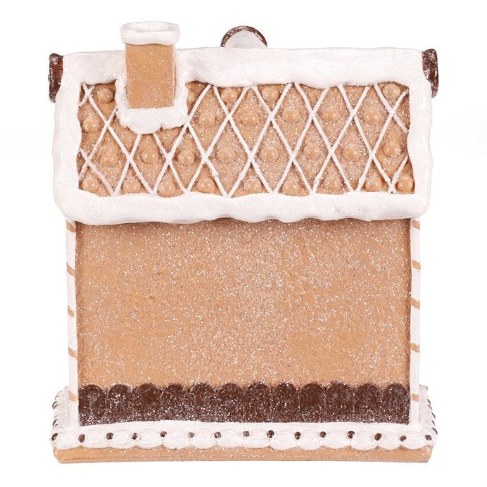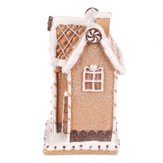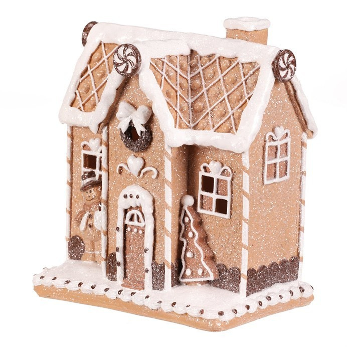 Perníkový domek s panáčkem z polyresinu, vybavený LED osvětlením, je vánoční dekorace, která přinese do vašeho domova kouzlo zimní pohádky. Hnědo-bílá kombinace a jemné detaily po rozsvícení vytvoří teplý a magický světelný efekt, který oživí vaše sváteční aranžmá.