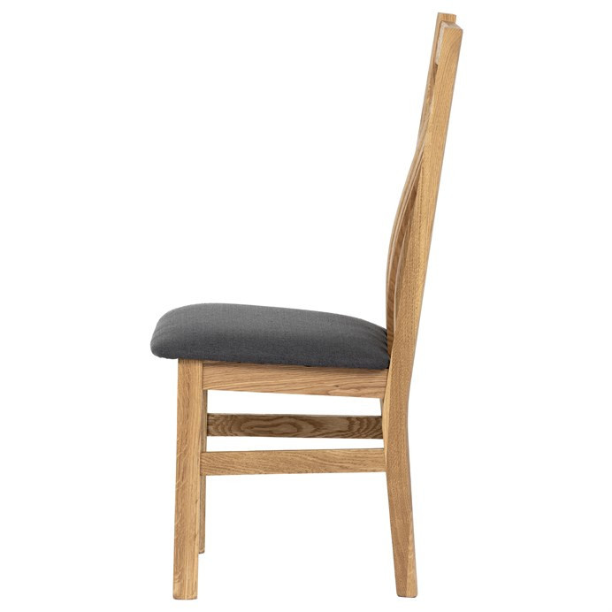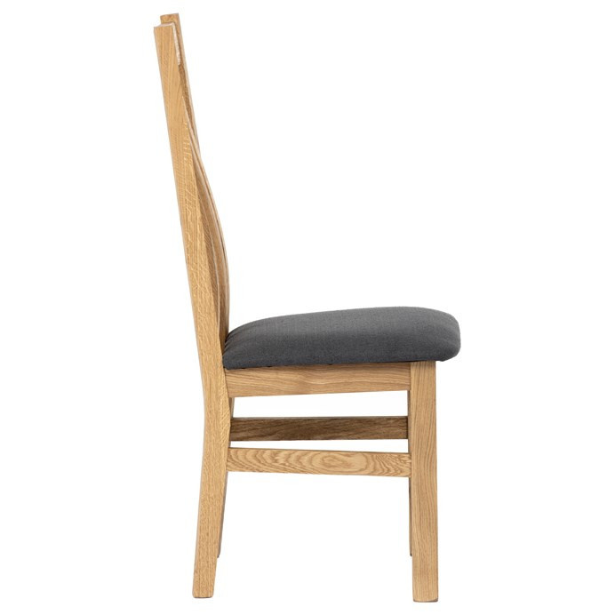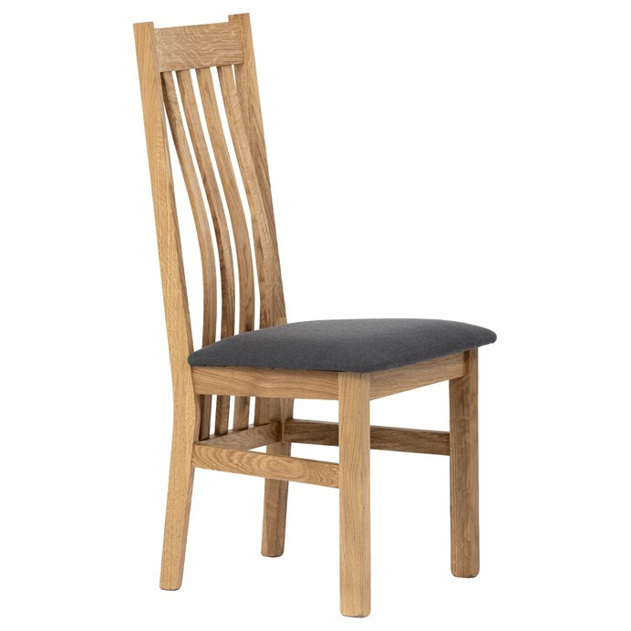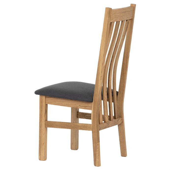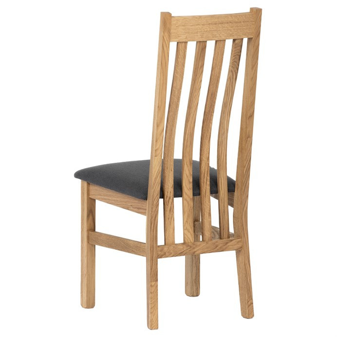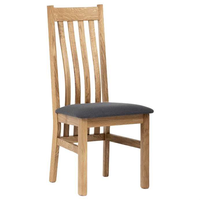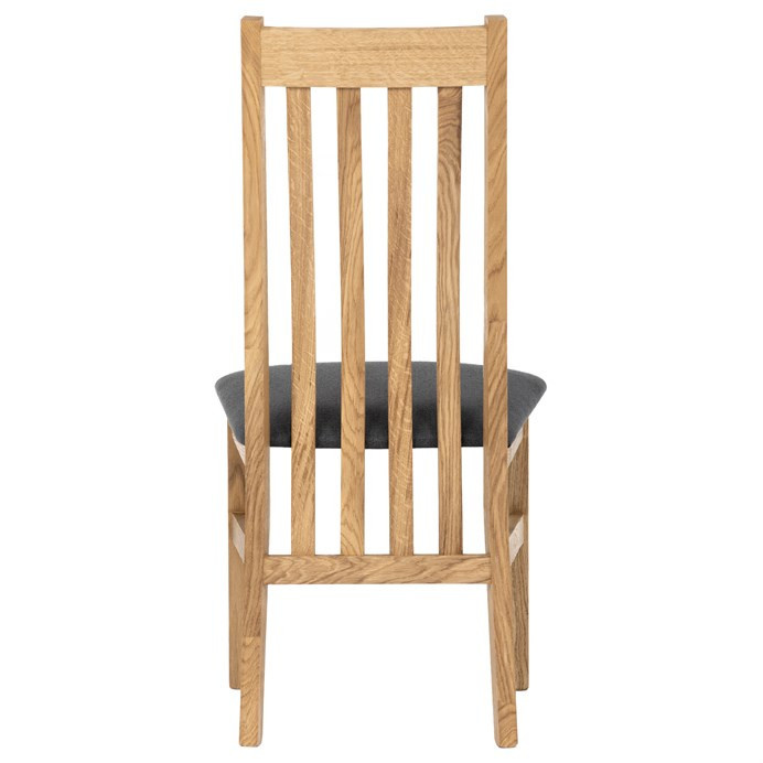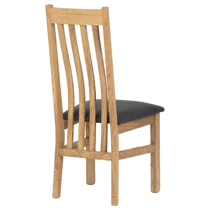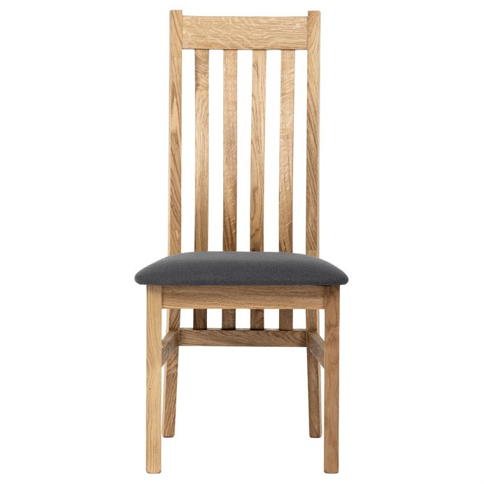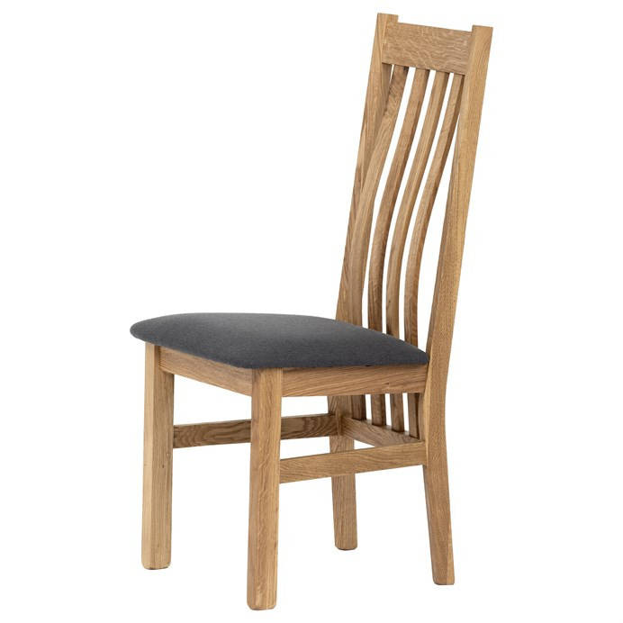Jídelní židle s vysokým opěrákem je vyrobena z masivního dubového dřeva, které zajišťuje pevnost a stabilitu. Opěrák je ergonomicky tvarovaný svislými lamelami, které podporují správné držení těla při sezení. Sedák je čalouněný šedou látkou, která nabízí příjemný povrch a snadnou údržbu. Masivní nohy doplňují robustní konstrukci, jež je navržena pro dlouhou životnost. Židle nemá područky ani otočný mechanismus, což ji činí vhodnou pro klasické jídelní prostory s důrazem na jednoduchost a funkčnost.