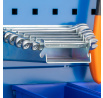 Držák na ploché klíče Praktický držák na ploché a očkoploché klíče vám umožní je uložit bez nepořádku a zbytečného hledání. Můžeš zavěsit poličku na libovolné místo na stěně a mít klíče po ruce pokaždé, když je potřebuješ. Držák je velmi odolný a vykazuje odolnost vůči korozi, protože je vyroben z pozinkované oceli. Může být použit na perforovaných površích stěn dílenských BRUNO, DAREK a SZYMON. * Uvedené rozměry se mohou nepatrně lišit (1-3 mm), což však nemá vliv na používání.* Držák neobsahuje doplňkové vybavení viditelné na fotografiích.