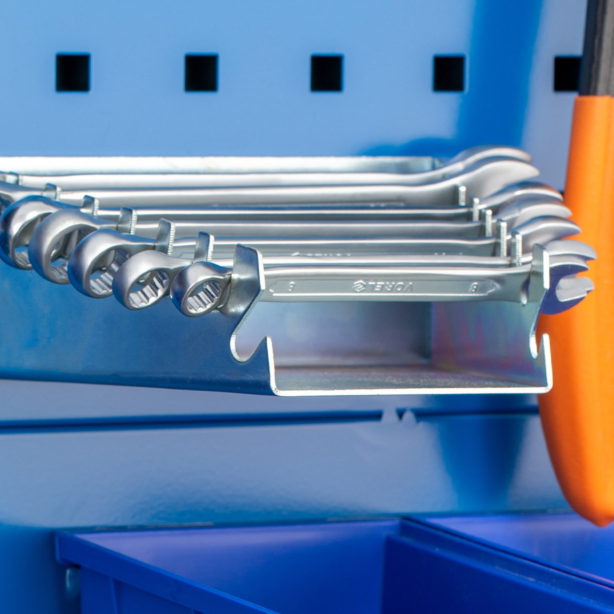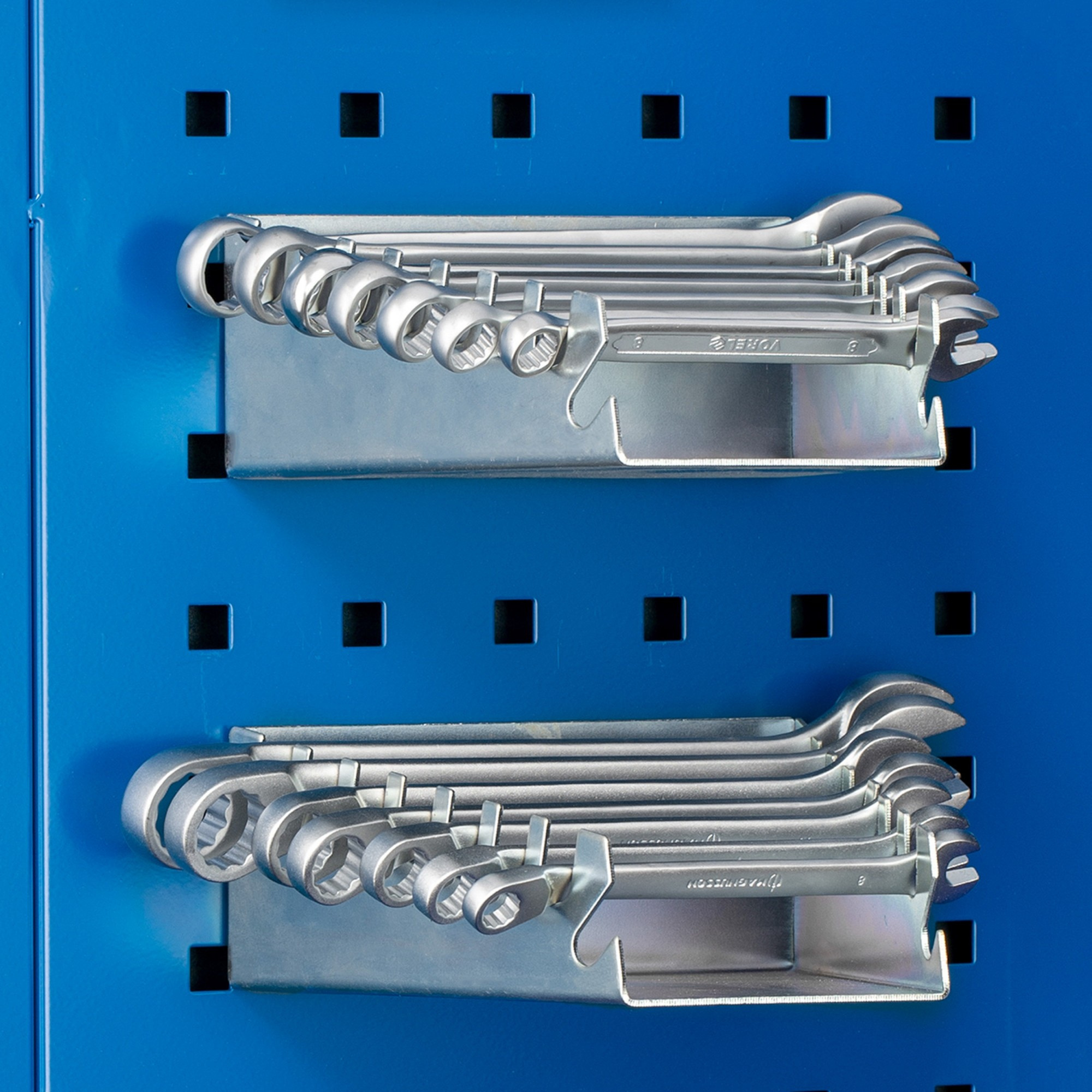Držák na ploché klíče Praktický držák na ploché a očkoploché klíče vám umožní je uložit bez nepořádku a zbytečného hledání. Můžeš zavěsit poličku na libovolné místo na stěně a mít klíče po ruce pokaždé, když je potřebuješ. Držák je velmi odolný a vykazuje odolnost vůči korozi, protože je vyroben z pozinkované oceli. Může být použit na perforovaných površích stěn dílenských BRUNO, DAREK a SZYMON. * Uvedené rozměry se mohou nepatrně lišit (1-3 mm), což však nemá vliv na používání.* Držák neobsahuje doplňkové vybavení viditelné na fotografiích.