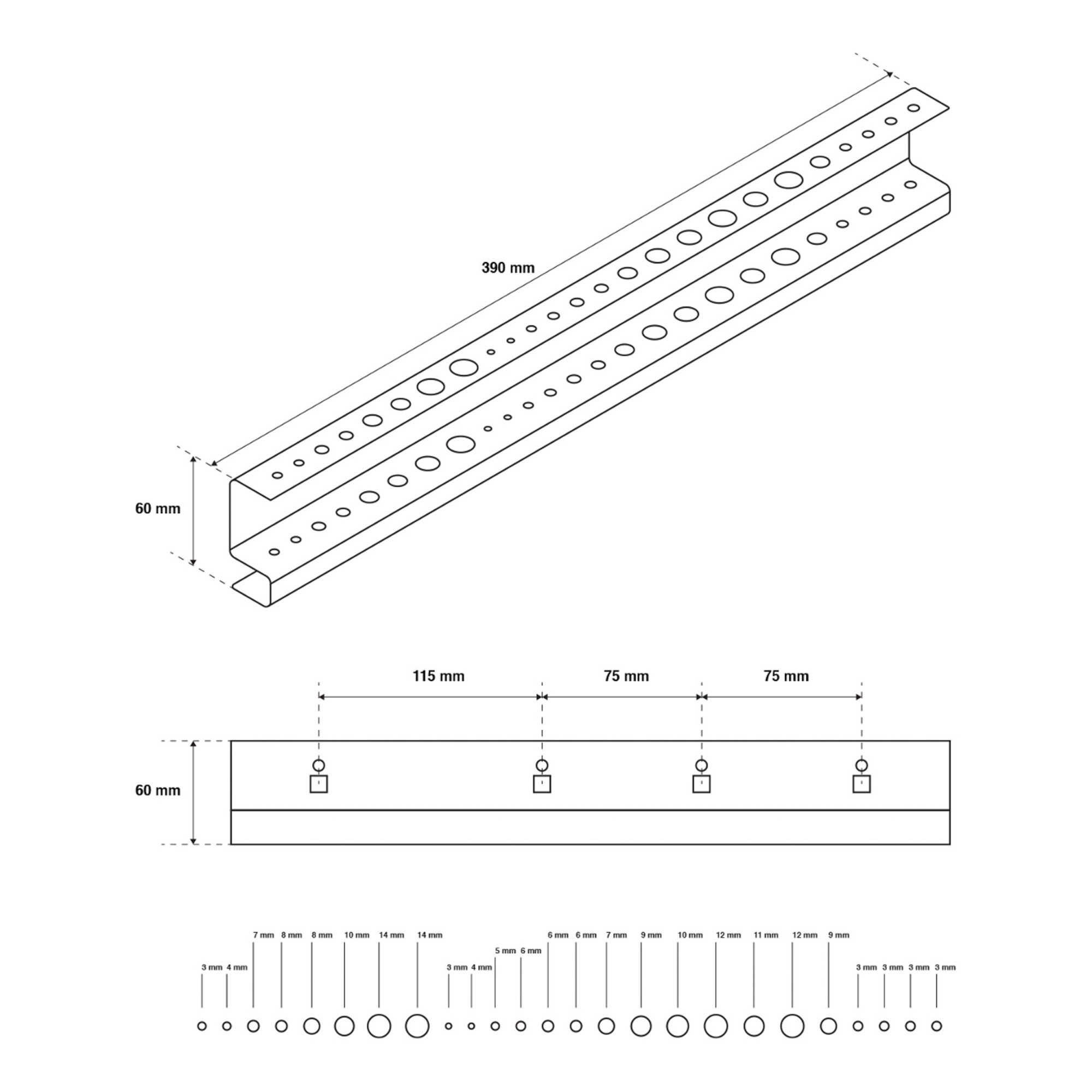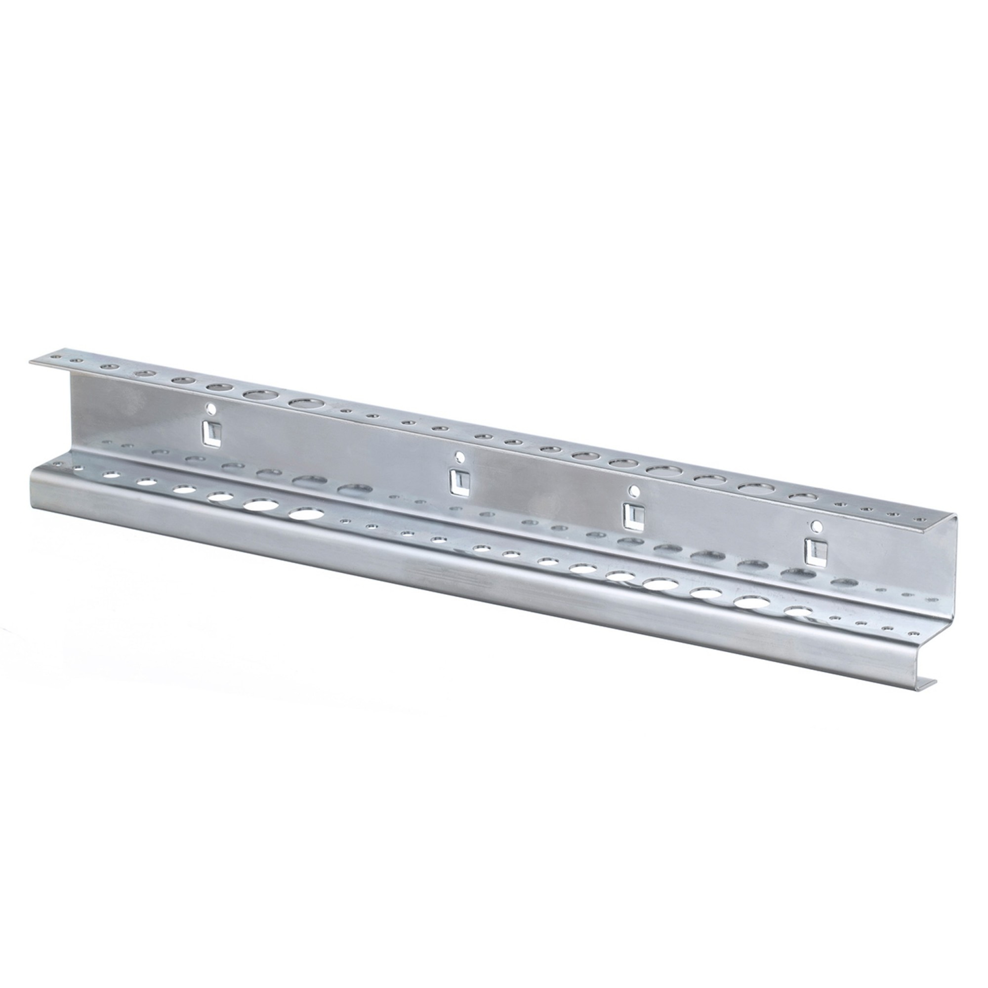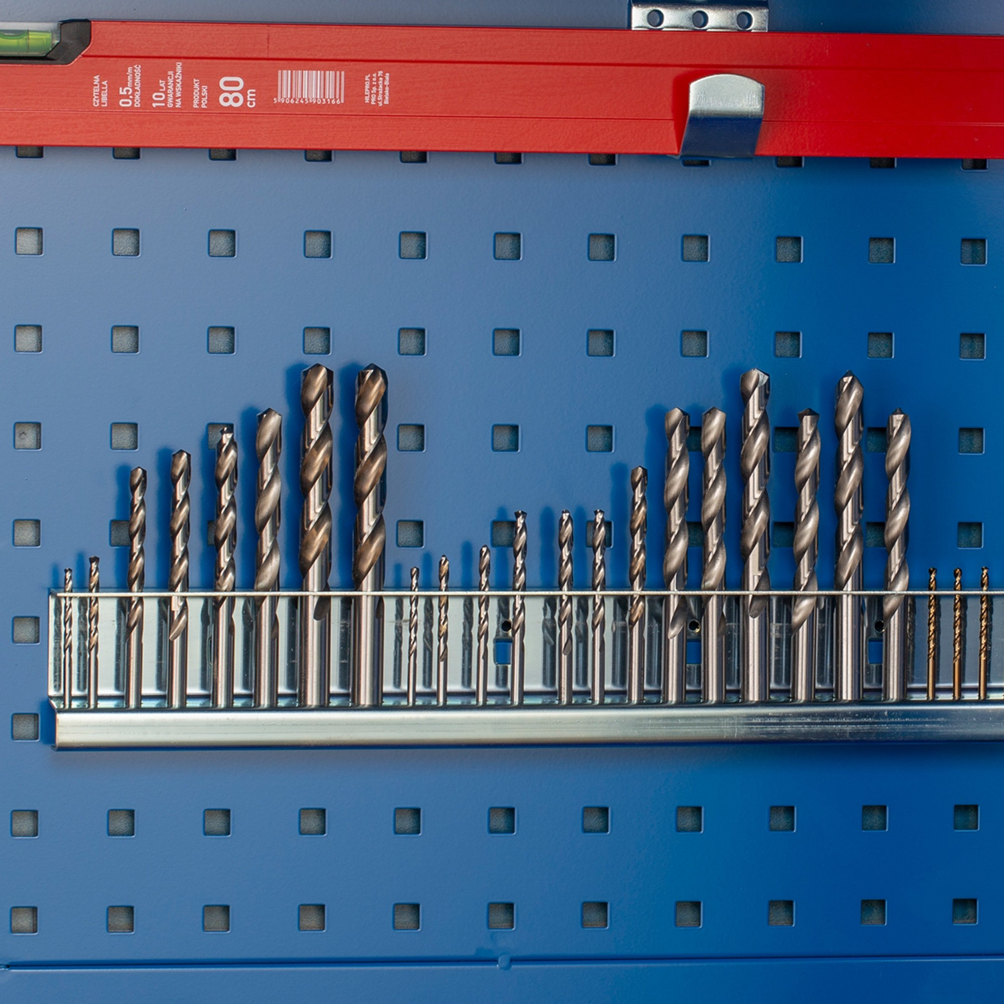 Držák na vrtáky S tímto praktickým držákem se ukládání vrtáků nebo příslušenství podobného tvaru stane praktickým jako nikdy předtím. Může být zavěšen na libovolném místě perforované stěny v dílenských skříních BRUNO, DAREK a SZYMON. Umožňuje přizpůsobit interiér nábytku vlastním potřebám a zajistí, že udržování pořádku na pracovišti bude mimořádně snadné a pohodlné. Držák je vyroben z pozinkované oceli, takže je odolný a odolný vůči korozi. * Uvedené rozměry se mohou nepatrně lišit (1-3 mm), což však nemá vliv na používání.* Držák neobsahuje doplňkové vybavení viditelné na fotografiích.