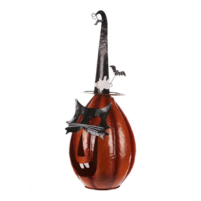 Oranžová kovová dýně se špičatým kloboukem a v kočičí masce sice vypadá strašidelně, ale její veselý výraz napoví, že to s tou hrůzou nebude tak zlé. Ideální dekorace na Halloween i podzimní večery, která potěší každého, kdo má rád trochu tajemna s úsměvem.