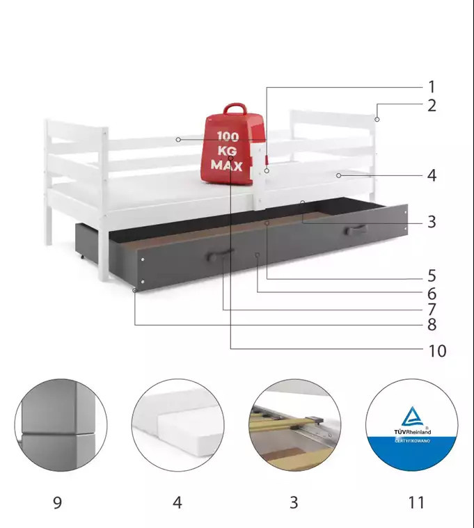 Dětská postel ERYK 90x200 cm se šuplíkem, s matrací, Bílá/Grafit