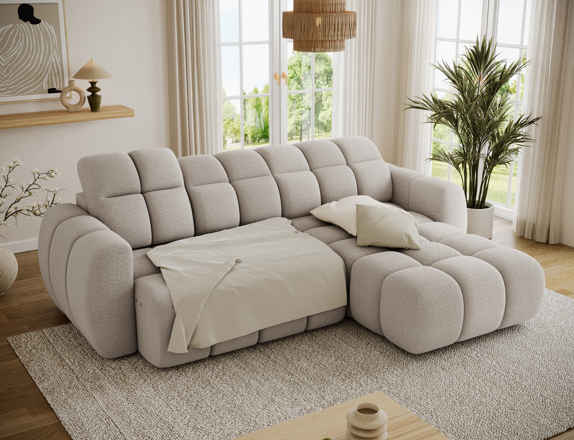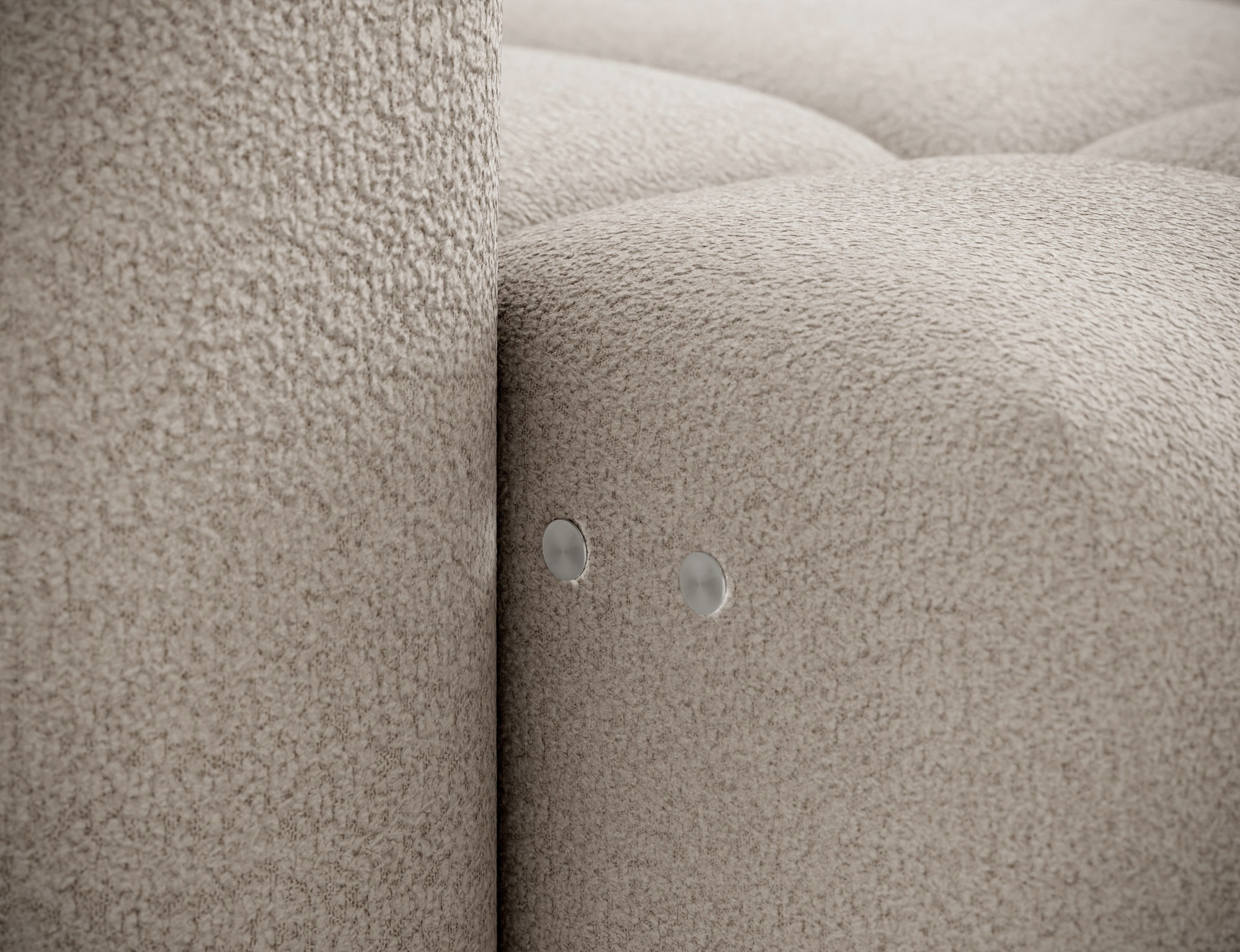 Rohová pohovka Fanito je moderní, prostorná sedací souprava ve tvaru L navržená pro obývací pokoj, která se vyznačuje svým pevným, zaobleným siluetou, hlubokým sedákem a segmentovaným prošíváním, jež zdůrazňuje její designový, ale zároveň útulný charakter—ideální pro relaxační zónu domova. Model měří 288 × 200 × 105 cm a váží 130.6 kg, zajišťující stabilitu a každodenní pohodlí. Výplň sedadla kombinuje vlnové pružiny typu B, vysoce odolnou pěnu HR3030 a 150 g/m² prošívanou výplň, což zajišťuje pružnost, pohodlí a odolnost proti prohýbání, zatímco opěradlo je vyztuženo čalounickými popruhy a profilovanou polyuretanovou pěnou T2316 pro ergonomickou oporu zad. Jako rozkládací pohovka nabízí praktickou spací plochu o rozměrech 85 × 232 × 47 cm a elektrické prodloužení sedadla (aktuátor) o 28 cm vám umožní rychle a bez námahy zvětšit plochu pro odpočinek. Navíc mechanismus opěrky hlavy s vratnou pružinou umožňuje pohodlné nastavení podpory hlavy, což činí rohovou pohovku Fanito vynikající volbou pro každého, kdo hledá pohodlnou rozkládací sedací soupravu, která spojuje styl, funkčnost a vysokou kvalitu zpracování.