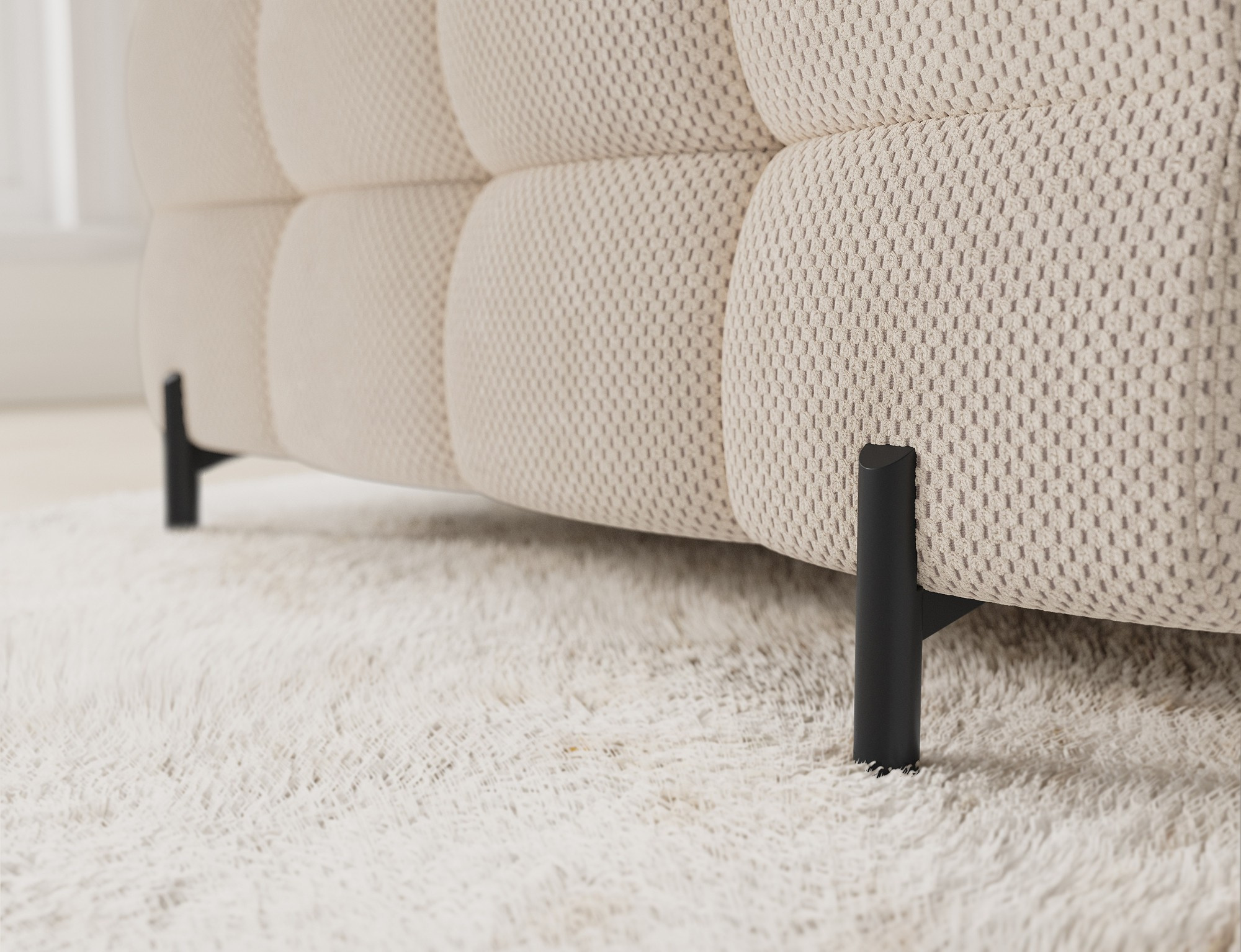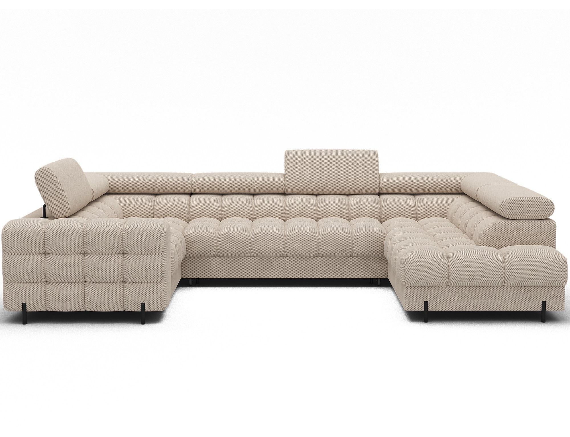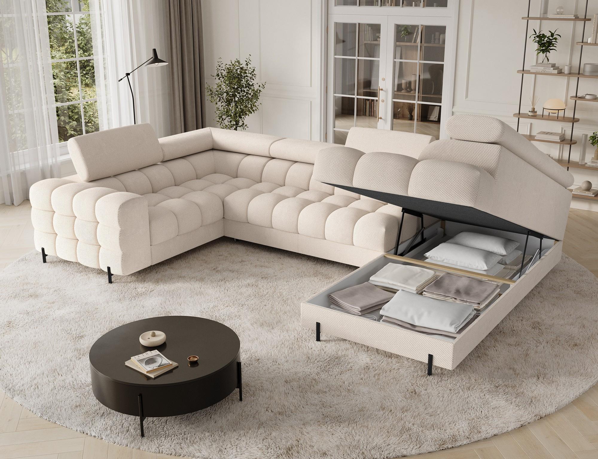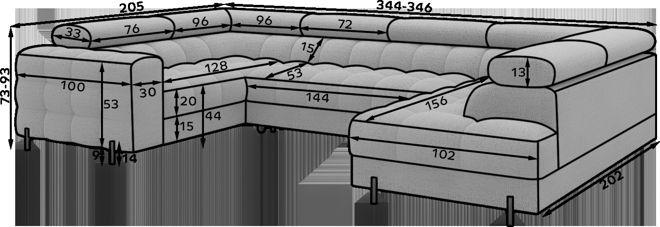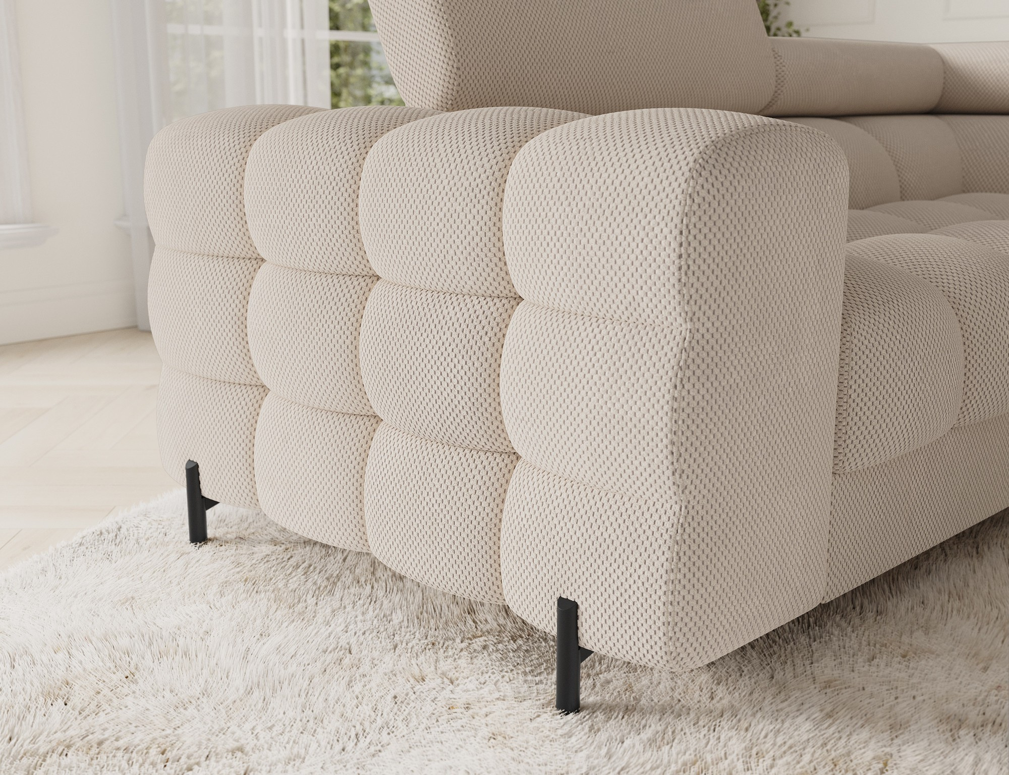 Rohová pohovka Fectory v moderním stylu, měřící 346x205x93 cm, je dokonalou kombinací funkčnosti a estetiky, vybavená vlnovými pružinami typu B a dvojitou vrstvou pěny – T3030 a profilovanou HR3030 – poskytuje vysoký komfort sezení a spaní, disponuje praktickou funkcí spaní a prostorným úložným prostorem na lůžkoviny, ideální pro každodenní použití, čalouněná záda umožňují volné umístění kdekoli v obývacím pokoji, a elegantní černé práškově lakované kovové nohy doplňují vzhled, přidávají lehkost a moderní nádech, rohová pohovka Fectory je stylovou a funkční volbou pro ty, kteří hledají velký, pohodlný kus nábytku s přidanými funkcemi.