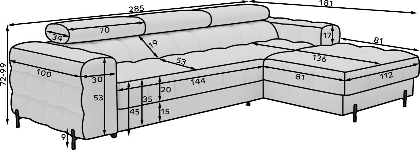 Rohová pohovka Felro je kombinací moderního designu, pohodlí a funkčnosti. Sedák pohovky je vyplněn vlnovými pružinami typu B a vysoce kvalitní pěnou T3030 a HR3030, což zajišťuje výjimečné pohodlí pro každodenní použití a relaxaci. To činí nábytek nejen měkkým a flexibilním, ale také odolným vůči deformaci, což zaručuje dlouhotrvající trvanlivost.Robustní konstrukce je podepřena kovovými nohami, které jsou opatřeny černým práškovým nástřikem, což celkovému designu dodává elegantní a moderní nádech. Felro má také funkci spaní, což z něj činí ideální volbu pro obývací pokoj, kde záleží jak na stylu, tak na praktičnosti. Mechanismus rozkládání "Dolphin" umožňuje snadnou a rychlou přeměnu pohovky na pohodlné lůžko.Další výhodou je čalouněné opěradlo, které zajišťuje, že pohovka vypadá skvěle z každého úhlu a může být umístěna buď proti zdi, nebo uprostřed místnosti. Celý design se nese v moderním stylu, díky čemuž je Felro ideální pro současné interiéry, přičemž přidává jak eleganci, tak funkčnost.