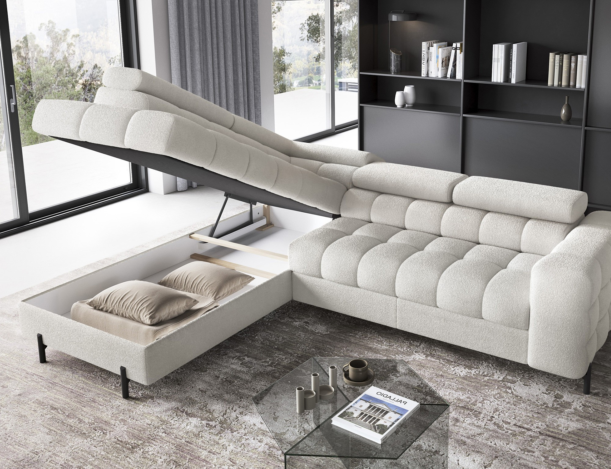 Ferucce je vybavena praktickým úložným prostorem, který vám umožní snadno uskladnit deky, polštáře nebo jiné předměty, které chcete mít po ruce, ale zároveň je mít úhledně uklizené. Tento úložný prostor je nenápadně integrován do designu soupravy, takže nenarušuje její elegantní vzhled.