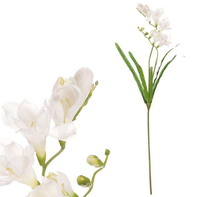 Umělá řezaná frézie s krémově zbarvenými květy představuje věrohodnou kopii živé varianty v její nejkrásnější podobě. Tato trvanlivá květina nikdy neuvadne a přinese příjemné oživení do prostoru, a to po celý rok. S jejím vzhledem představujícím rostlinu v plném květu, je ideálním prvkem výzdoby, buď pro vaše osobní potěšení nebo jako svěží doplněk na různé oslavy a společenské události. Užívejte si nepřetržitou krásu umělé květiny bez starostí a péče o ni a využijte nesporných výhod, které nabízí.