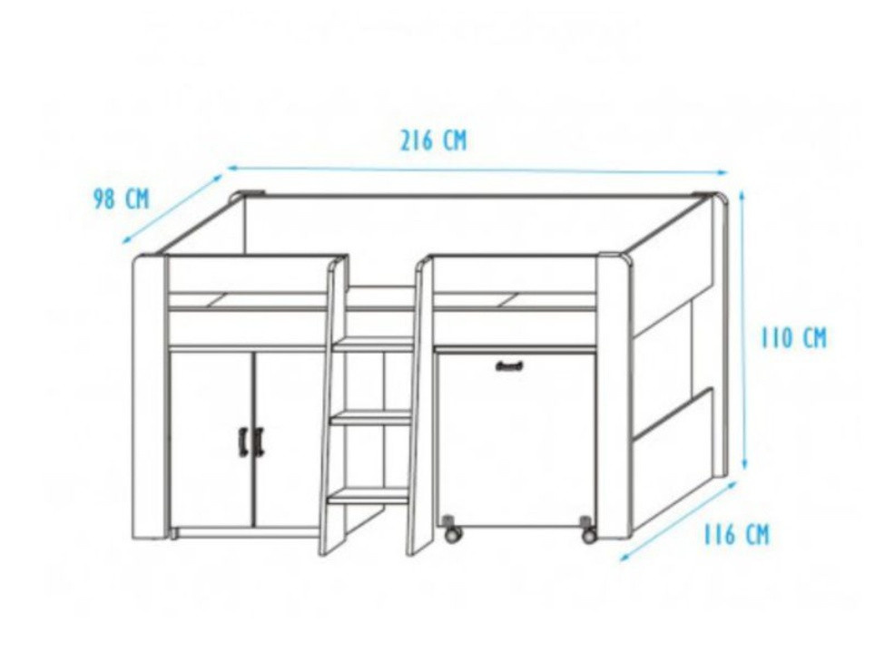 Komplet obsahuje patrovou postel, schůdky, skříňku a psací stůl.