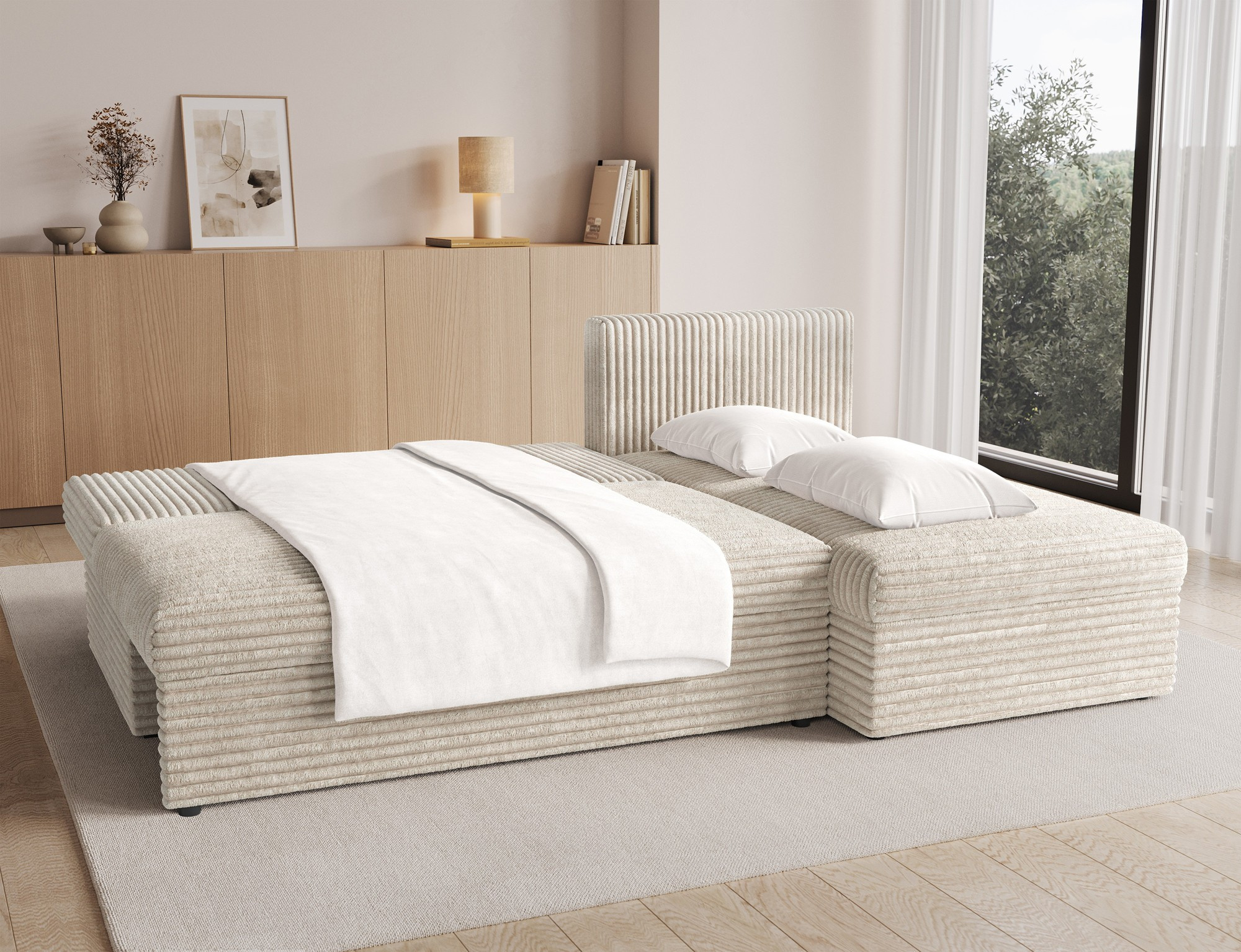 Tato sedací souprava je nejen krásná, ale také velmi praktická. Díky úložnému prostoru můžete snadno uschovat deky, polštáře nebo jiné předměty, které chcete mít po ruce, ale zároveň je mít úhledně uklizené. Souprava je vybavena funkcí rozkládání, což z ní činí ideální volbu pro hosty nebo pro ty, kteří si rádi dopřejí pohodlný odpočinek. Po rozložení nabízí plochu na spaní o rozměrech 124 x 201 cm, což poskytuje dostatek prostoru pro pohodlný spánek.