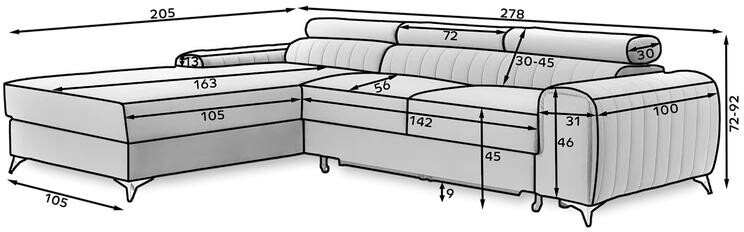 Sedací souprava GRAYSON se pyšní elegantním a nadčasovým designem, který se snadno začlení do jakéhokoli interiéru. Její čisté linie a sofistikovaný vzhled z ní činí ideální volbu pro moderní i klasické domácnosti. S šířkou 278 cm, výškou 92 cm a hloubkou 205 cm nabízí dostatek prostoru pro celou rodinu i přátele.