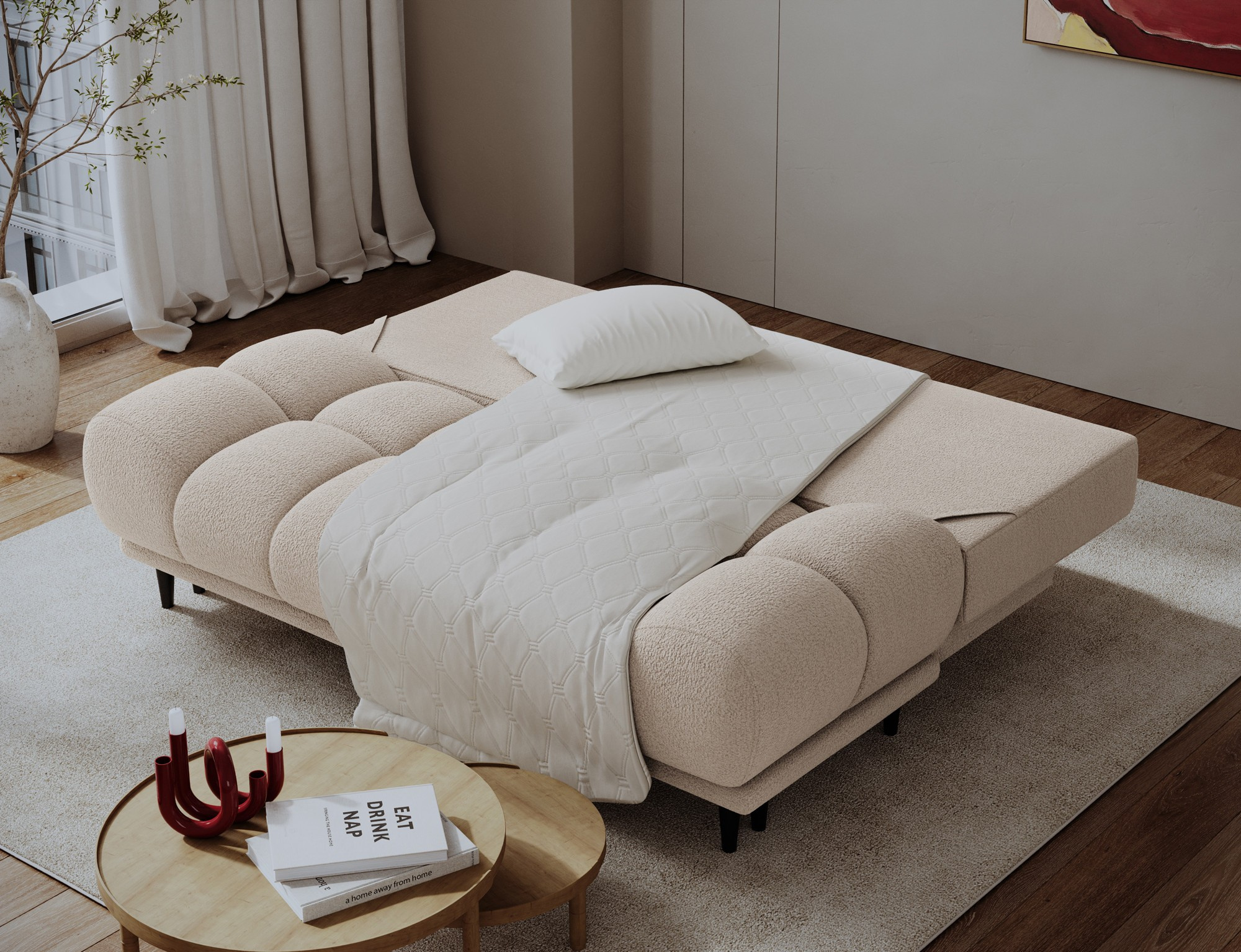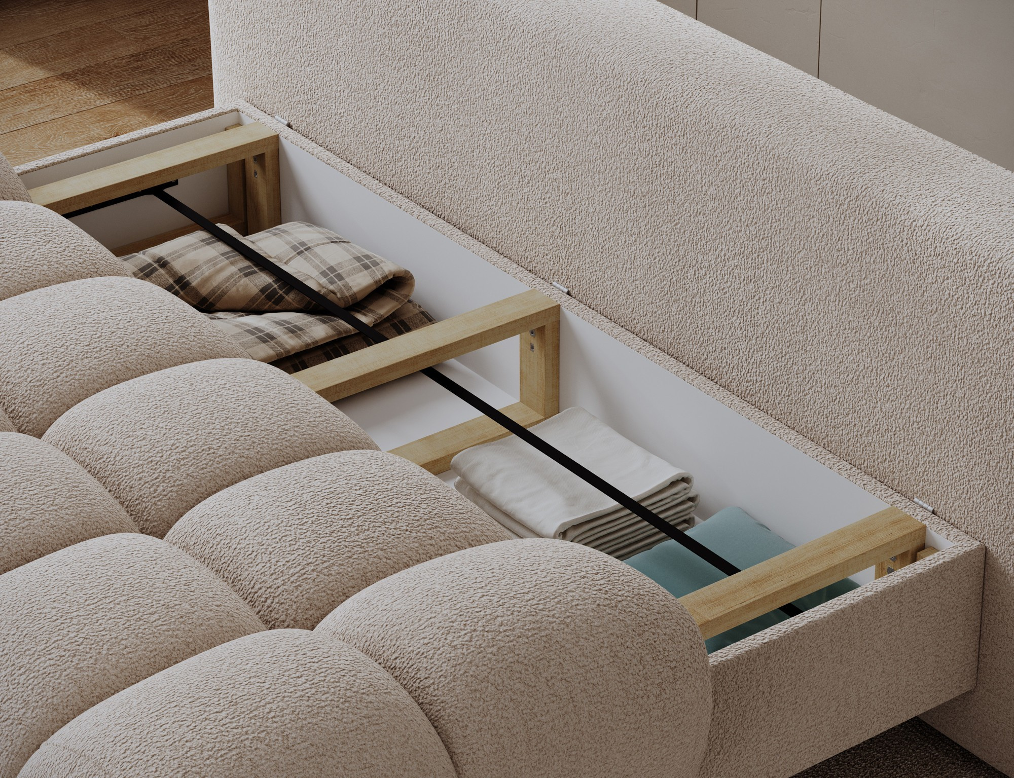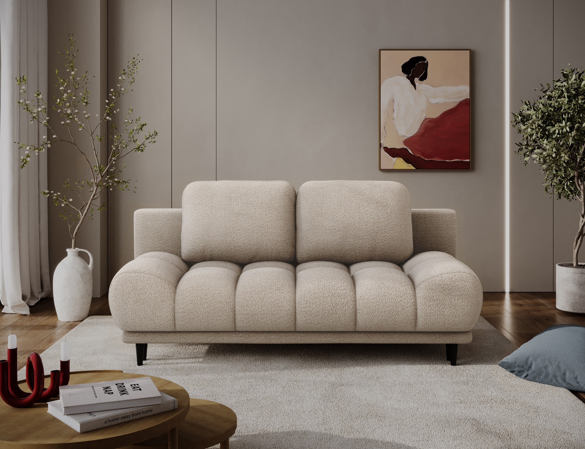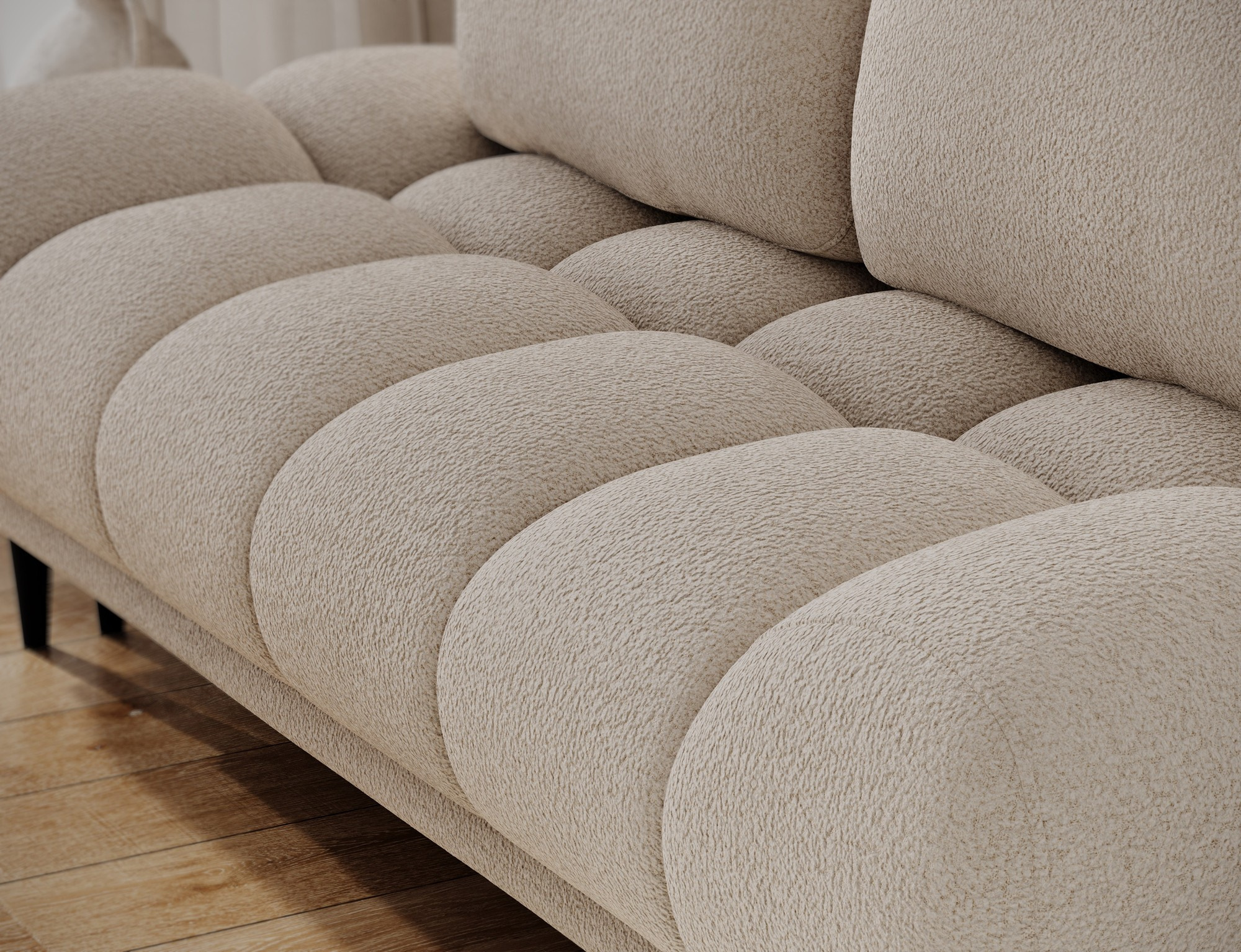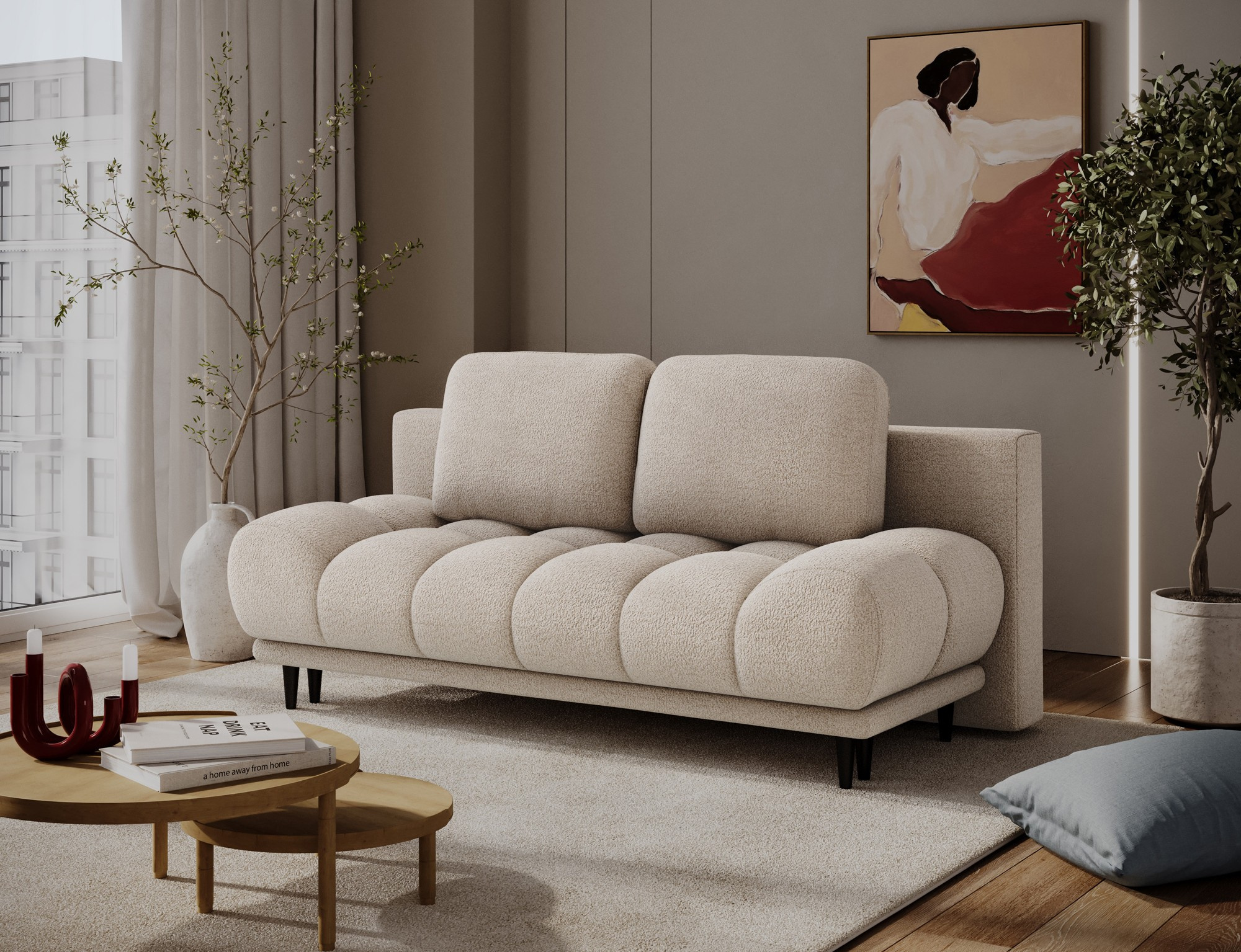 Pohovka Guavio je moderní a funkční kus nábytku navržený pro každodenní pohodlí. Jeho elegantní, zaoblený tvar a měkké polštáře dokonale doplňují moderní interiérové designy. Pohovka má rozměry 210 × 91 × 97 cm a váží 72.6 kg, zajišťující stabilní konstrukci. Sedák je vyplněn vlnovou pružinou typu B a pěnou HR3030 pro pružnost a pohodlí, zatímco opěradlo se skládá z polštářů naplněných pěnovým granulátem, který se přizpůsobuje tělu. Pohovka zahrnuje funkci spaní s plochou 140 × 210 cm a DL mechanismem s pružinou, která podporuje snadné rozložení do pohodlné postele. Další kontejner na ložní prádlo pomáhá udržovat pořádek. Guavio je dokonalou kombinací designu, praktičnosti a pohodlí, vytvořenou pro moderní interiéry.