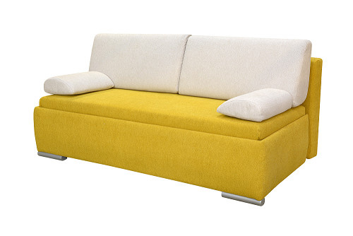GULIVER LUX (Gordia 160lux- tvarované područky) - pohovka rozkládací na denní spaní - látka pohovka hořčicová SS11/ polštáře,područky vanilkaSS02, nožky DS stříbrné- kolekce "FN" (K250)