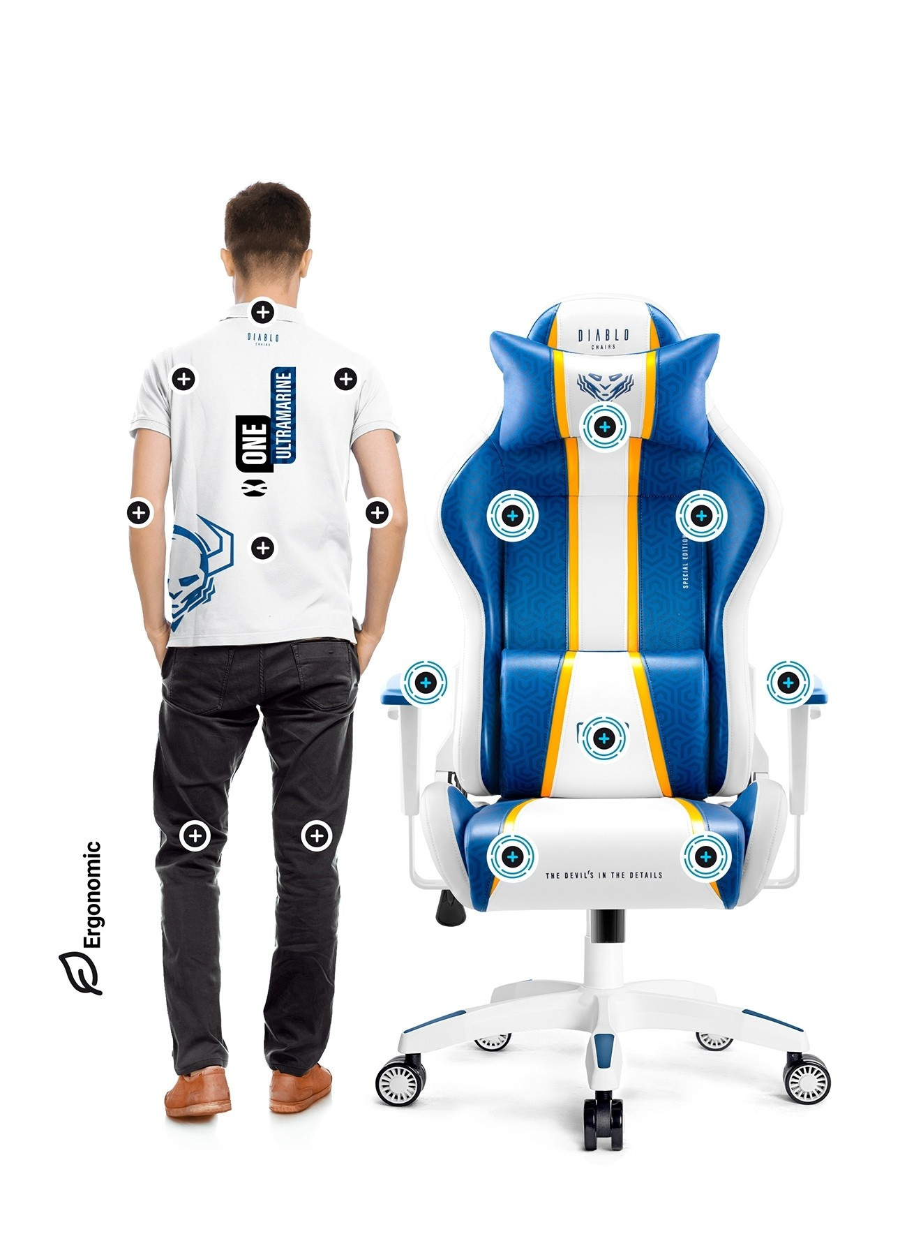 Vlastnosti: Bestsellerový model křesel Diablo Chairs Velké a pohodlné křeslo, vhodné pro vysoké hráče Tvar podporující vaši páteř Pohodlné polštáře s možností nastavení Výplň z měkké HR pěny Vysoce kvalitní, odolná ekokůže Područky nastavitelné nahoru-dolů Maximální zatížení do 160 kg VELKÉ Herní křeslo BÍLO-MODRÉ – IDEÁLNÍ ŘEŠENÍ PRO POHODLNÉ HRANÍ Bílá a modrá jsou barvy, se kterými se každé počítačové pracoviště stává originálním a jedinečným. Tak energetické, unikátní spojení je herní klasika v zcela novém provedení – ještě více výjimečném a vzrušujícím. Poznej velké bílo-modré Herní křeslo Diablo X-One 2.0 ve verzi Aqua Blue, která pozvedne tvé herní prostředí na zcela novou úroveň, zaručující spoustu dalších emocí již od prvního pohledu a během každé hry. PŘIZPŮSOBENÝ VAŠIM POTŘEBÁM Křeslo ve velikosti KING je ideální pro vysoké osoby, které potřebují větší oporu pro optimální fungování po dlouhé hodiny.Diablo X-One 2.0 KING zaručuje snadné a přesné nastavení nahoru-dolů. Díky tomu přizpůsobíš křeslo výšce a výšce stolu.Spolehlivý systém Tilttech™ Swing umožňuje bezpečné a relaxační houpání.Velké bílo-modré Herní křeslo umožňuje naklonění opěradla až do 140° a zablokování v zvolené poloze. Získáváš komfort na nejvyšší úrovni.DYNAMICKÝ A VÝRAZNÝ Uspokojivá a příjemná hra je taková, která kromě neobyčejných emocí poskytuje také komfort a bezpečí při každém pohybu. Diablo X-One 2.0 v provedení Aqua Blue tě bude provázet ve virtuálních soubojích, účinně se starat o tvé držení těla a poskytovat potřebné pohodlí.VÝJIMEČNÉ ČALOUNĚNÍ Hladké čalounění je vyrobeno z pevné a odolné ekokůže HDS™. Silné nitě jí navíc zaručují vynikající napětí, a tedy vynikající vzhled po dlouhá léta.VHODNÉ VYPLNĚNÍ Čalounění jsme podšili mimořádně měkkou a pohodlnou HR pěnou, která vyplňuje celou masivní konstrukci modelu X-One 2.0, bederní polštář a opěrku hlavy. Díky své pružnosti se pěna po mnoho let neprohne a nedeformuje, a křeslo zůstane stejně pohodlné a měkké.ERGONOMICKÁ OPĚRKA HLAVY Krční část páteře získá správné nastavení během každé hry díky ergonomické opěrce hlavy. Vyhneš se sklánění hlavy a jejímu vysouvání dopředu, a každé opření zad ti pomůže zaujmout správnou polohu. PODLOŽKA BEDERNÍ S velkým bílo-modrým herním křeslem bude dolní část vaší páteře účinně chránit tvarovaná bederní podložka. Díky ní záda při každém opření zaujmou ergonomickou polohu, což zabrání vzniku nebo prohlubování vad držení těla.PODRUČKY S NASTAVENÍM Ruce si pohodlně opřete o područky Armtech™ Vertical SoftTouch pokryté měkkou pěnou s potřebným nastavením ve svislé rovině nahoru-dolů. Odlehčení ramen, předloktí a zápěstí stabilizuje postavu a usnadní přijetí bezpečné polohy určené bederním polštářem a opěrkou hlavy.SPOLEHLIVÝ ZÁKLAD Se solidním základem a zesílenou konstrukcí získáte bezpečnou a stabilní pozici, i během houpání nebo vzrušující hry a intenzivních pohybů. Odolná kolečka PFC™ 360 se budou hladce pohybovat po každém povrchu a jejich kaučukový povlak ochrání podlahu před poškrábáním. Podívej se také na naši nabídku herních pufů, na kterých si odpočineš po náročném dni ve škole nebo v práci!
